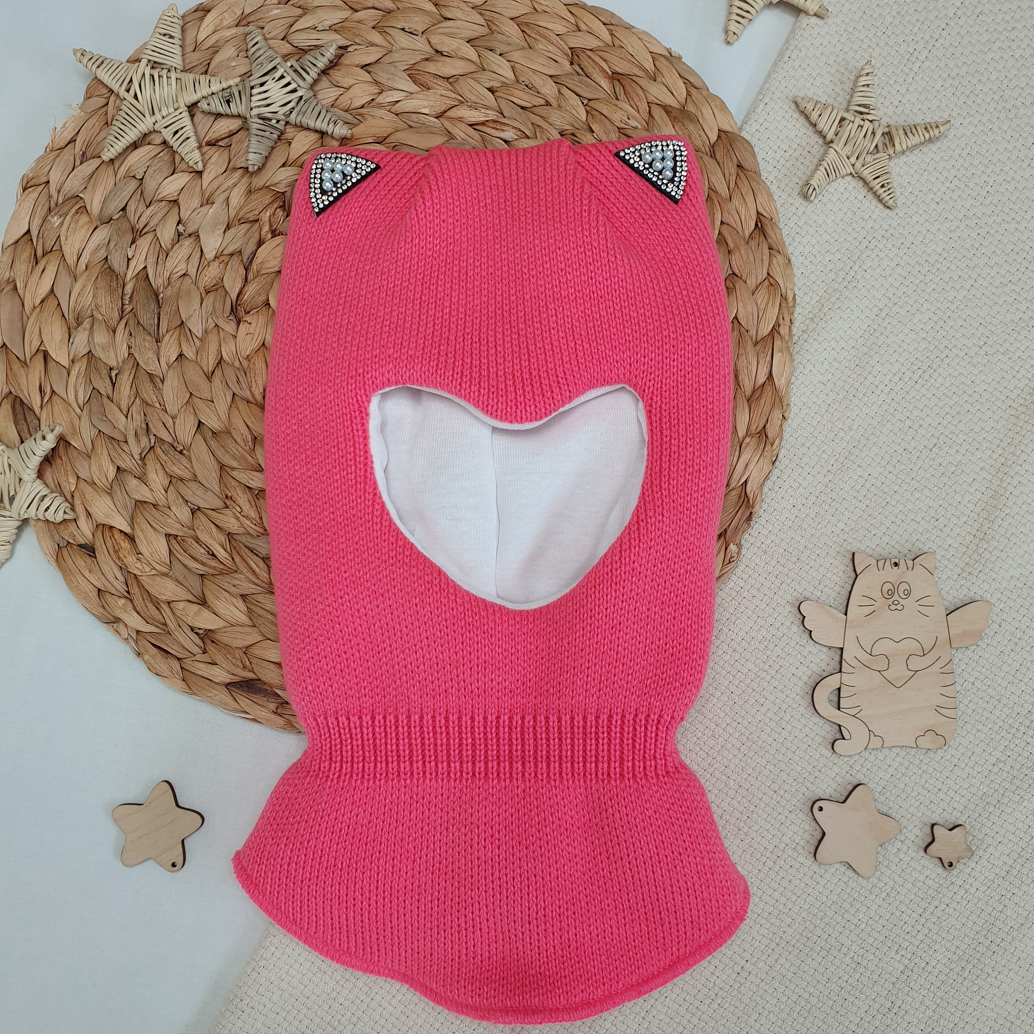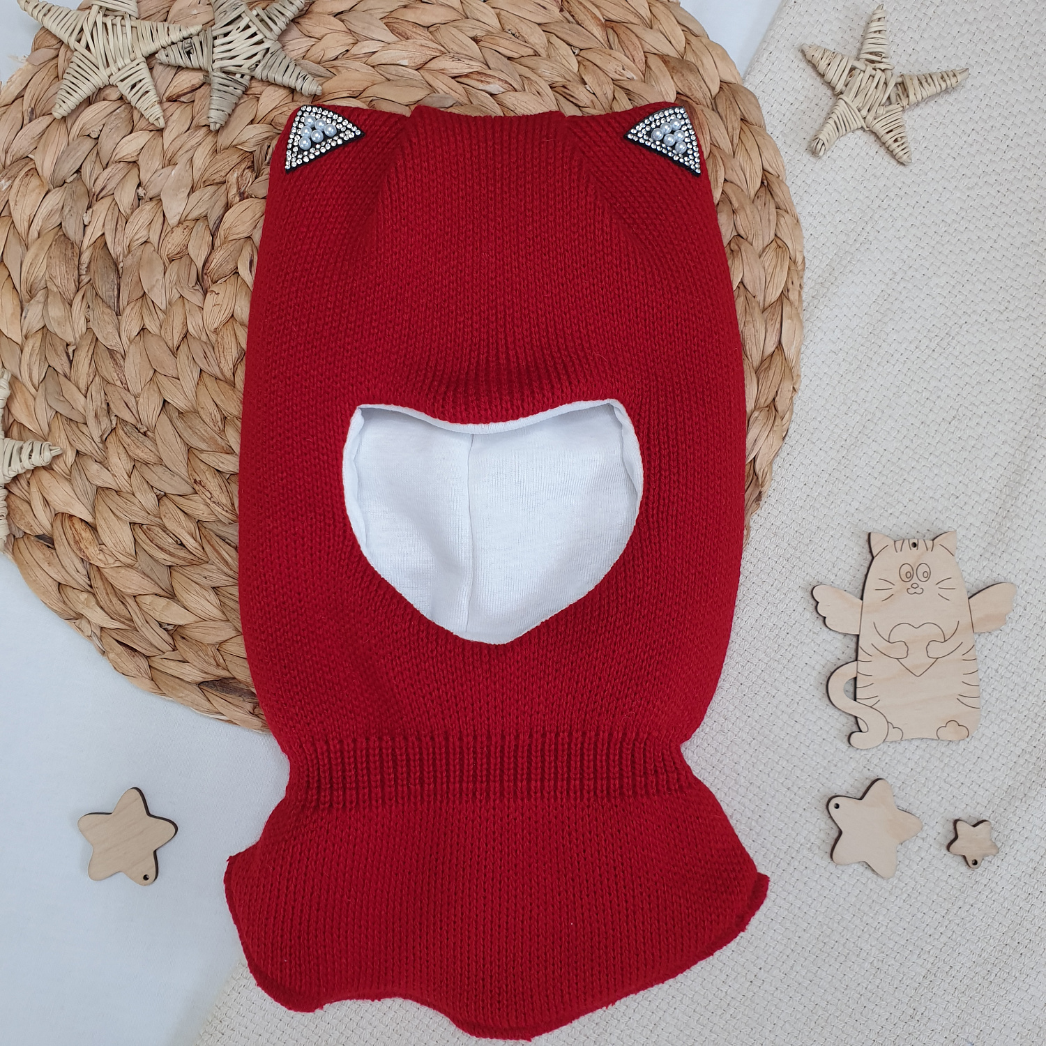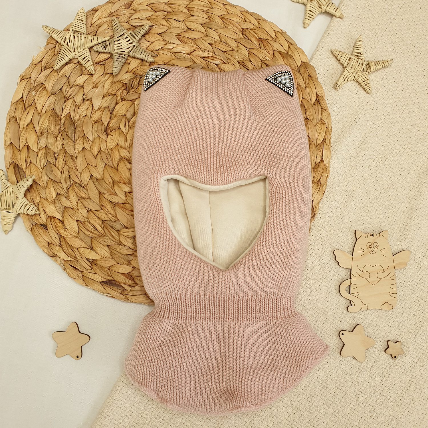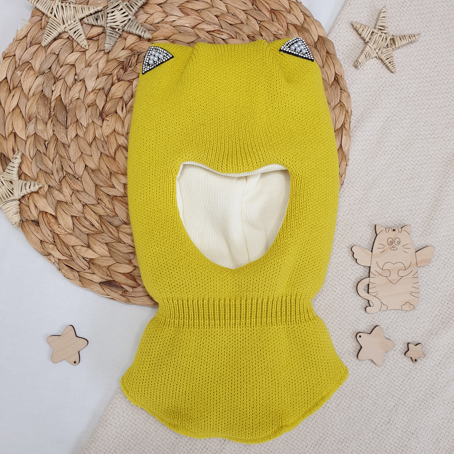 Однотонная вязка дополнена декоративным элементом и стразами на ушках.