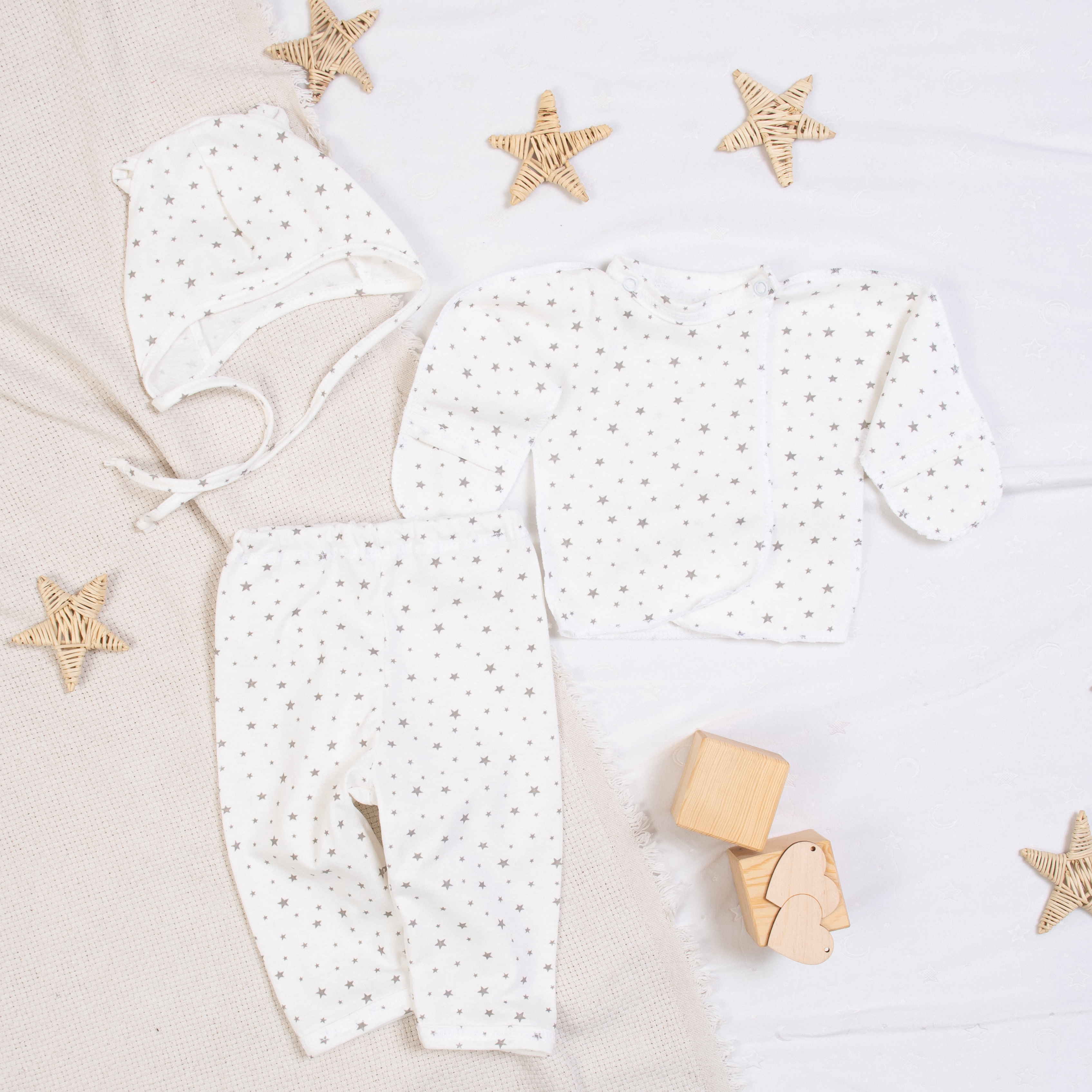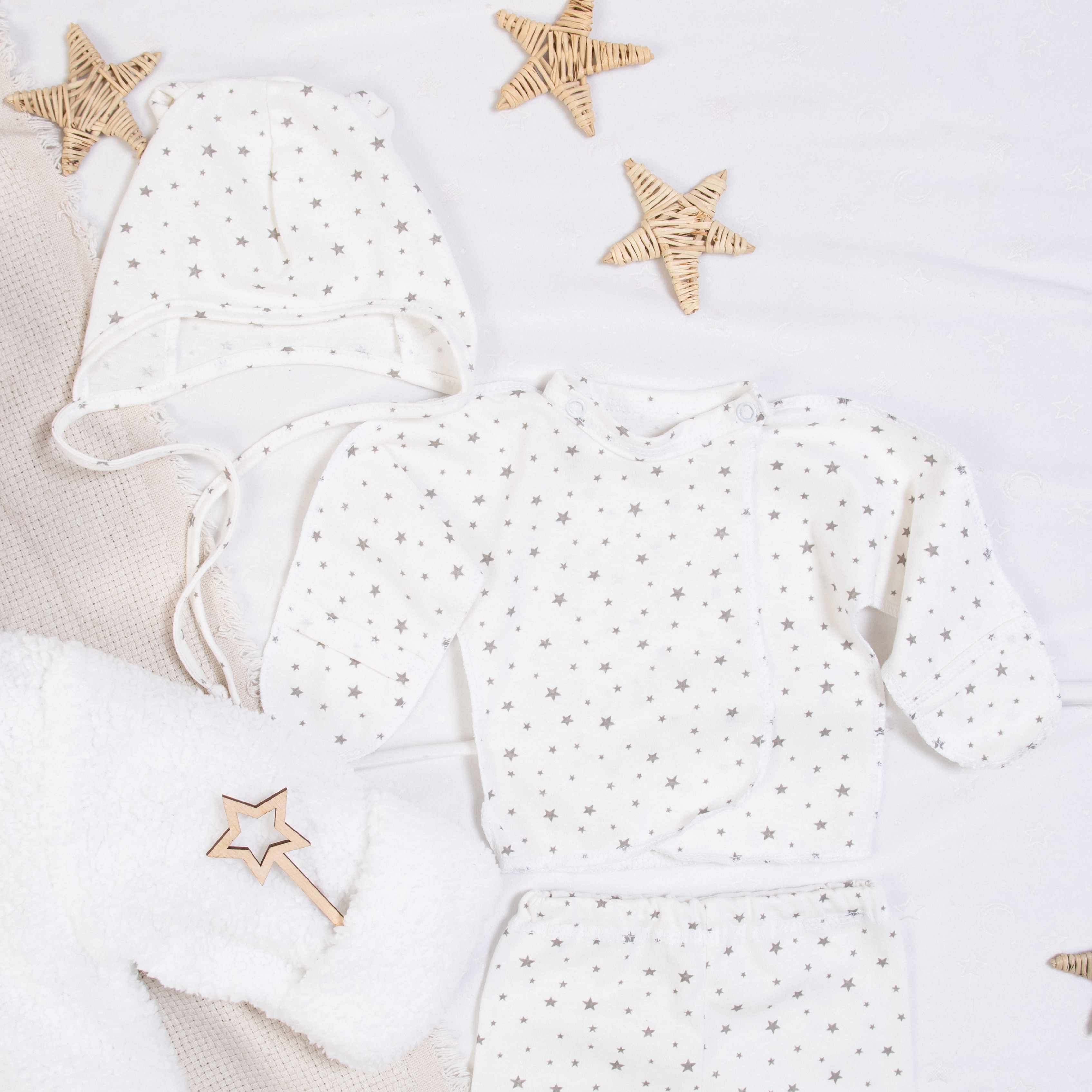 Комплект на выписку включает в себя все самое необходимое, практичную комплектацию из 5 предметов: распашонки на кнопках, штанишек на резинке, белые носочки и чепчик на завязках.