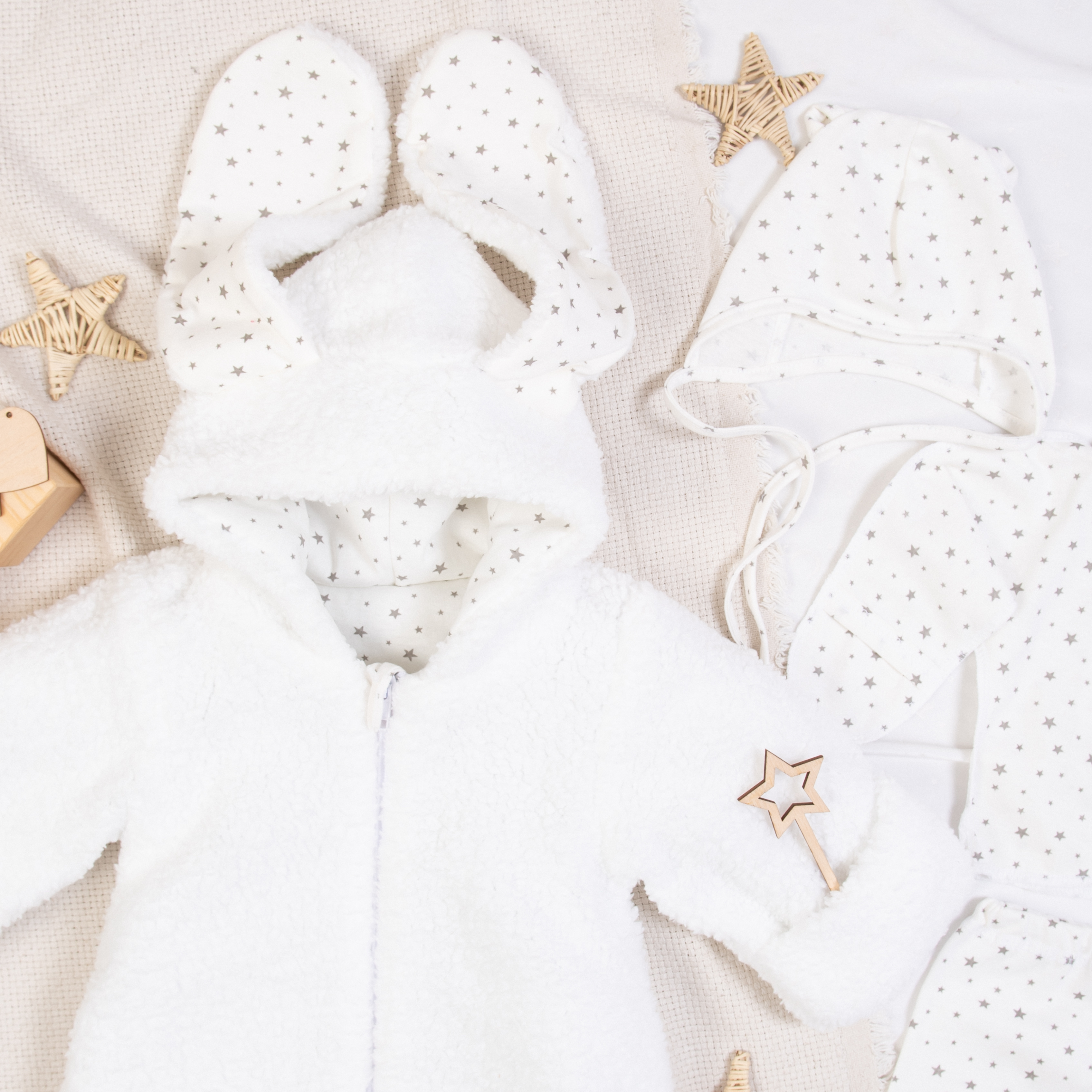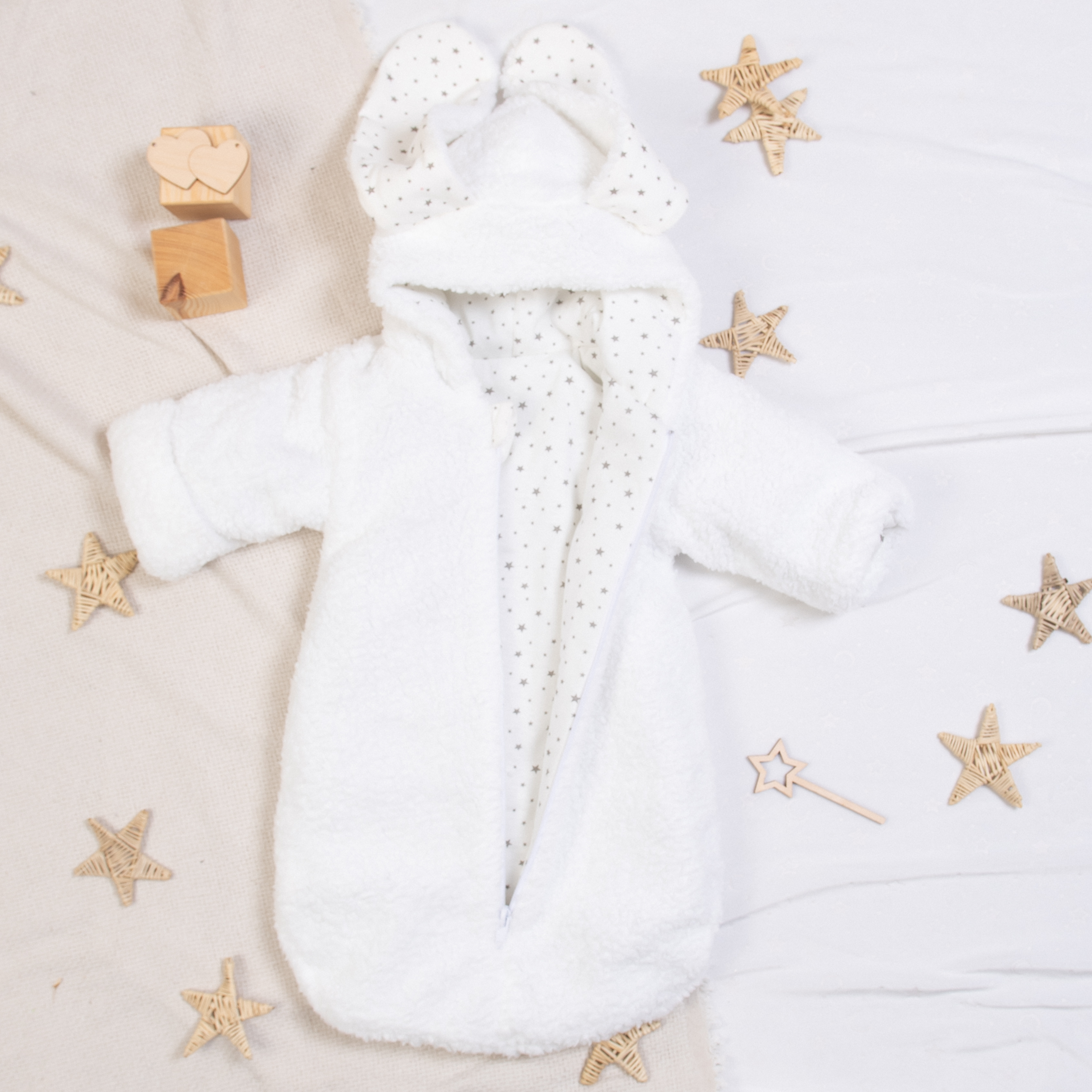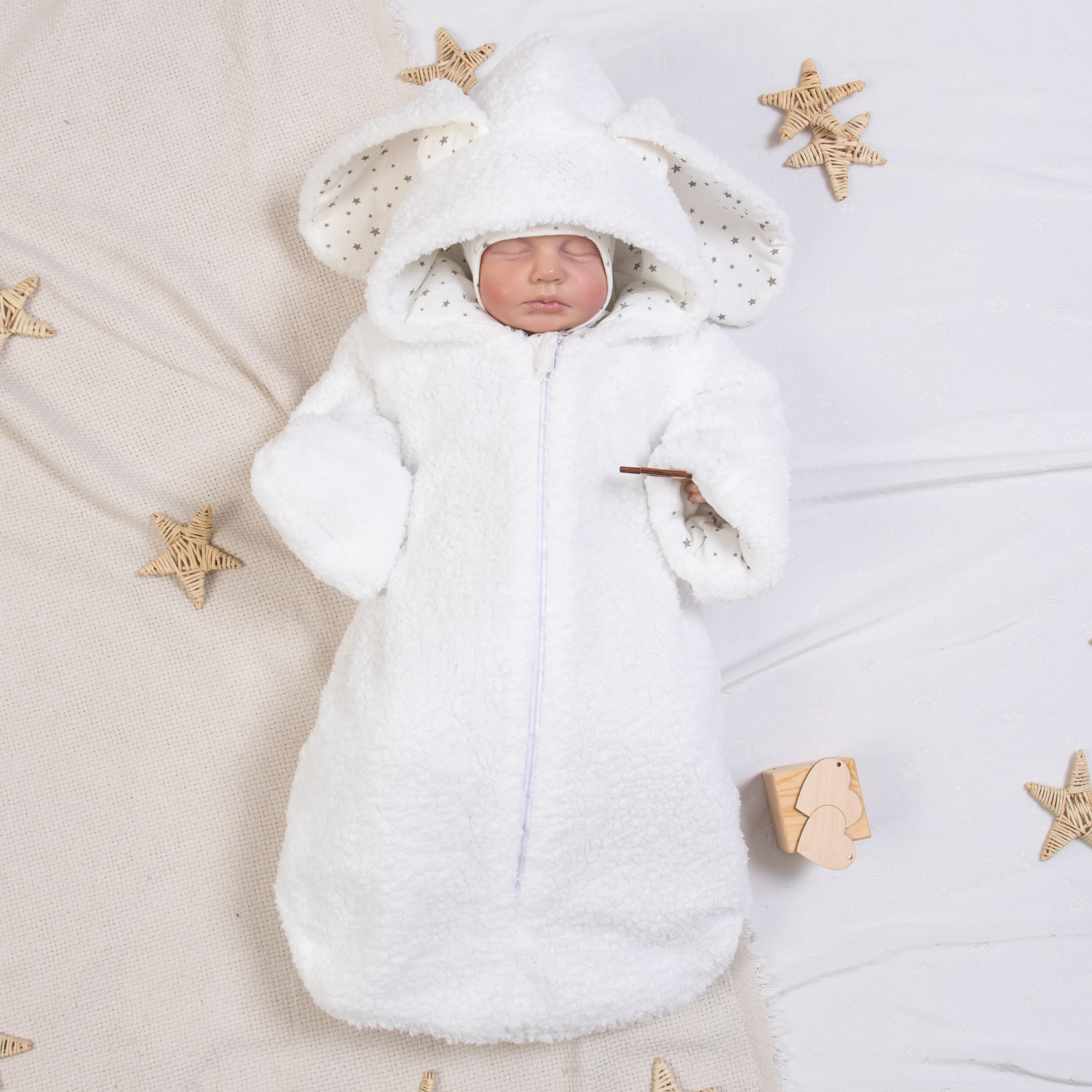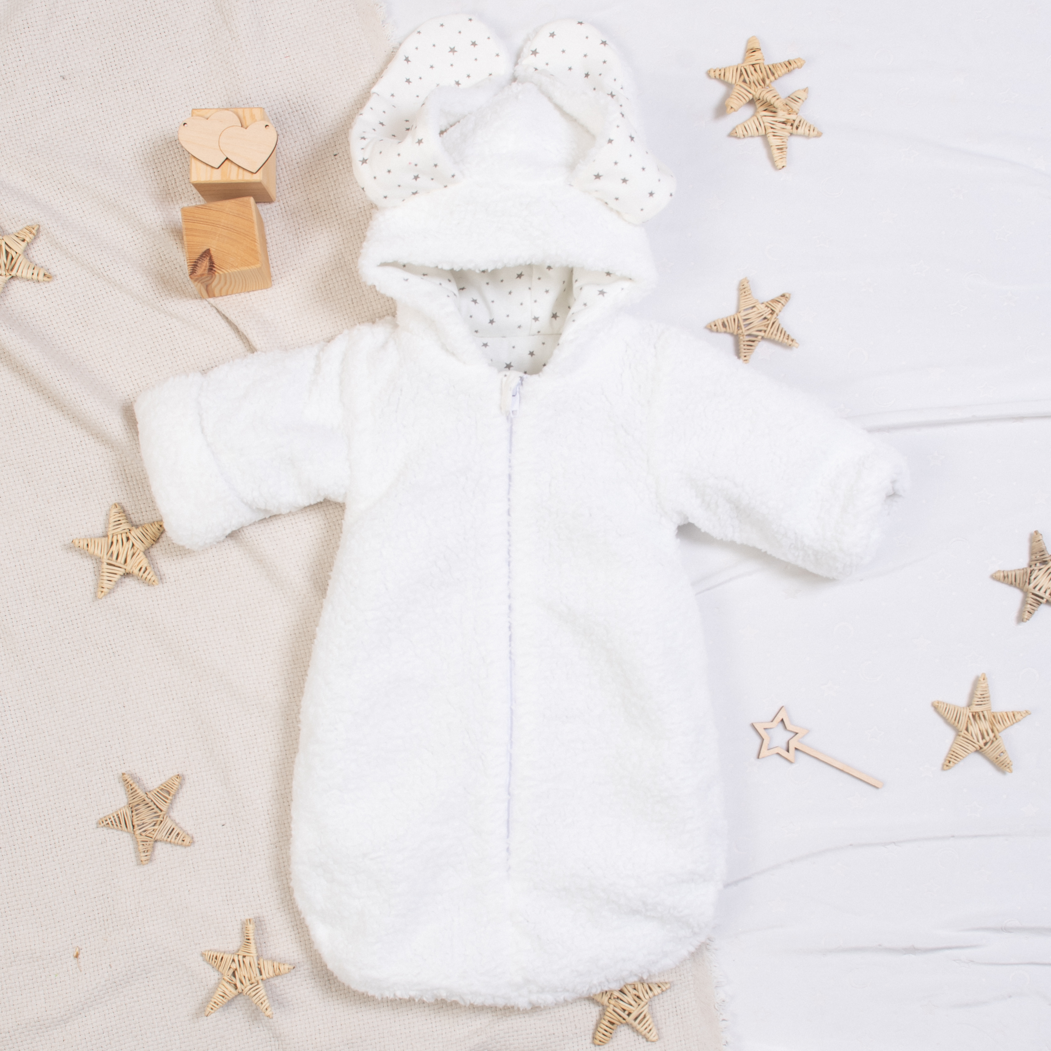 Белый нарядный конверт с милыми ушками мишки на капюшоне.