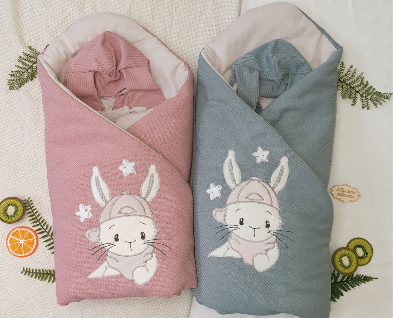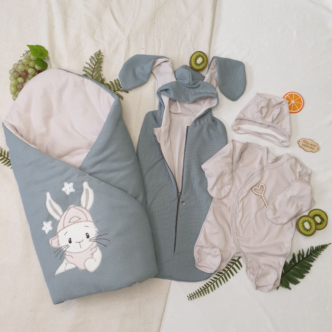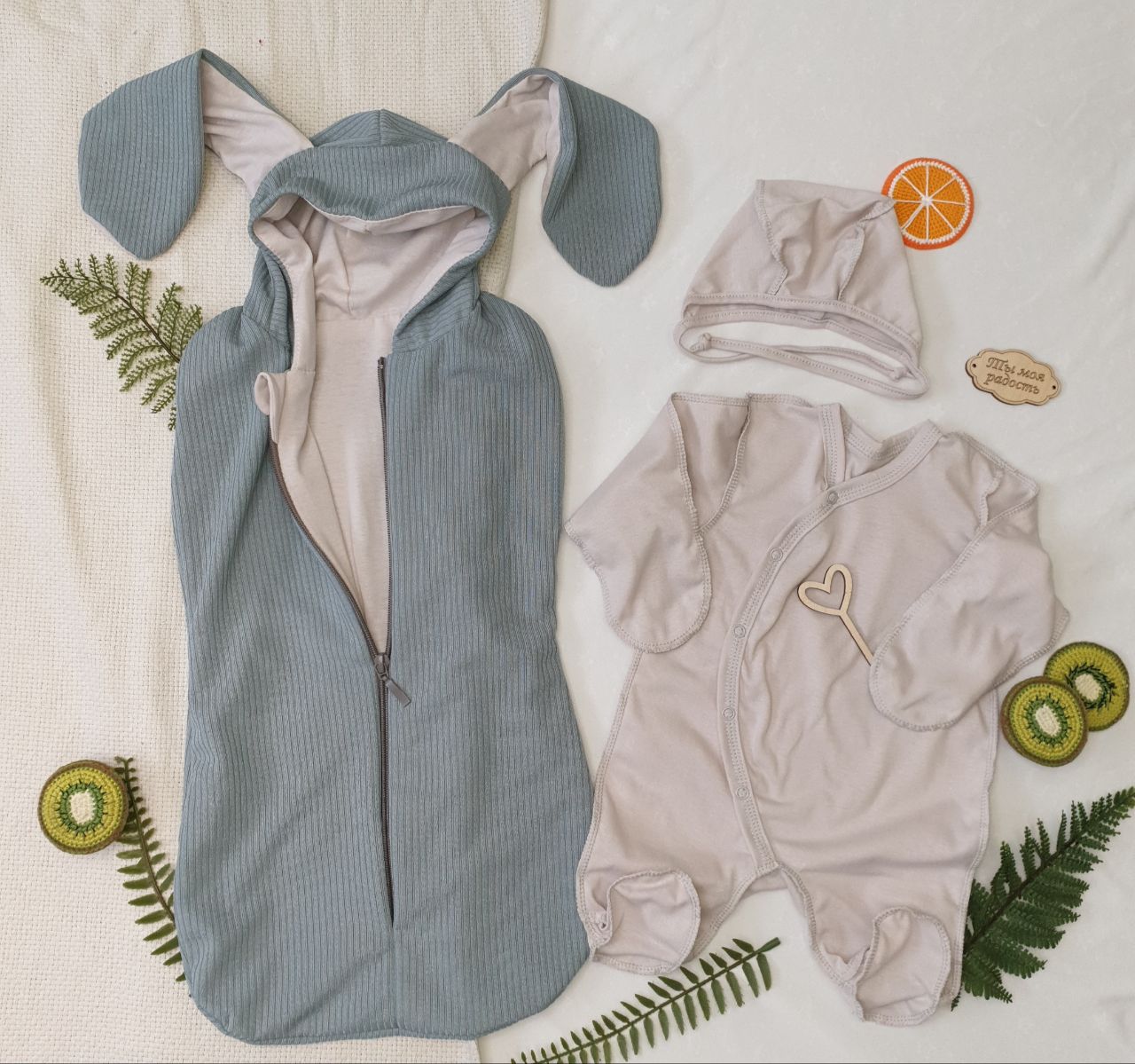В наборе пеленка-кокон на молнии с капюшоном из Плотного трикотажа с подкладкой из хлопкового кулирного трикотажа. Кокон очень удобно использовать на прогулке, для дополнительно утепления малыша.