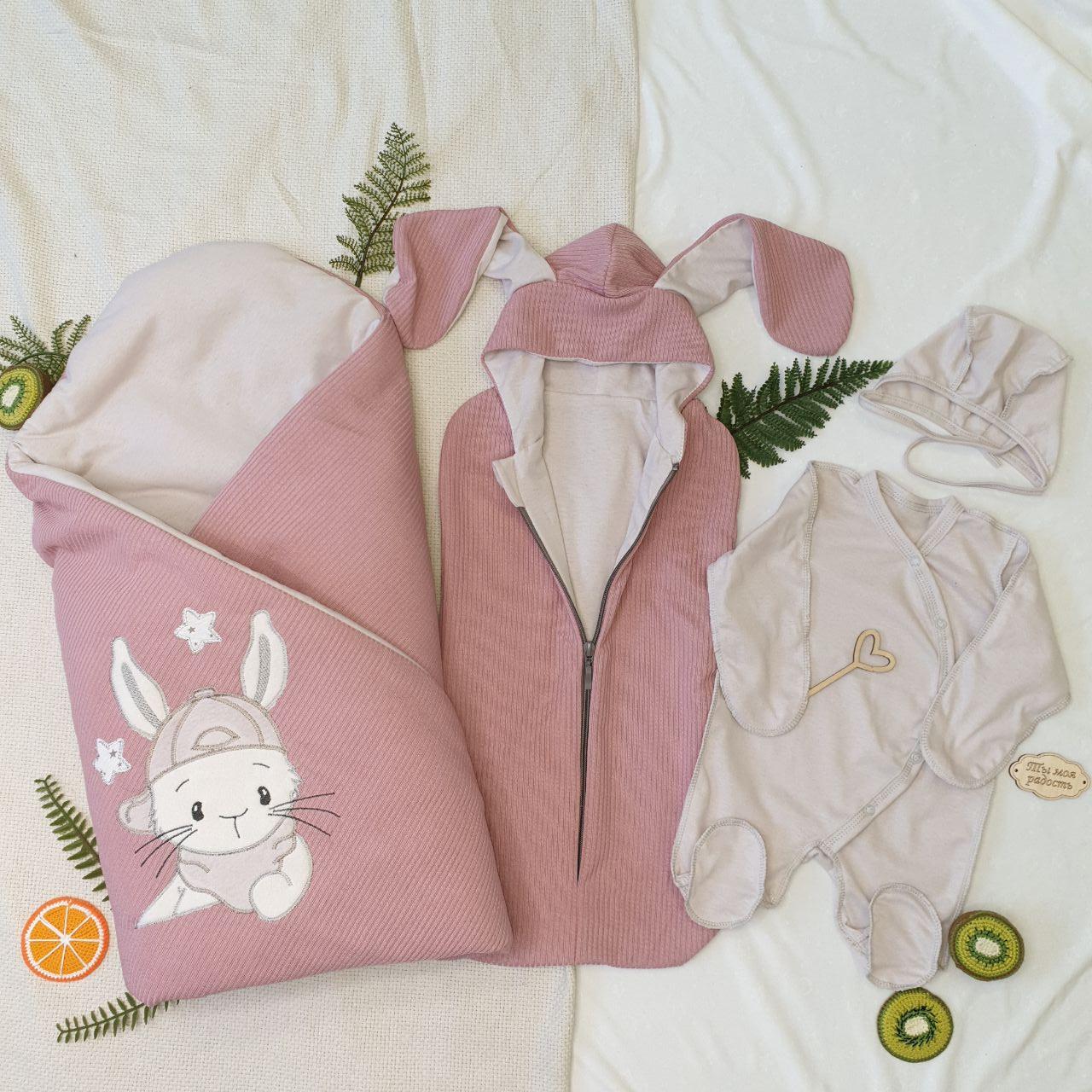 В наборе пеленка-кокон на молнии с капюшоном из Плотного трикотажа с подкладкой из хлопкового кулирного трикотажа. Кокон очень удобно использовать на прогулке, для дополнительно утепления малыша.