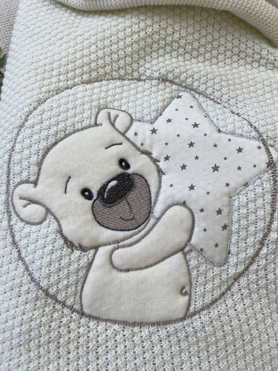 Одеяло-конверт жемчужная вязка молочного цвета + кулирка бежевая. утеплитель холстон 100гр на м кв в 1 слой.