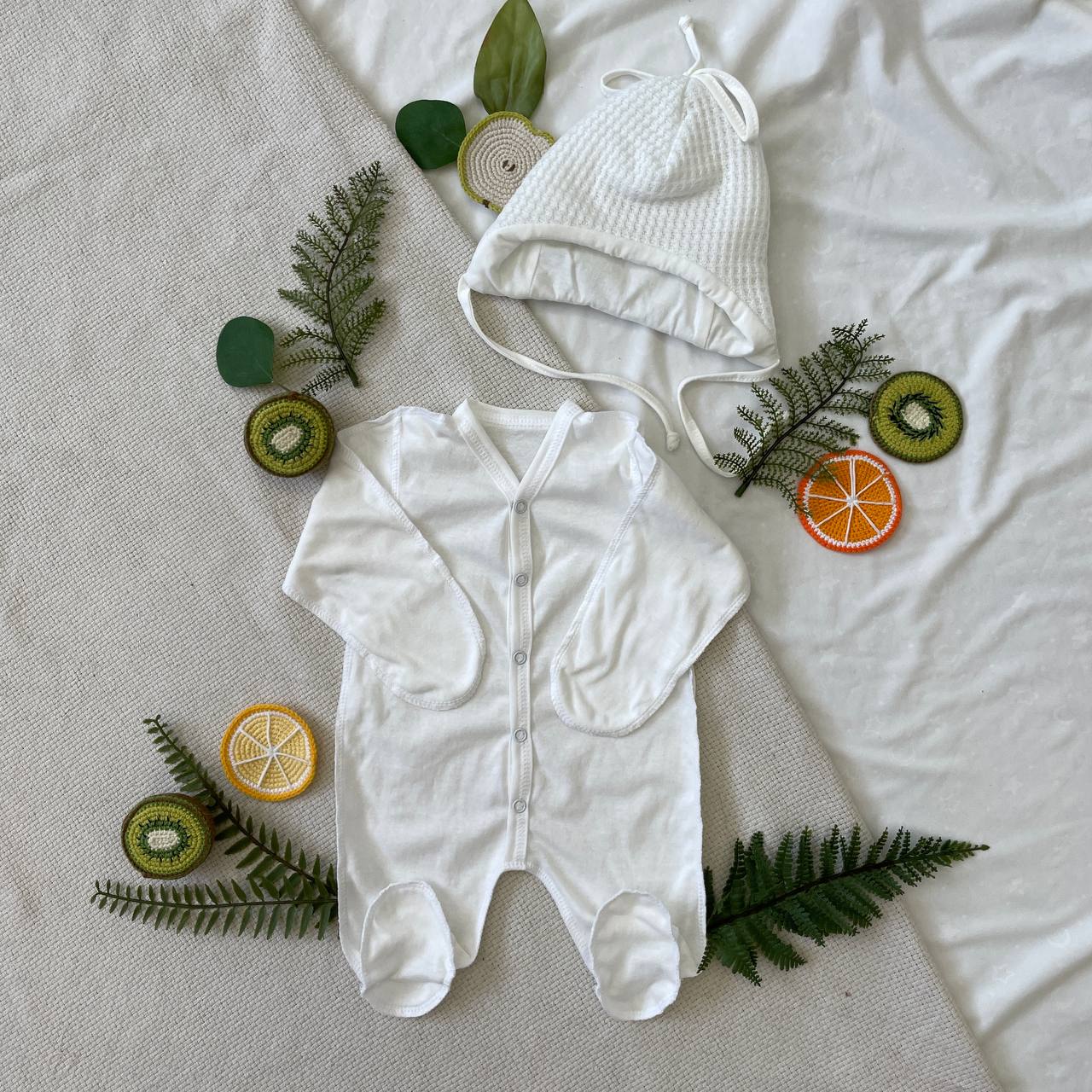 В наборе также комбинезон-слип на кнопках и утепленная шапочка на завязках.