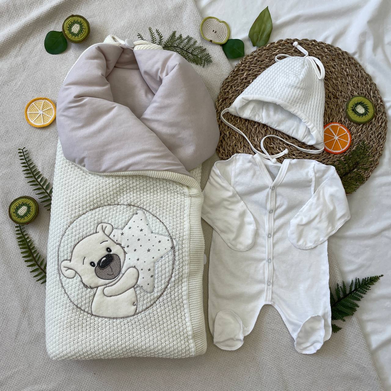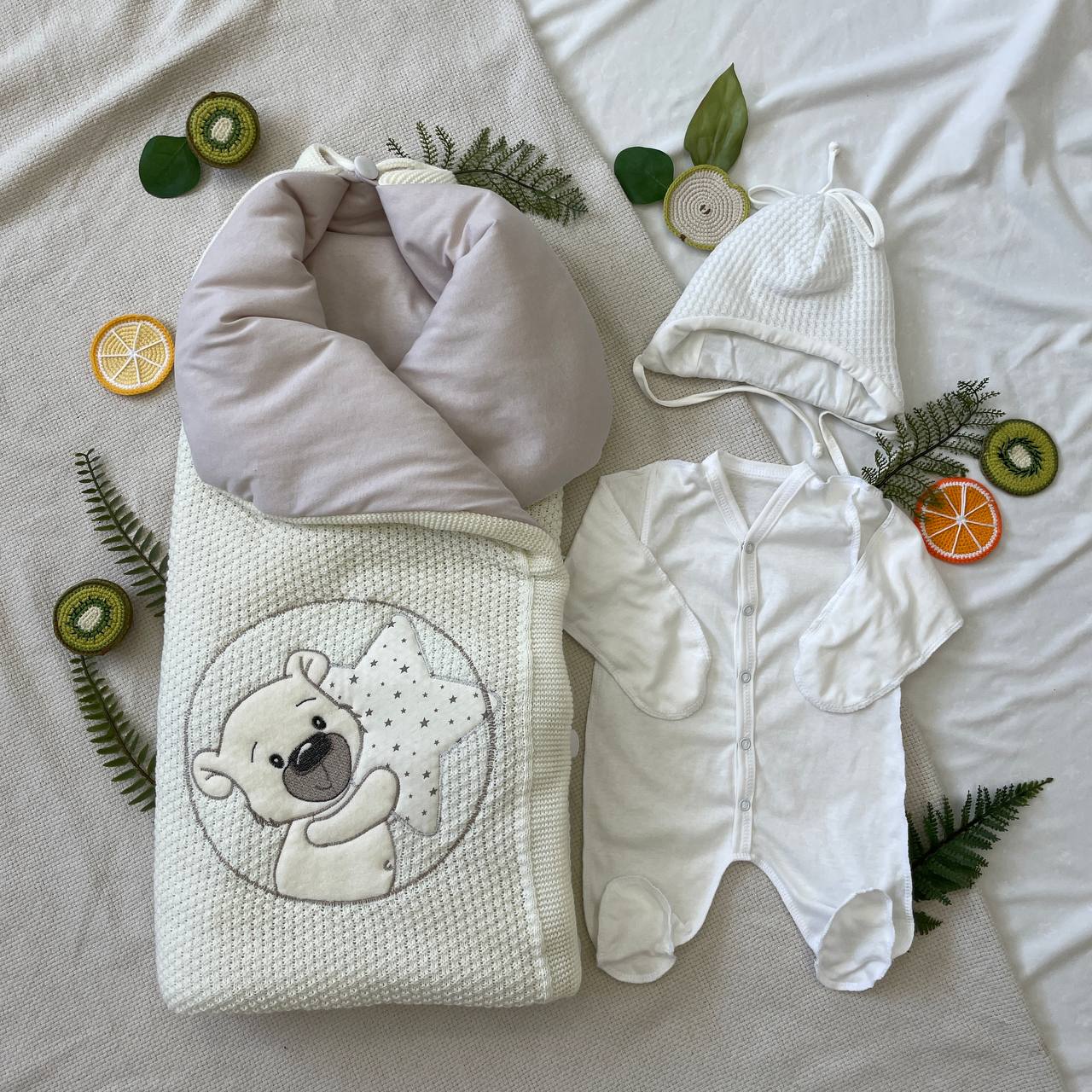 Комплект на выписку из вязанного полотна, внутри трикотажный хлопок.
