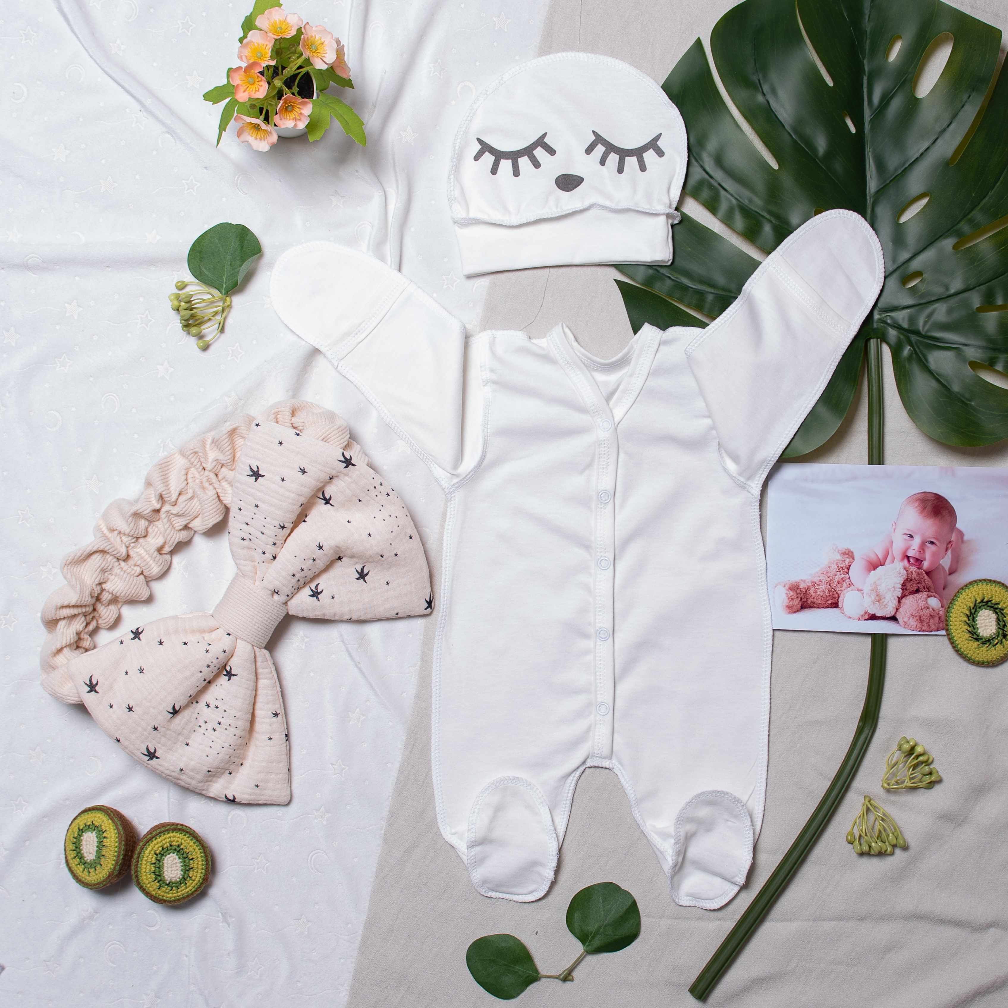 В наборе для новорожденного комбинезон слип из молочного трикотажного хлопка, модель с удобной застежкой на кнопках, рукава трансформер, ножка закрытая, швы наружу.