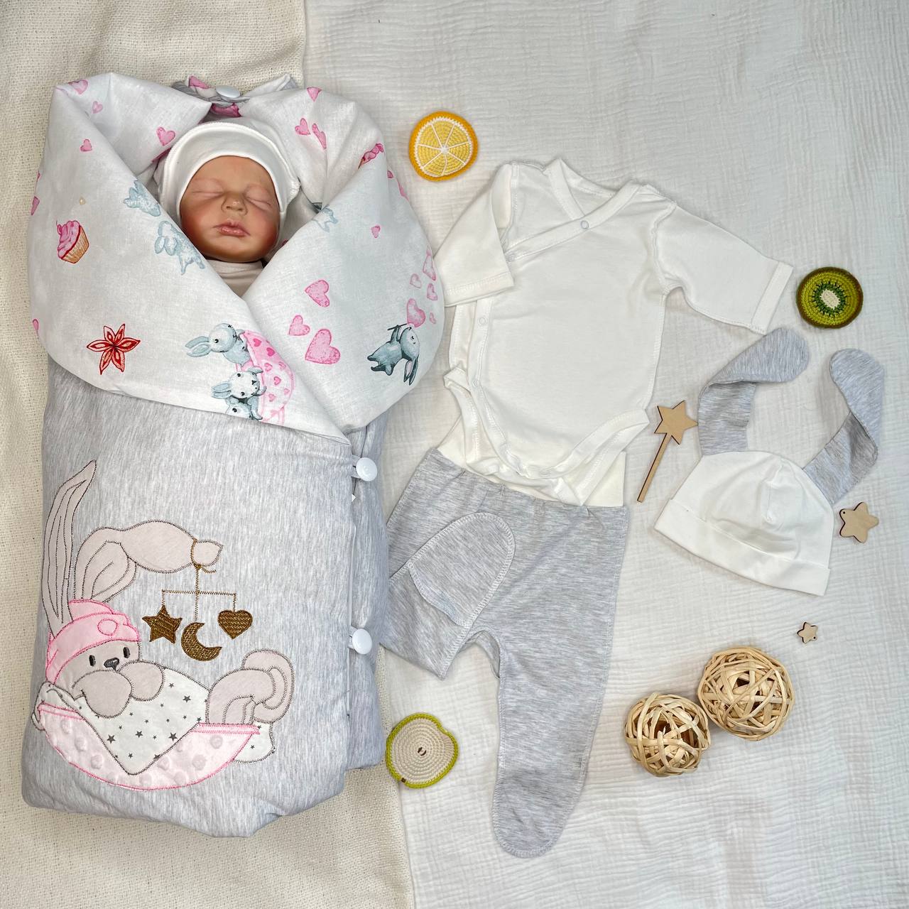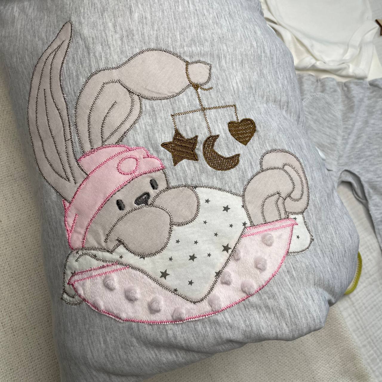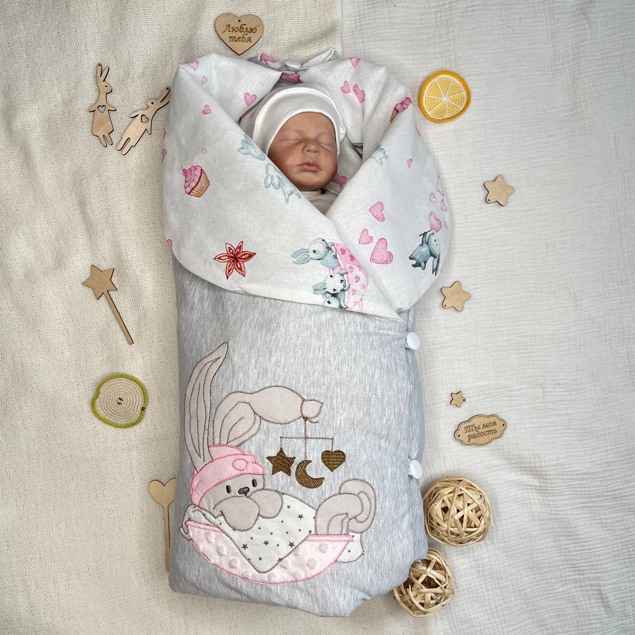 Одеяло на 4х пуговицах с милой вышивкой "Зайки" гармонично дополняет дизайн. Красивое, стильное и практичное одеяло-конверт раскладывается в полноценное одеялко 100/100 см и после выписки послужит еще пару лет. (кулирный трикотаж+ бязь набивка)