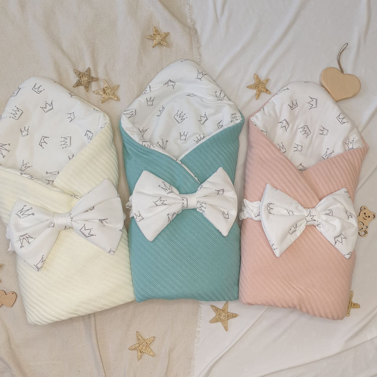 Комплект для новорожденного создается в трех цветах - молочный, мятный и пудра.