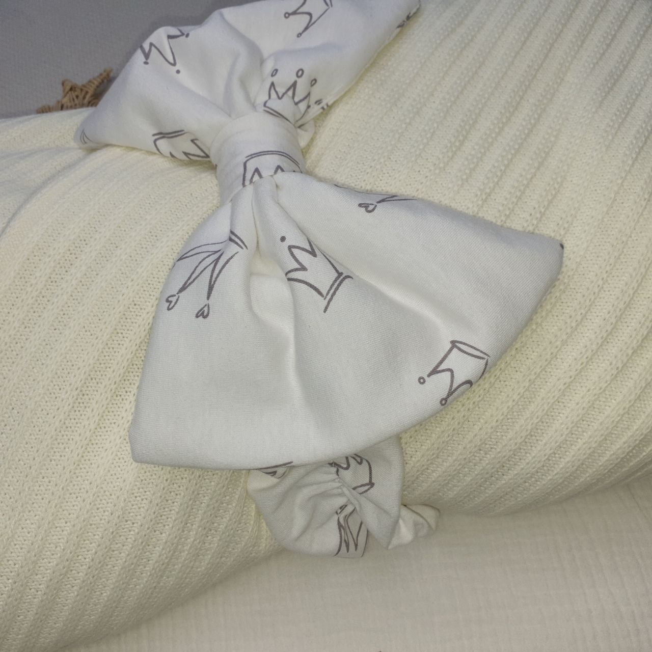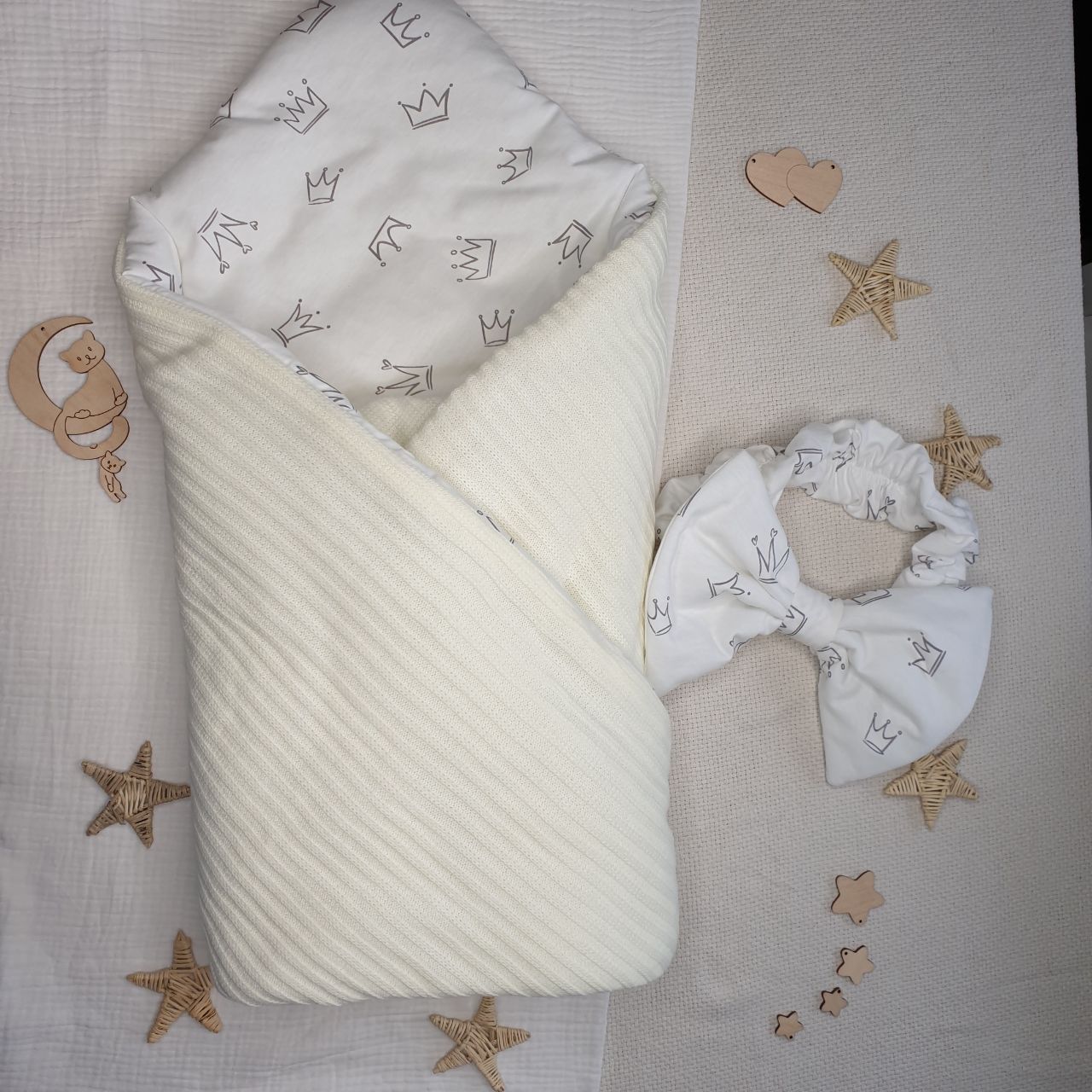 Нежный и легкий комплект из вязанного полотна, фактура "лапша", и трикотажного хлопка с принтом короны.