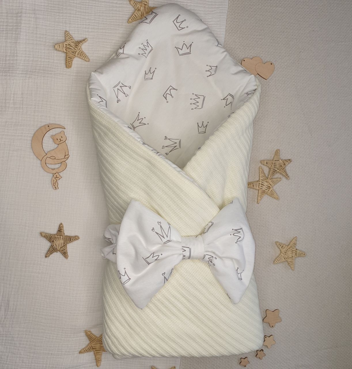 В комплекте одеяло-конверт, на одной пуговице, трансформирующееся в одеяло и пояс-бант, нежно фиксирующий малыша.