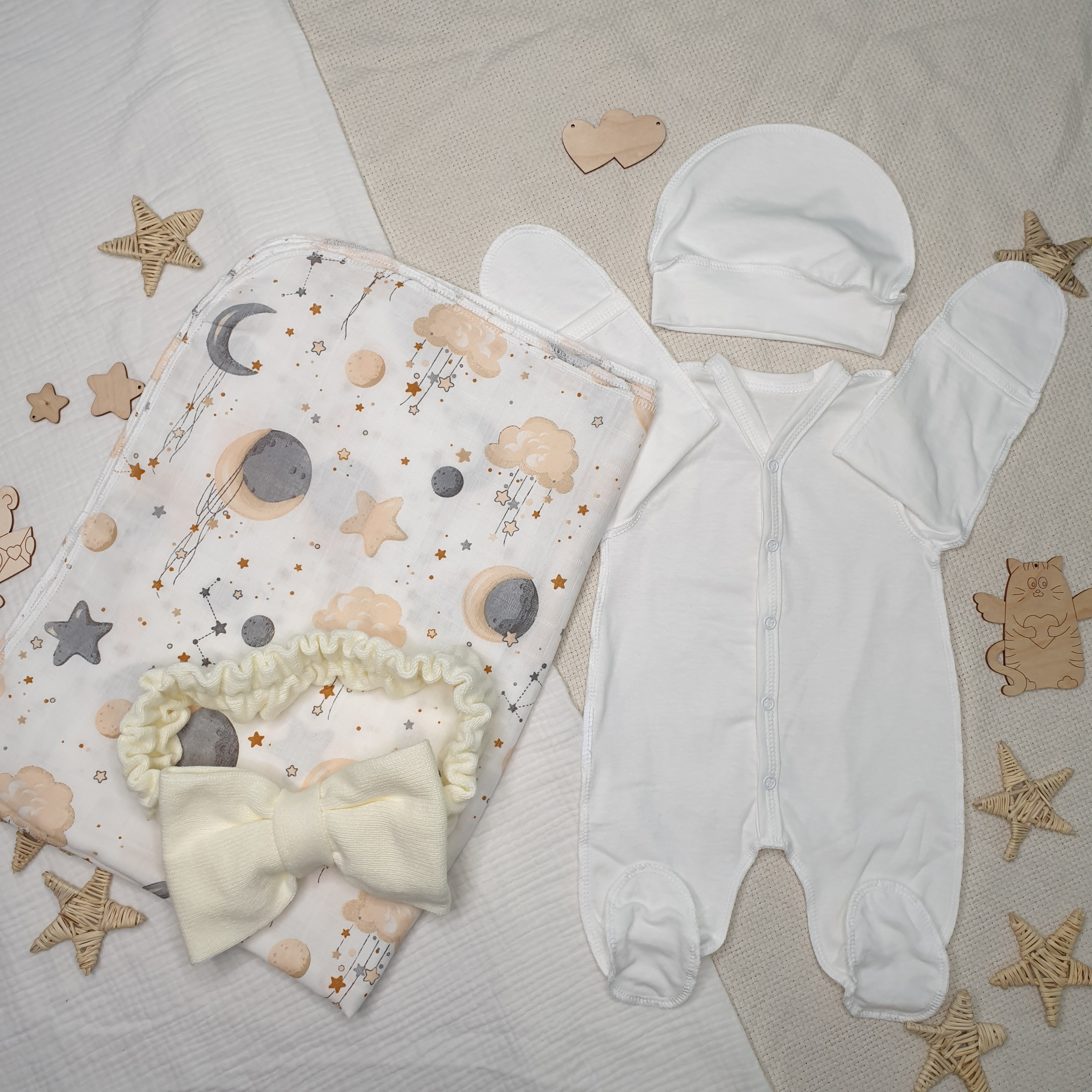 В наборе для новорожденного пеленка из набивного муслина, комбинезон слип из молочного трикотажного хлопка, модель с удобной застежкой на кнопках, рукава трансформер, ножка закрытая, швы наружу.
