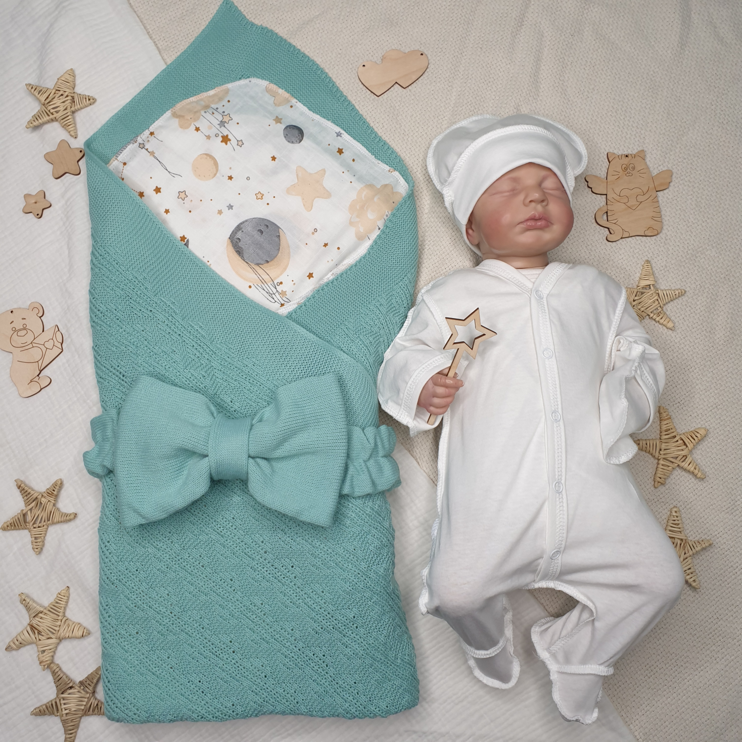 Комплект в роддом из вязанного пледа, нейтрального мятного цвета подойдет как мальчику так и девочке.