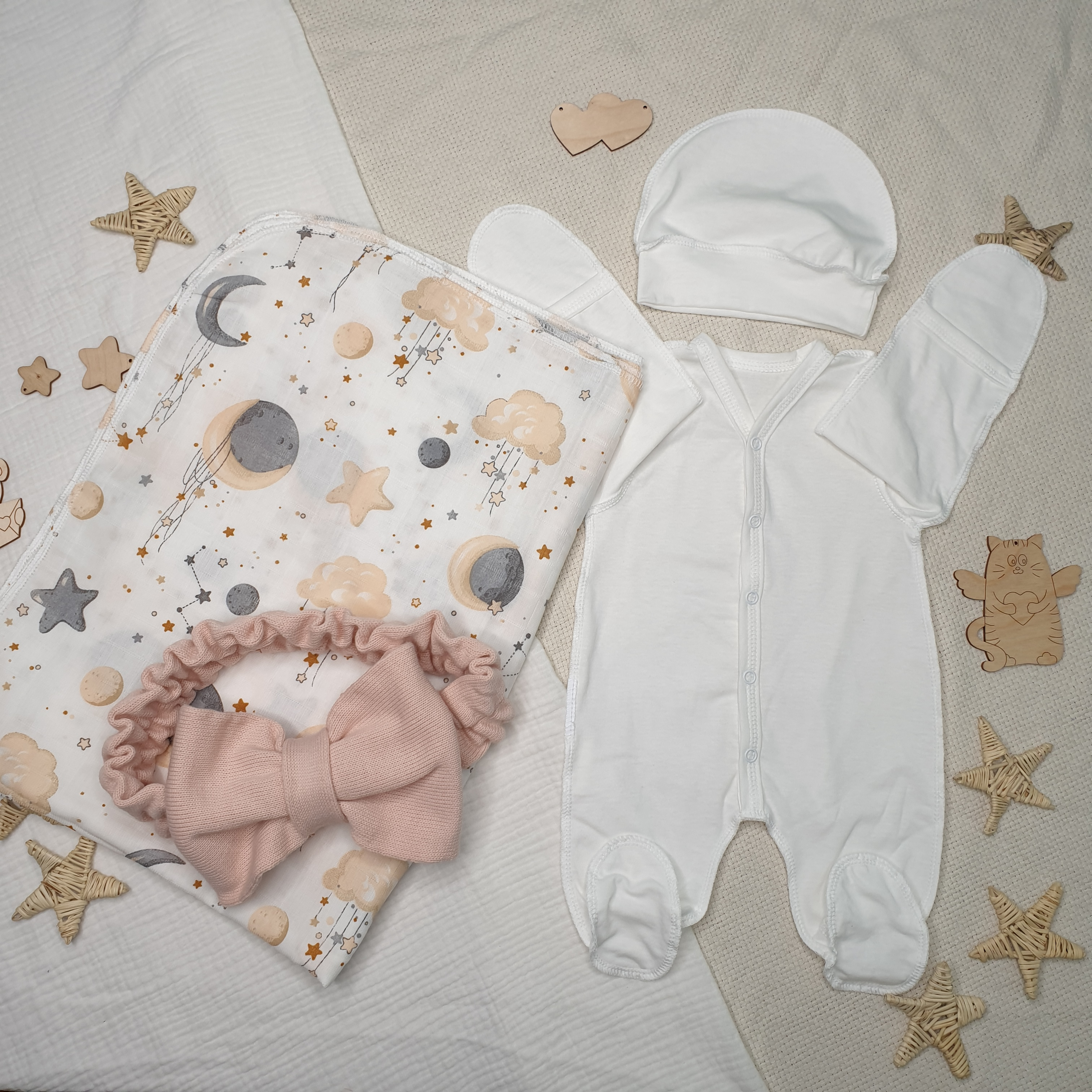 В наборе для новорожденного пеленка из набивного муслина, комбинезон слип из молочного трикотажного хлопка, модель с удобной застежкой на кнопках, рукава трансформер, ножка закрытая, швы наружу.