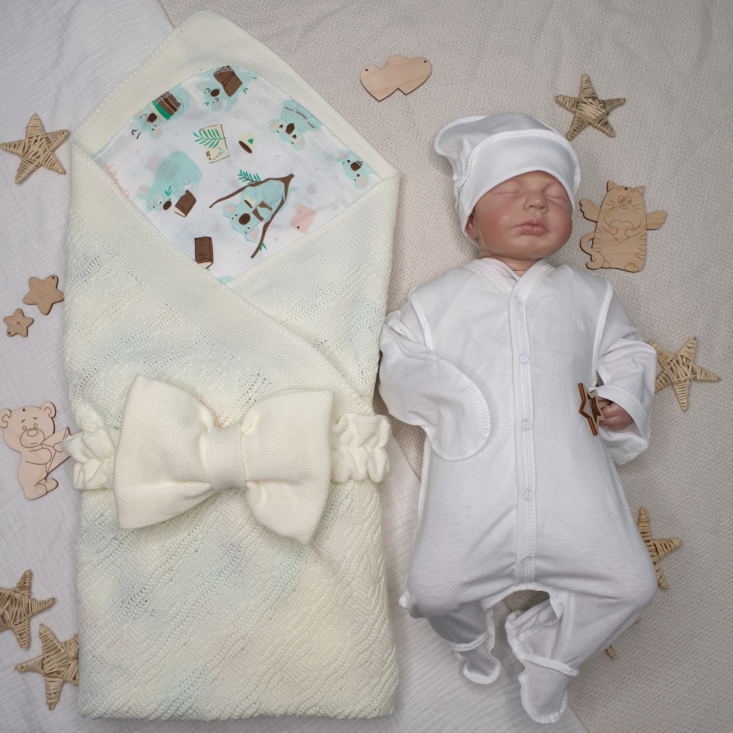 В наборе для новорожденного пеленка из набивного муслина, комбинезон слип из молочного трикотажного хлопка, модель с удобной застежкой на кнопках, рукава трансформер, ножка закрытая, швы наружу.