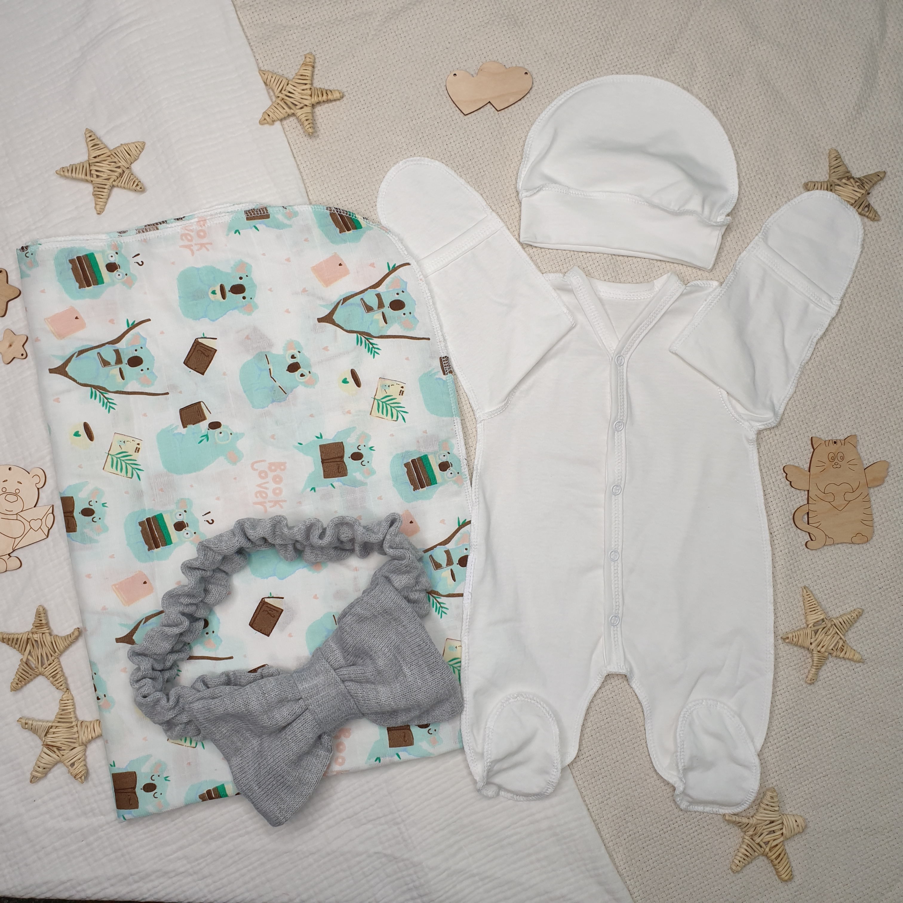 В наборе для новорожденного пеленка из набивного муслина, комбинезон слип из молочного трикотажного хлопка, модель с удобной застежкой на кнопках, рукава трансформер, ножка закрытая, швы наружу.