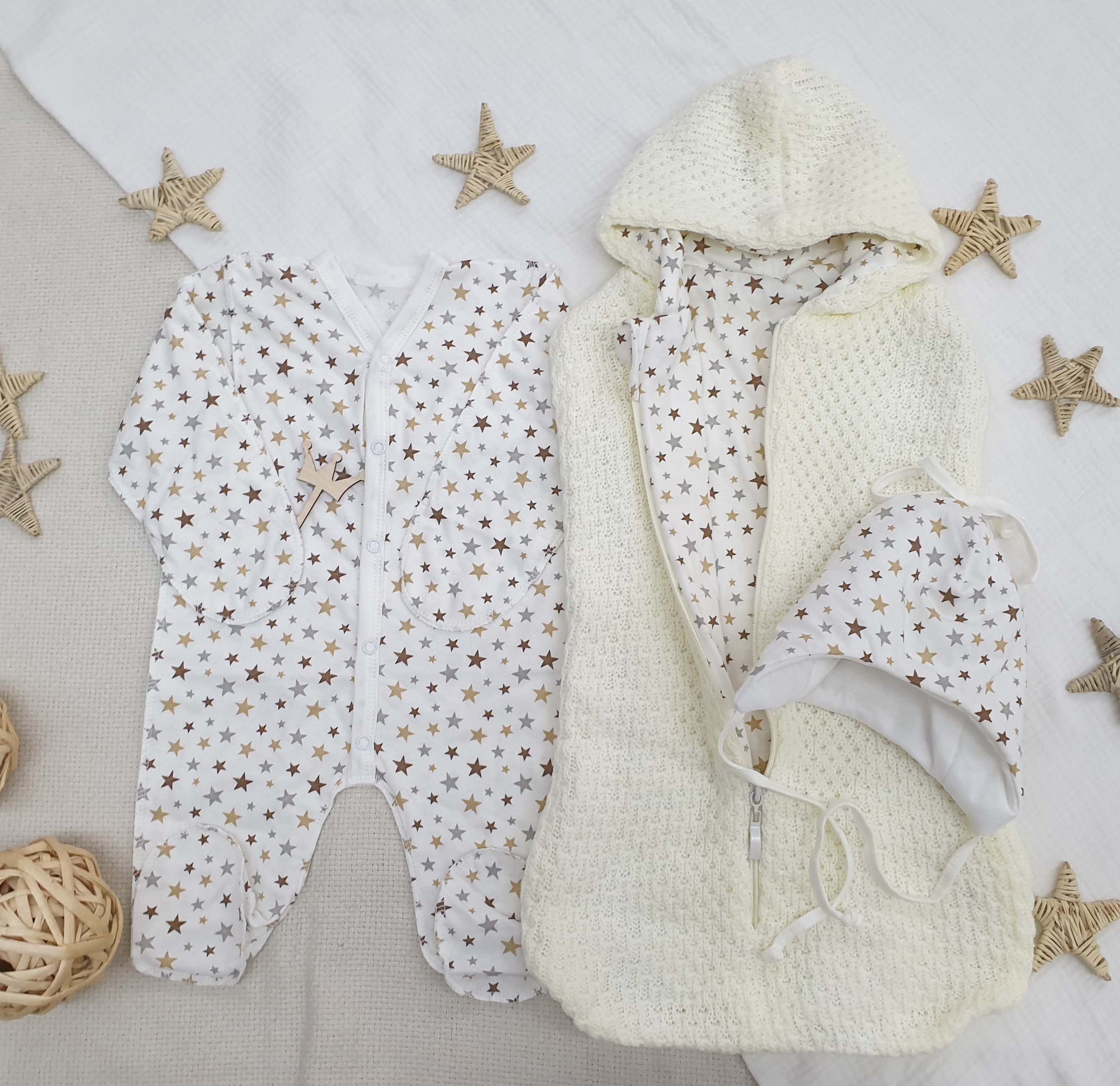 Арт 457 Комплект на выписку "Дино на луне". Его нежный молочный оттенок и милое изображение Дино-символа нового года делают его идеальным для вашего выбора ! Этот комплект выполнен из качественной вязки и внутренней ткани кулирного трикотажа 100% хлопка, размером одеялко 90х90 см +-5см, что обеспечивает комфорт и мягкость, можно в дальнейшем использовать как полноценное одеяло. В качестве утеплителя использован современный и гипоаллергенный материал холстон, плотностью 200 гр/ кв.м. в 2 слоя. Комплектация включает в себя все самое необходимое: На первый слой хлопковый слип "звездочки" на кнопках. Ручки-трансформер, ножки закрытые. Вязаная пеленка-кокон на молнии с капюшоном и теплая шапочка на завязках.