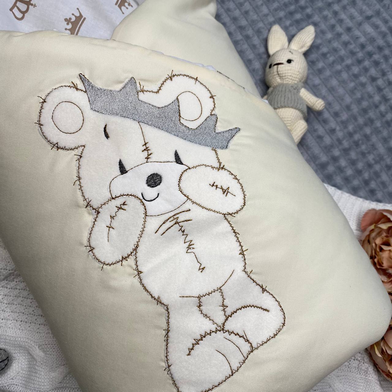 Одеяло-конверт на пуговице, выполнено из ткани прессатина, утеплено современным технологичным утеплителем холстон, внутренняя сторона — хлопок 100%. Вышивка "Мишка в короне" гармонично дополняет дизайн.