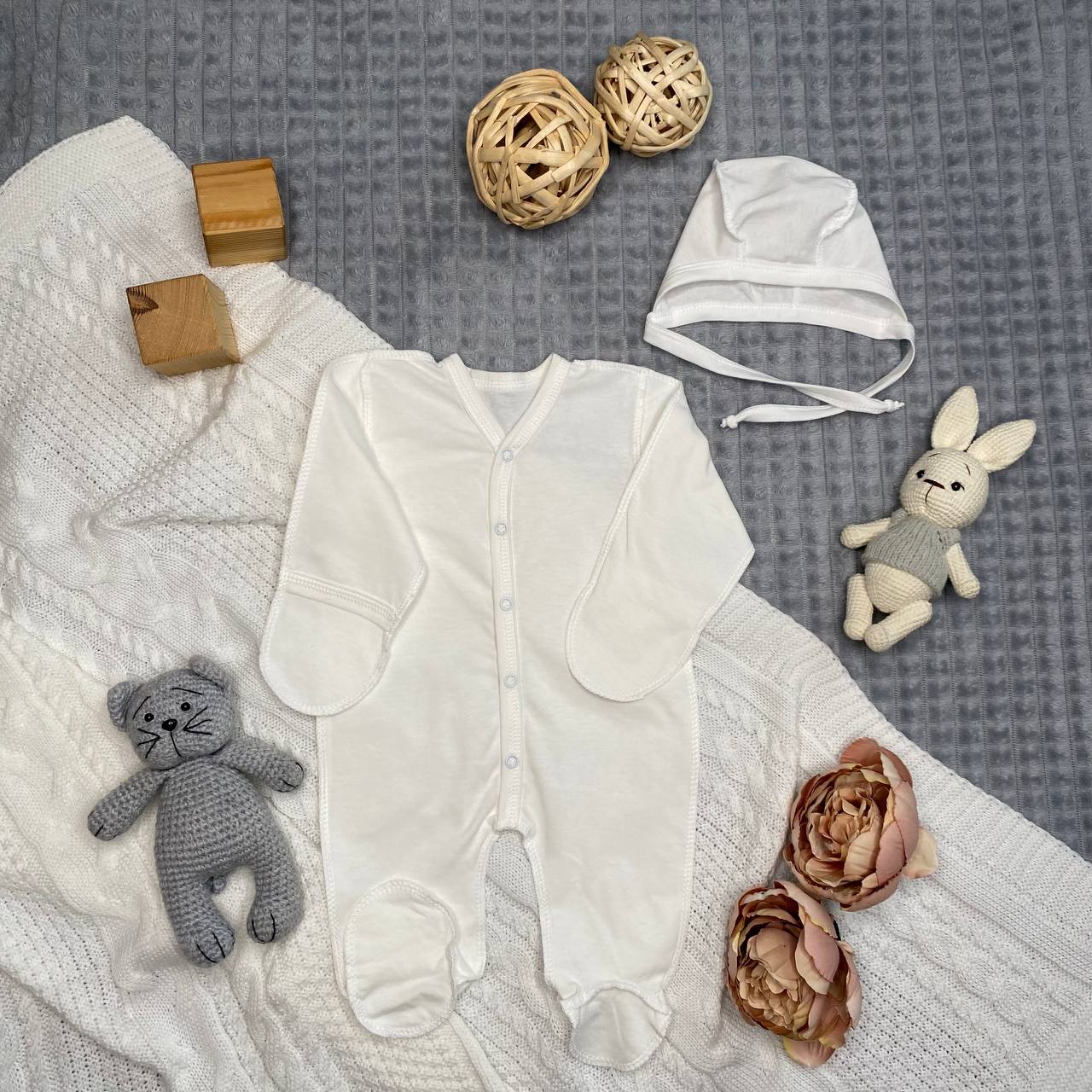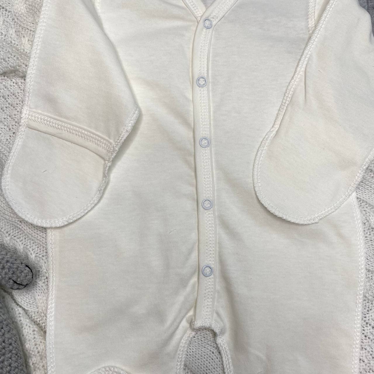 1.Трикотажный слип на кнопках, швы наружу, ручки с отворотом-антицарапки, ножки закрыты. Размер 56 см