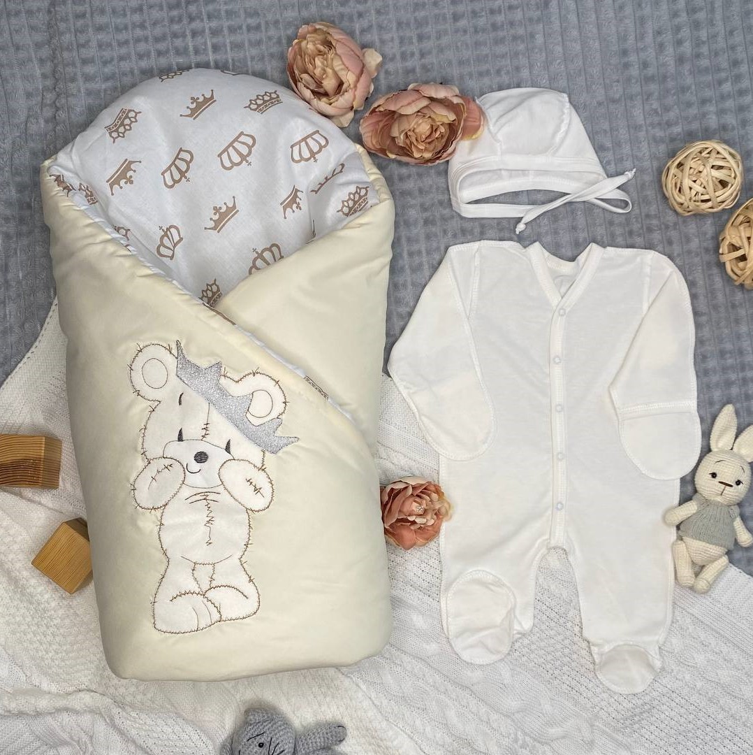 Идеальный комплект на выписку из роддома под названием «Король» в универсальном молочном цвете.