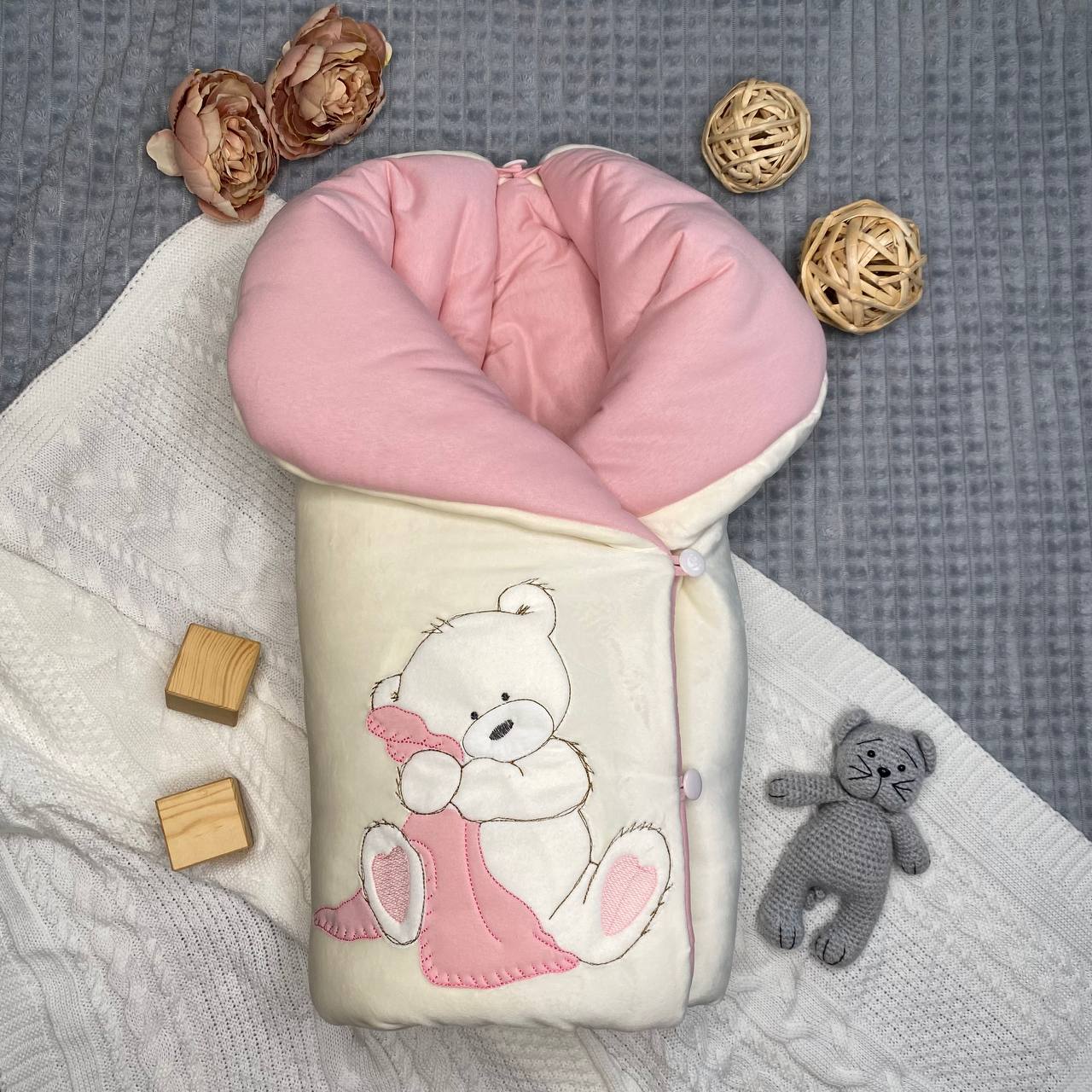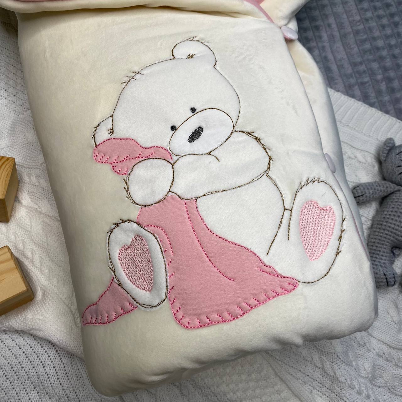 - Одеяло с вышивкой "Мишки" на 4х пуговицах. Размер в разложенном виде 100х100 см. Снаружи вельбоа молочного цвета, подклад кулирный трикотаж, розового цвета 100% хлопок. Конверт утеплен слоем холстона 100гр/кВ.м.
