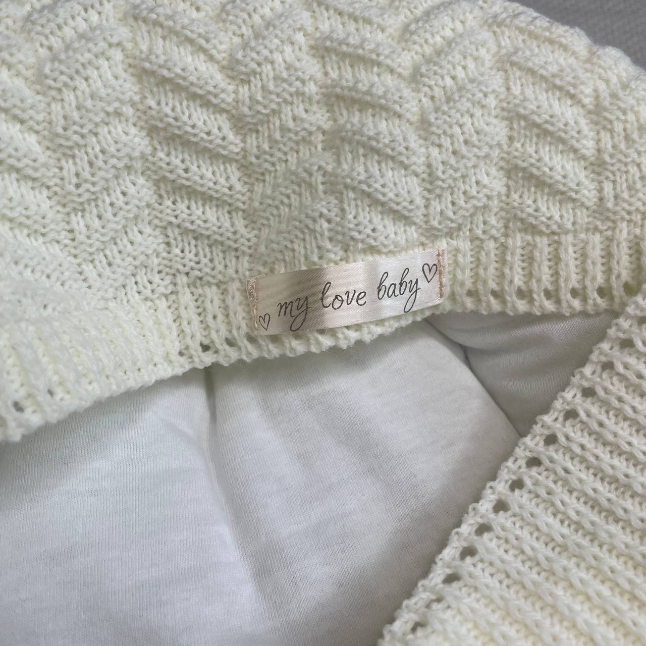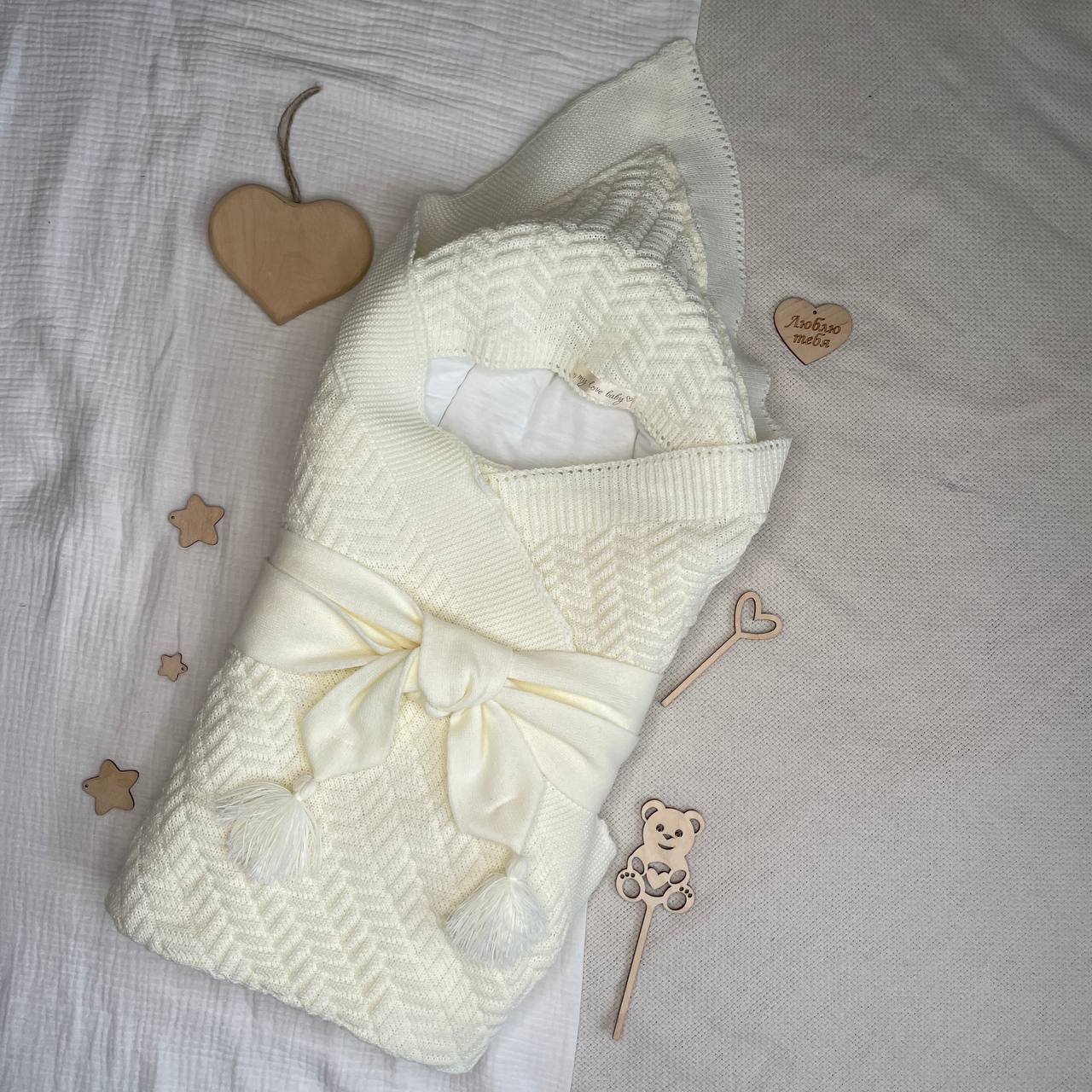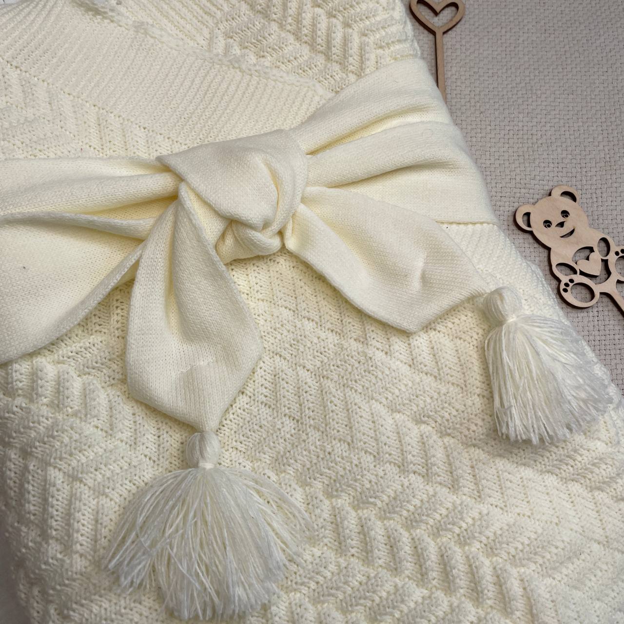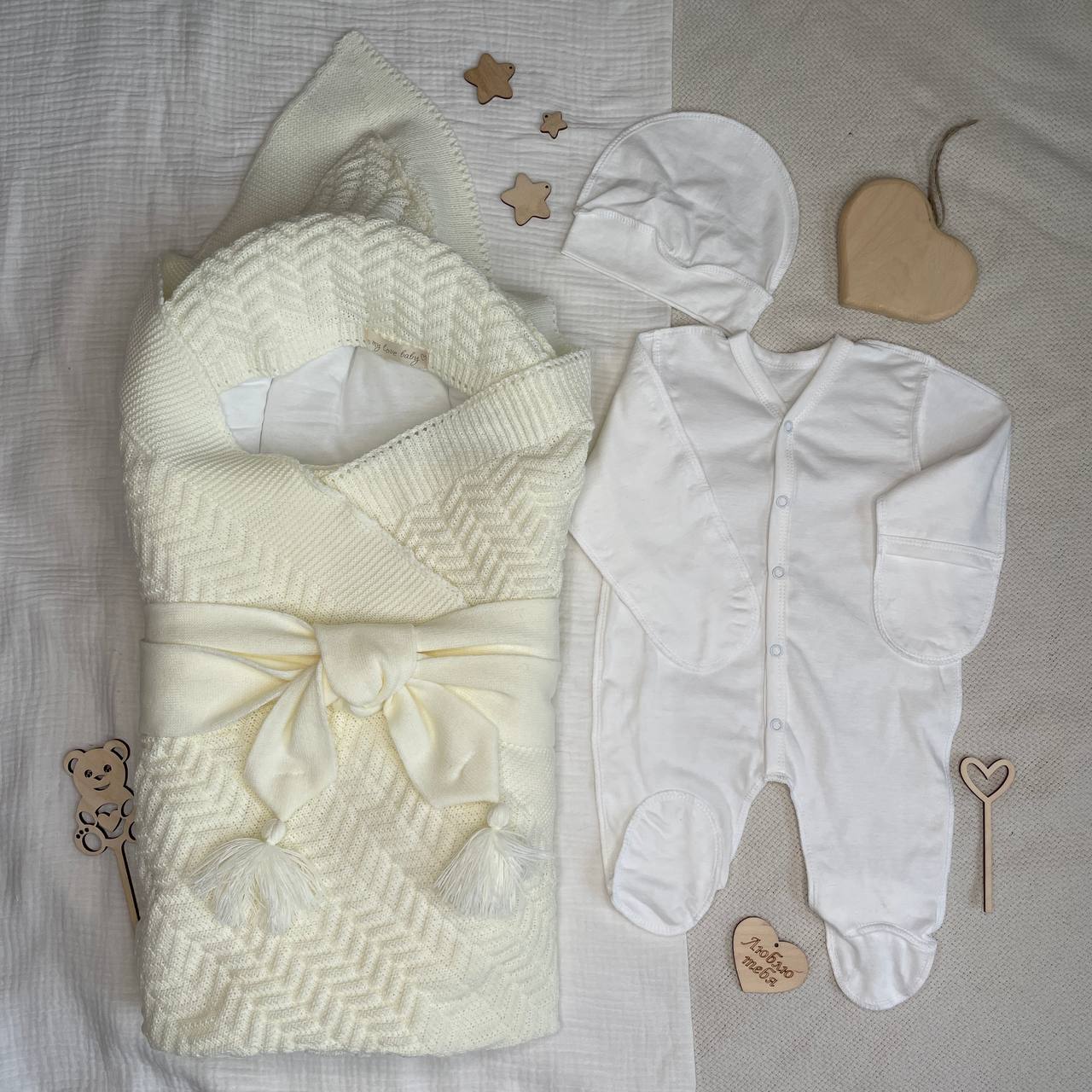 Летний вязаный комплект на выписку для новорожденного в молочном цвете.