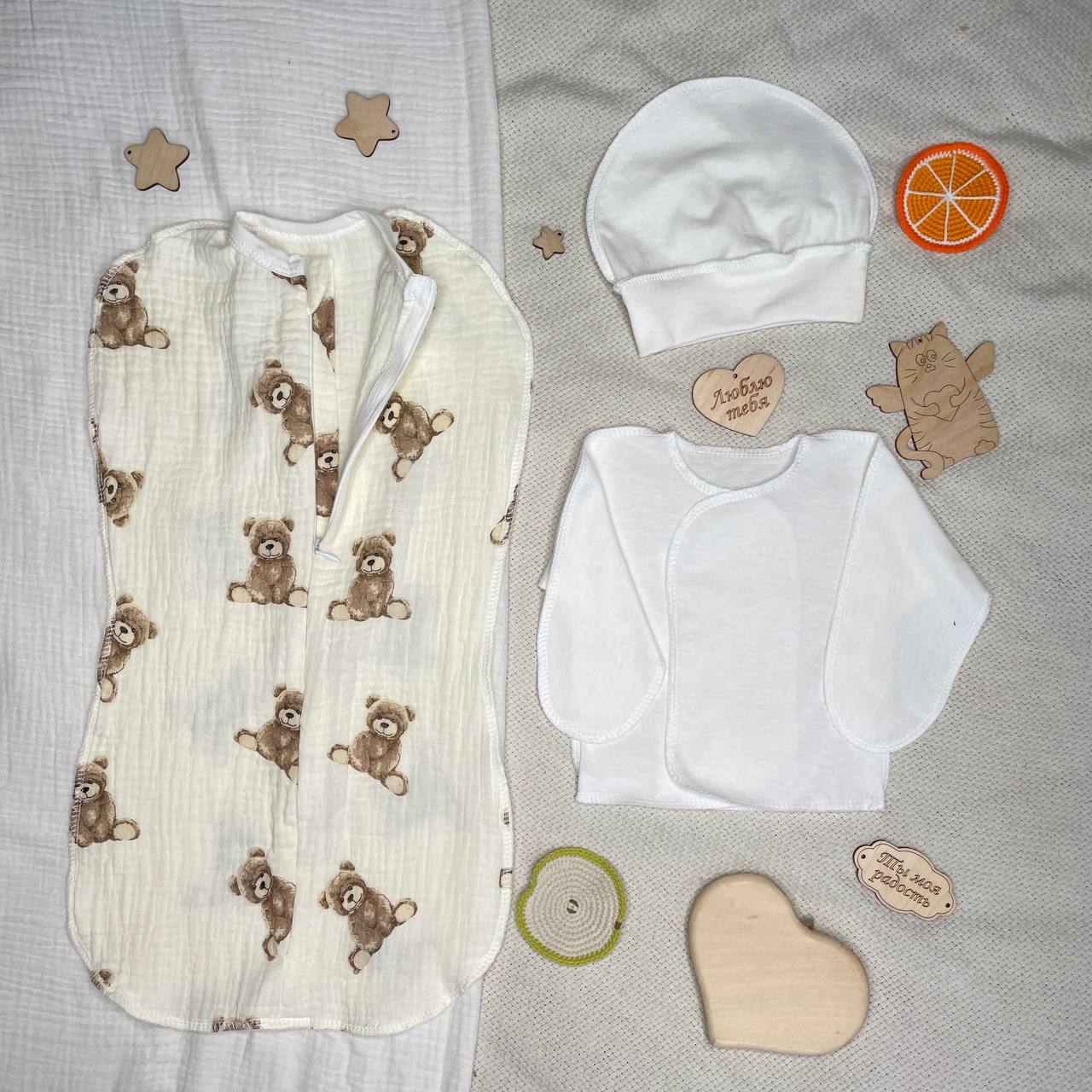 На первый слой хлопок 100%. Распашонка с закрытыми ручками, швы наружу и шапочка швы наружу, размер 0-3 мес