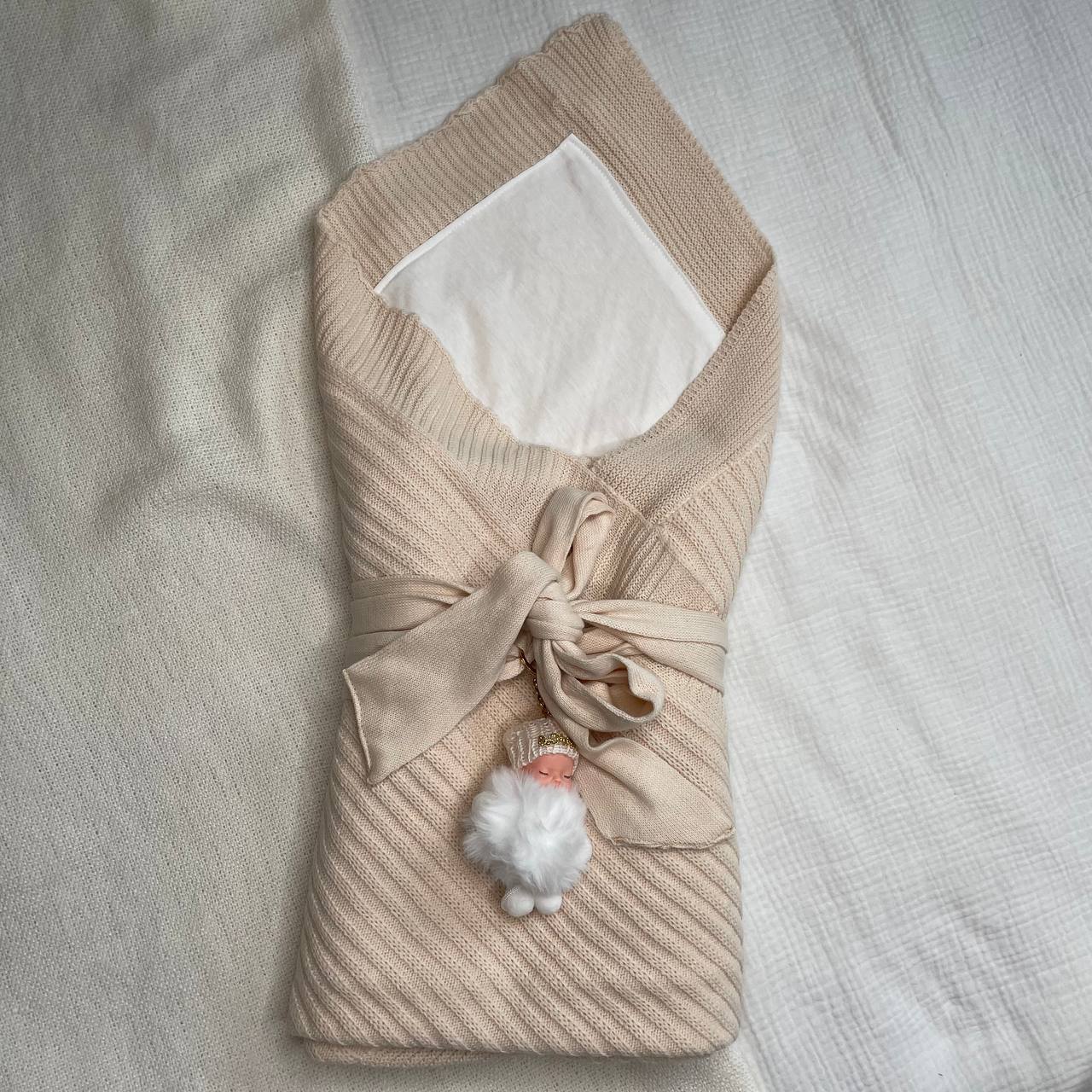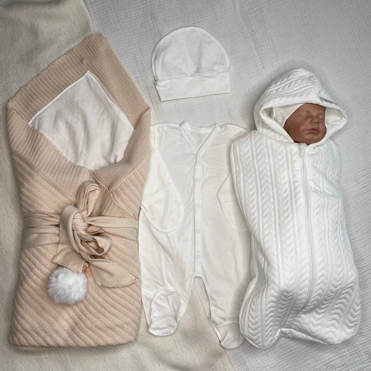 2. Пеленка-кокон с капюшоном, на молнии. С подкладом из 100% хлопкового трикотажа внутри и красивой рельефной ткани капитоний косичка белого цвета. Размер на рост 0-3 мес