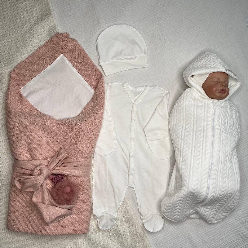2. Пеленка-кокон с капюшоном, на молнии. С подкладом из 100% хлопкового трикотажа внутри и красивой рельефной ткани капитоний косичка белого цвета. Размер на рост 0-3 мес