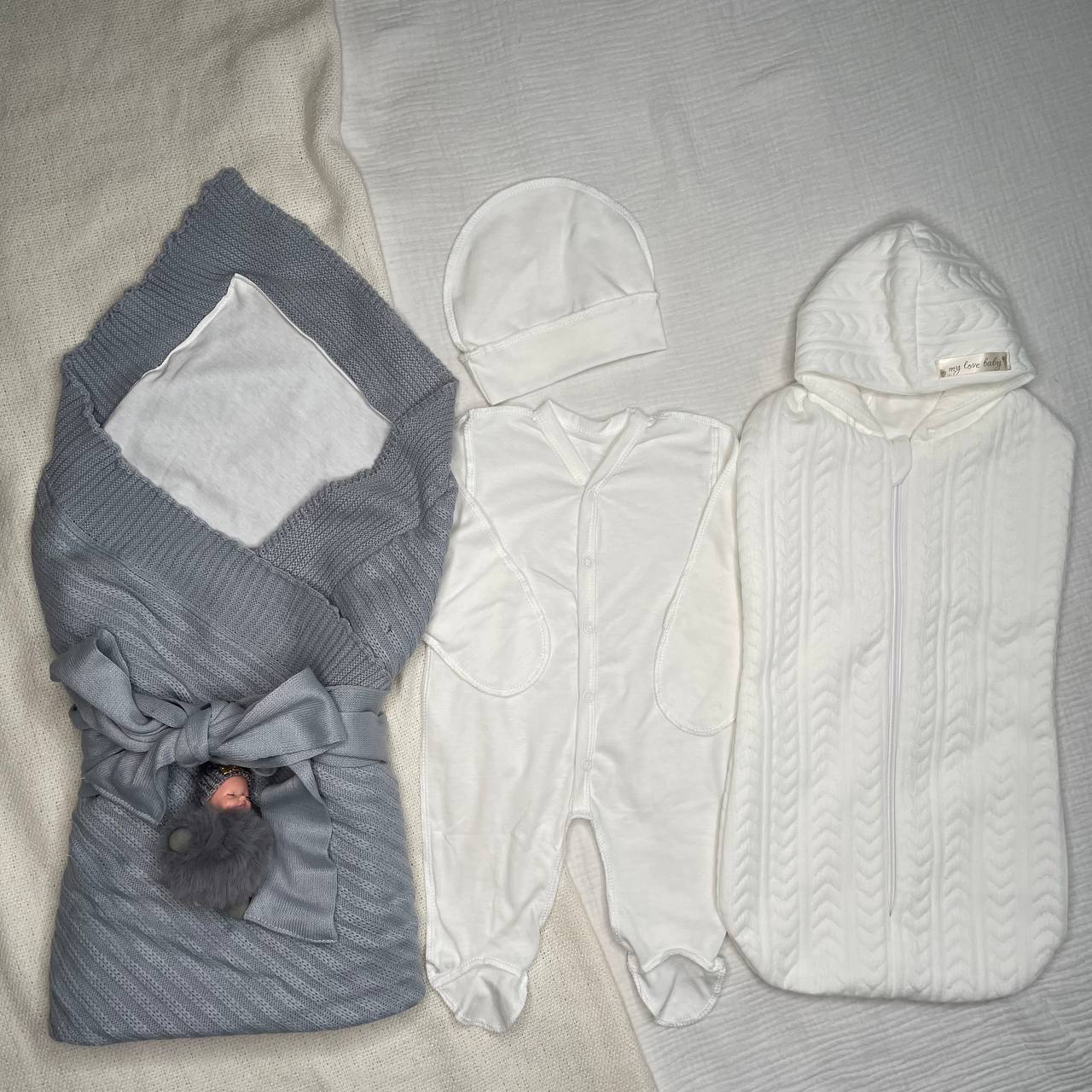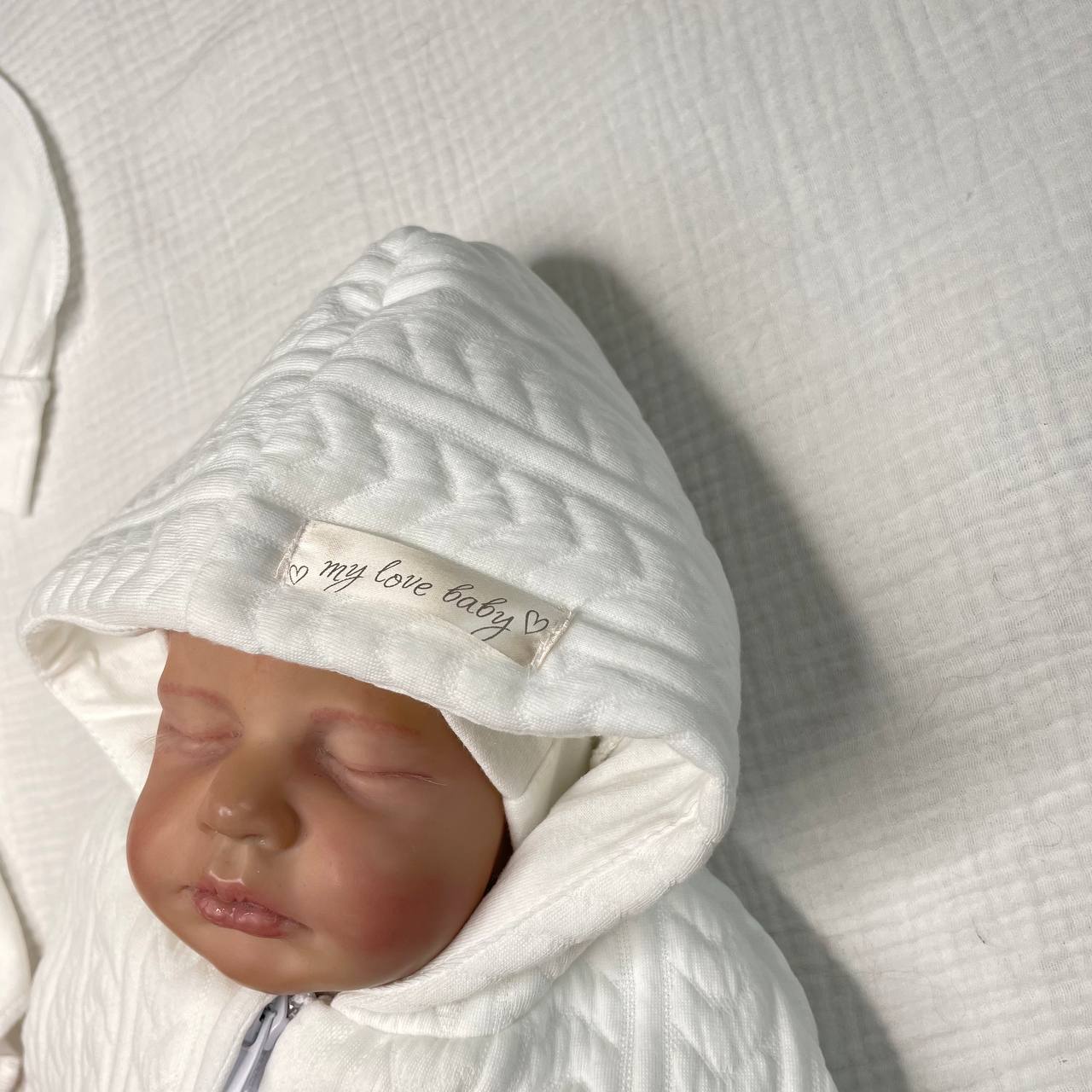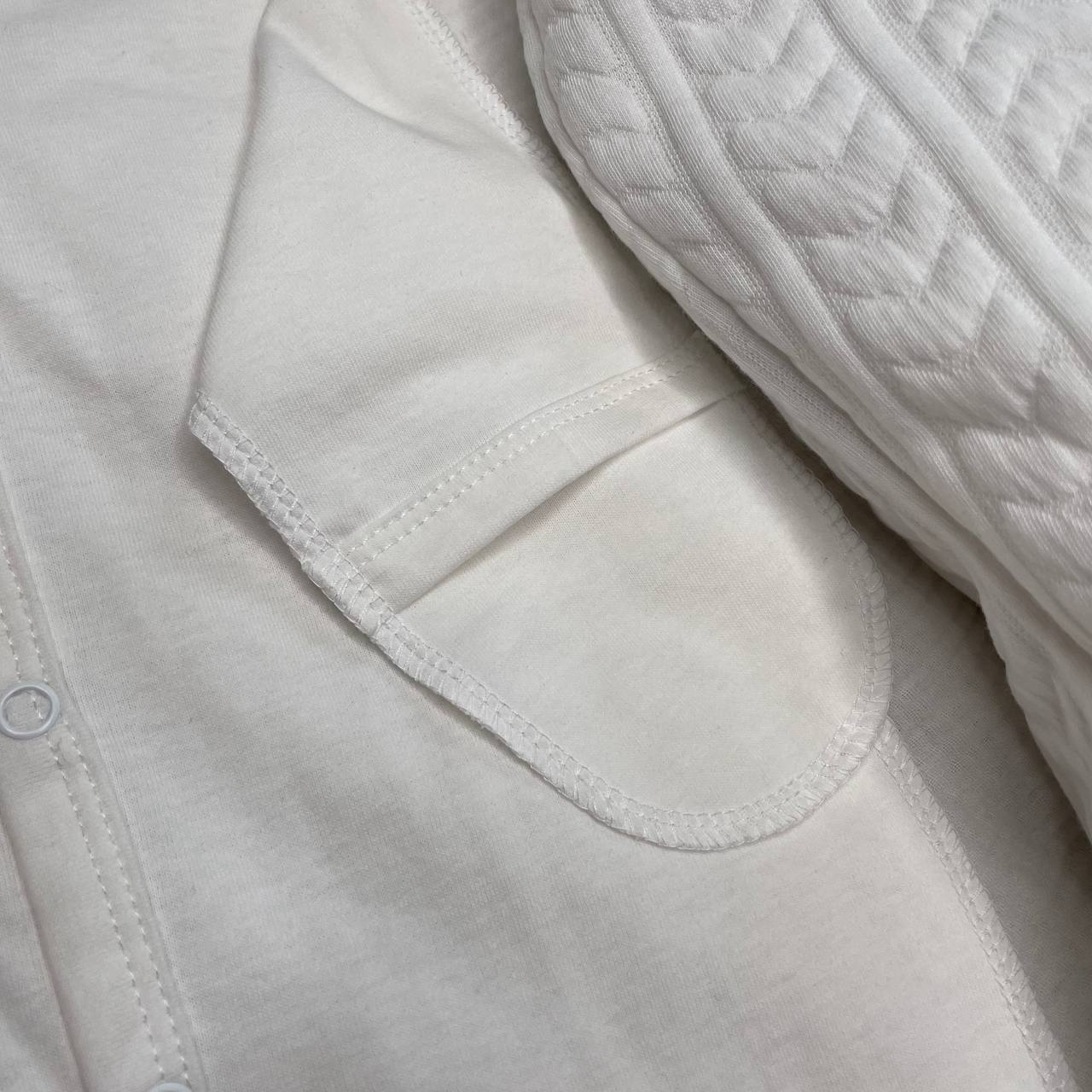 2. Пеленка-кокон с капюшоном, на молнии. С подкладом из 100% хлопкового трикотажа внутри и красивой рельефной ткани капитоний косичка белого цвета. Размер на рост 0-3 мес