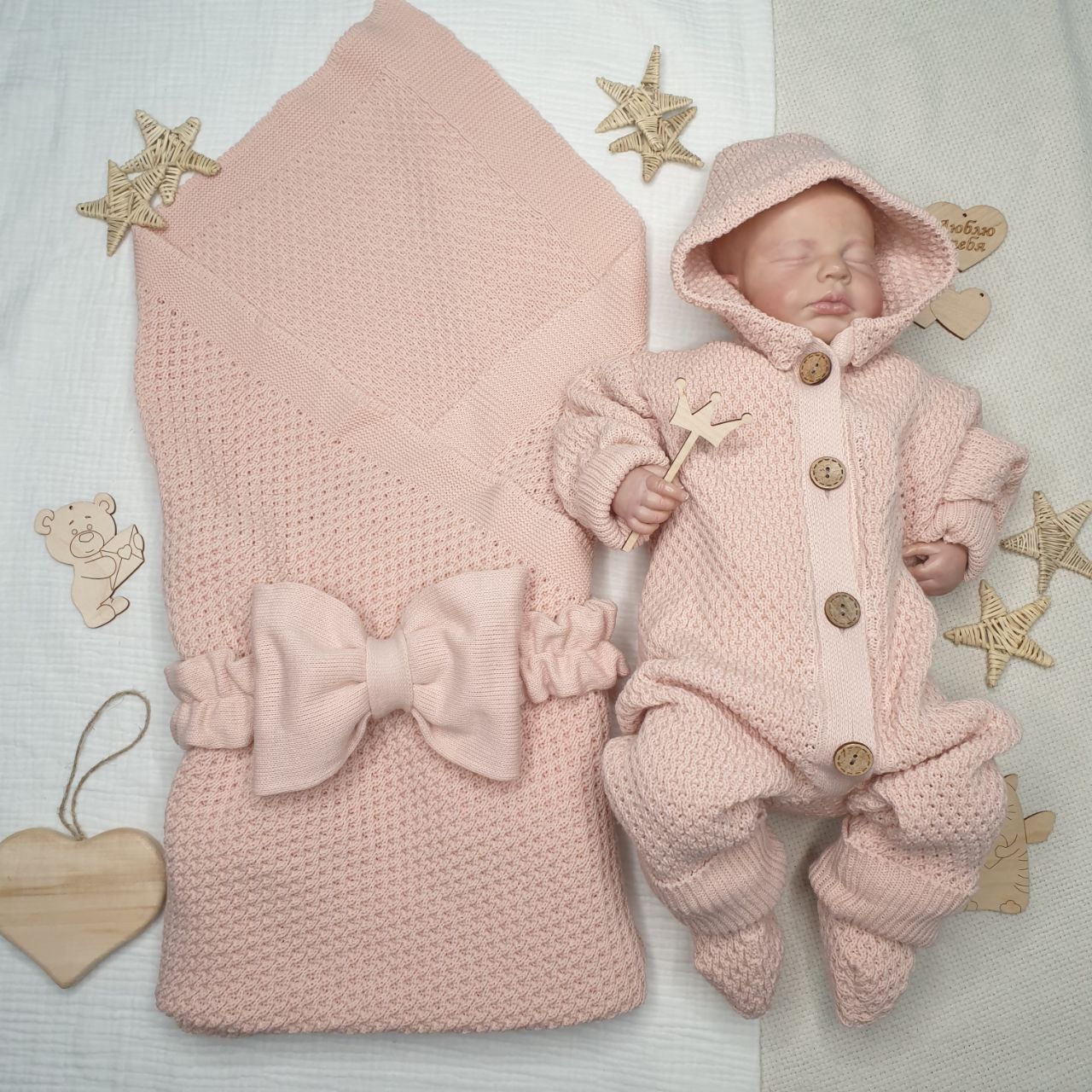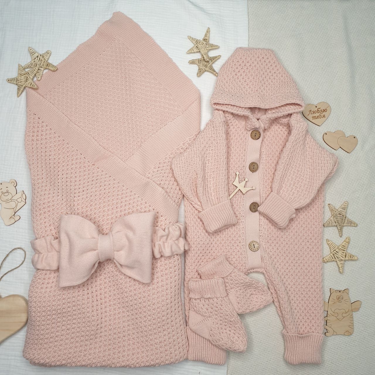 КВ-102 Вязаный комплект на выписку в пудровом цвете.