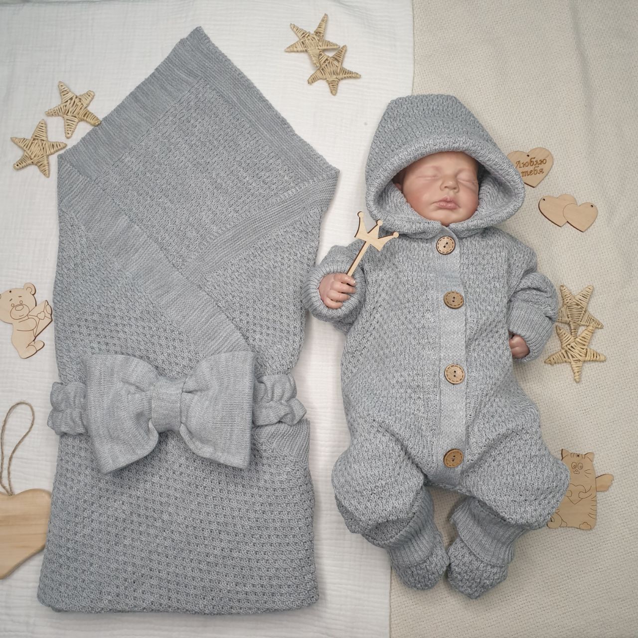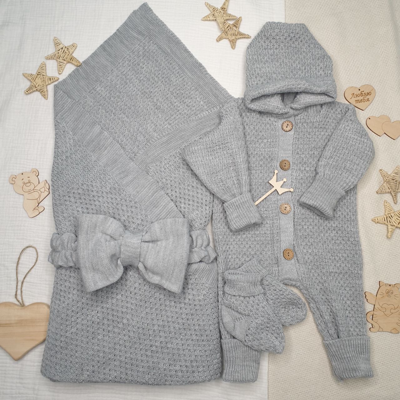 КВ-102 Вязаный комплект на выписку в сером цвете.