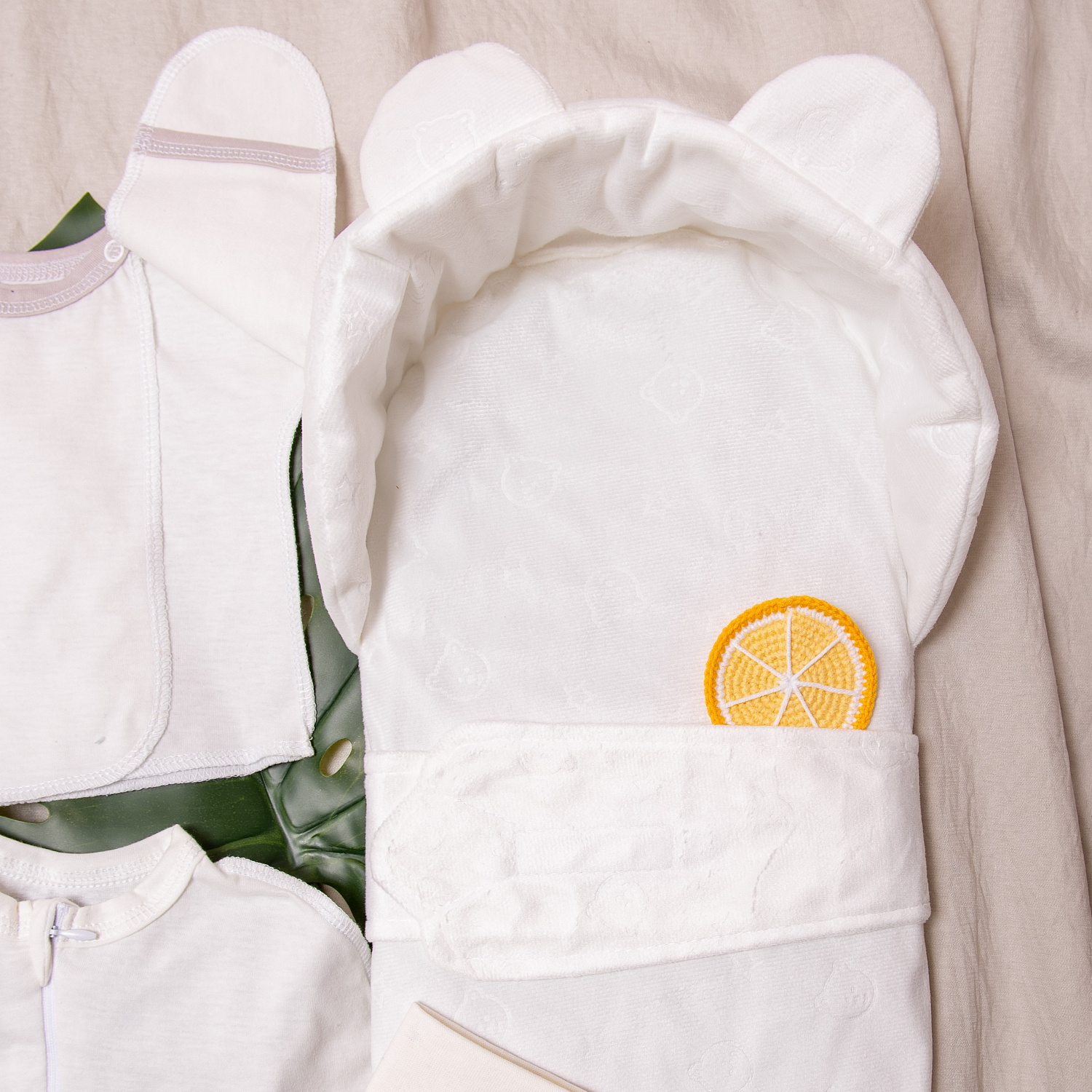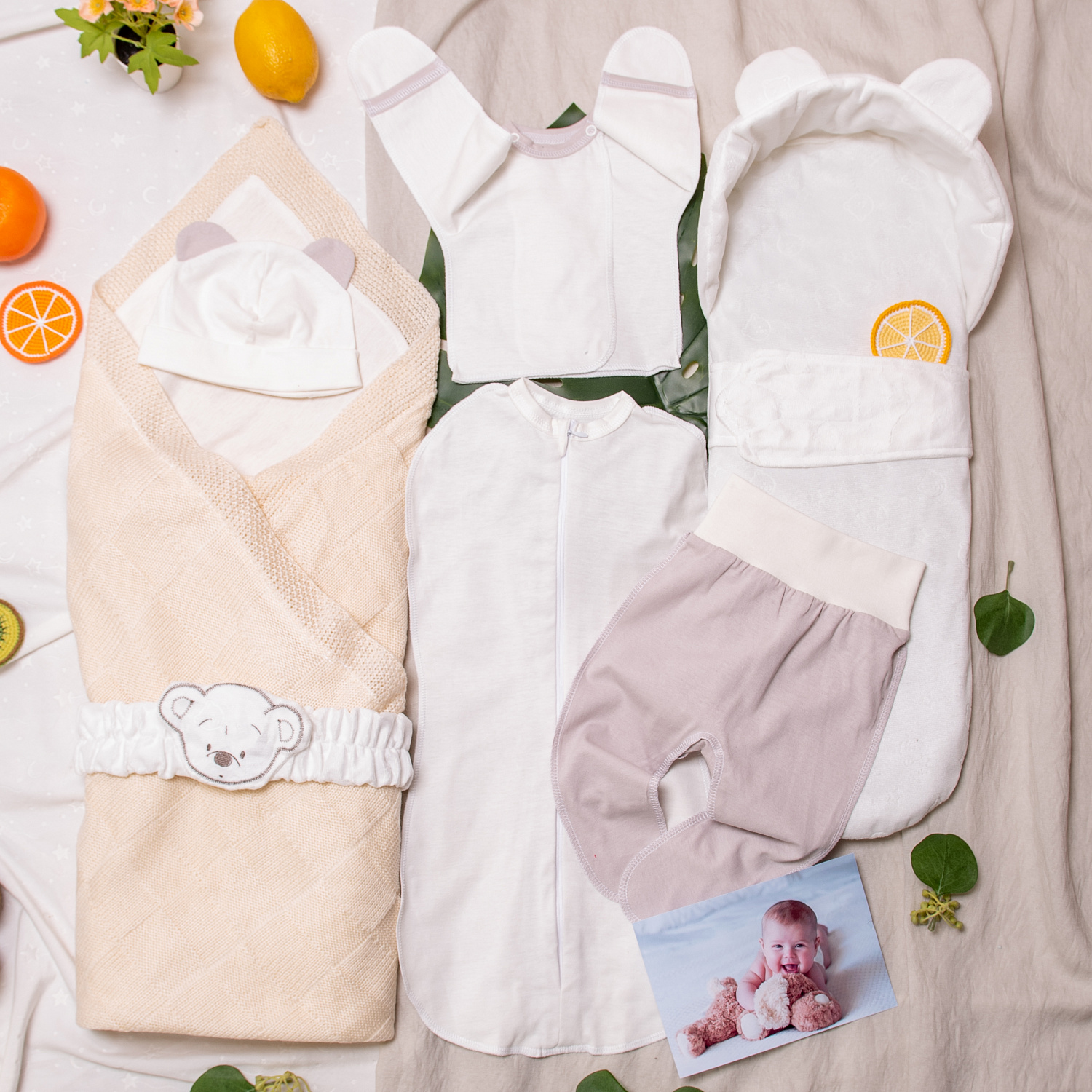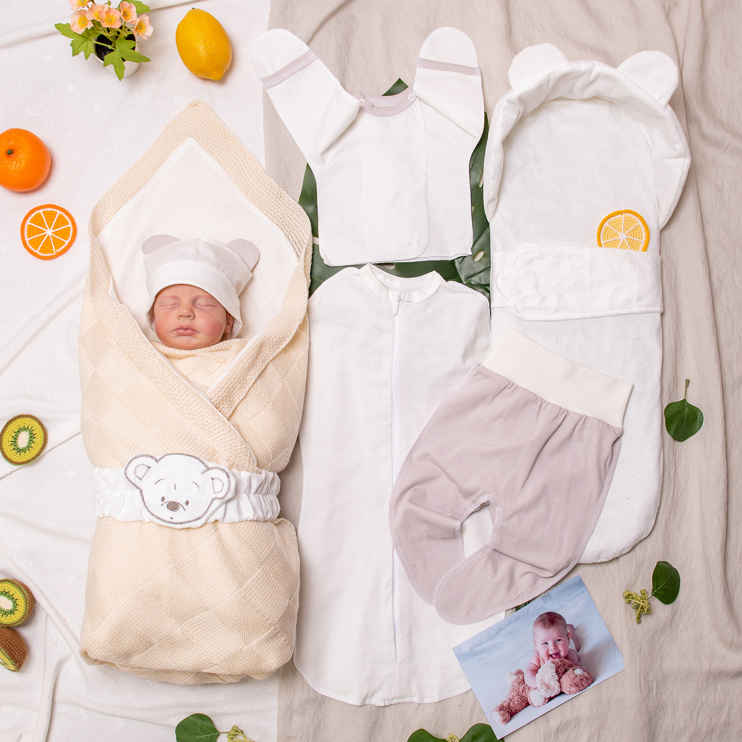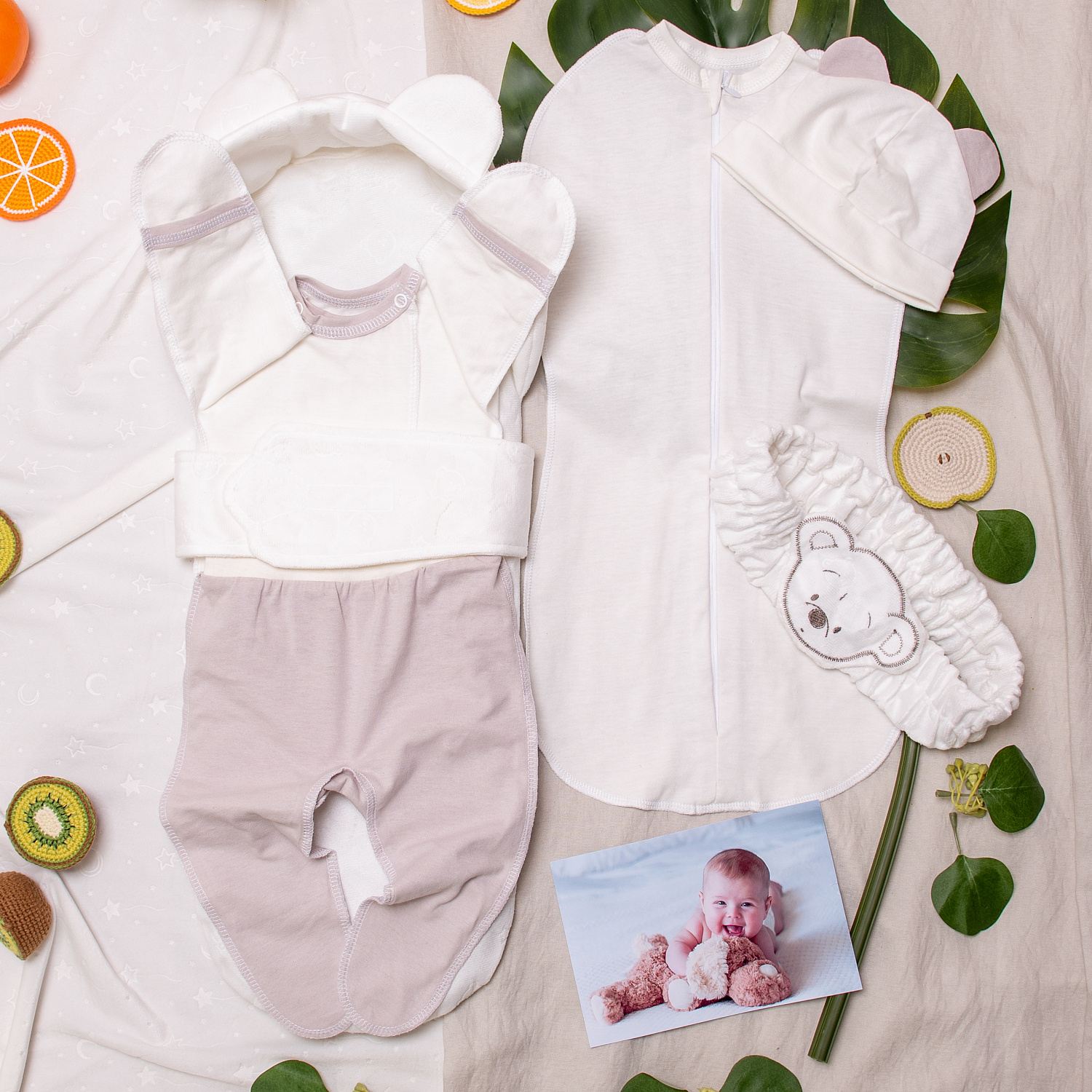 В комплект мы подобрали ползунки на широком эластичном поясе, распашонку на двух кнопках с антицарапками, шапочку с забавными ушками и кокон-пеленку на молнии, в которой малышу будет уютно спать на прогулке или дома. Сшиты из хлопкового кулирного трикотажа.