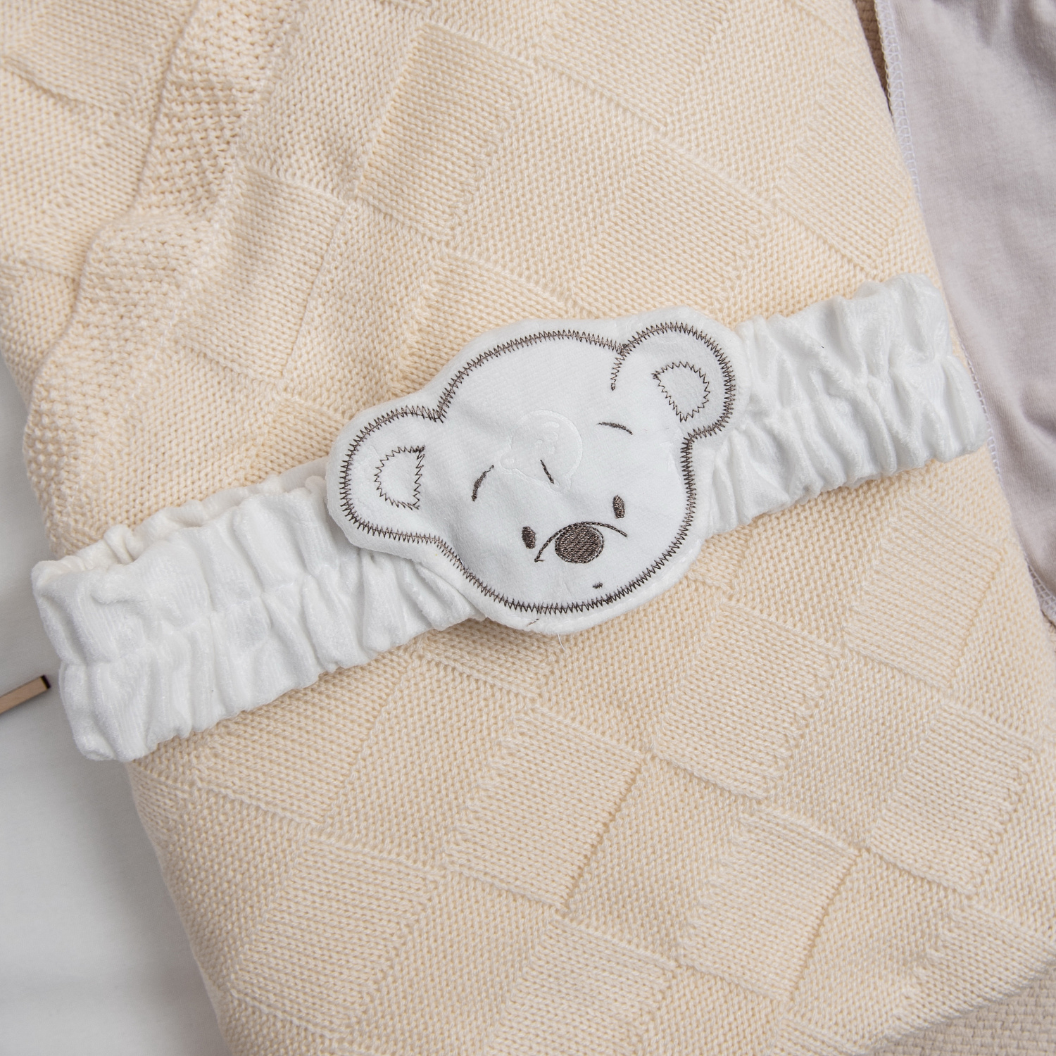 Акцентом этого комплекта на выписке станет мягкий вязаный плед, в который вы завернёте малыша и пояс с вышивкой-аппликацией "мишка". Плед на подкладке из хлопкового кулирного трикотажа.