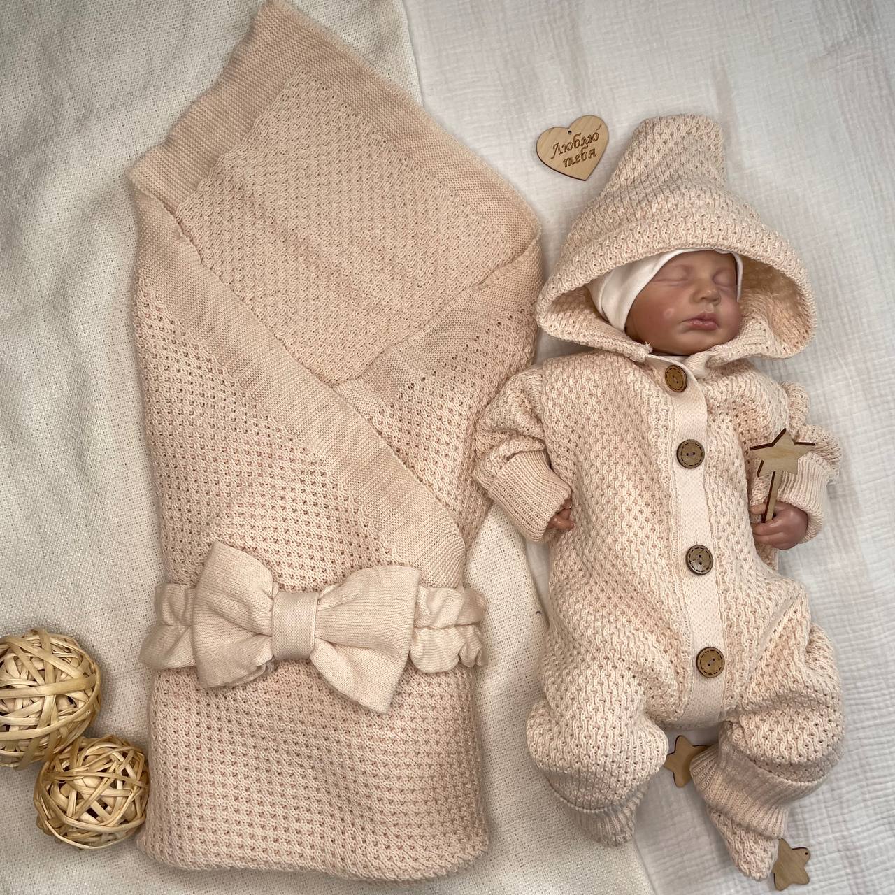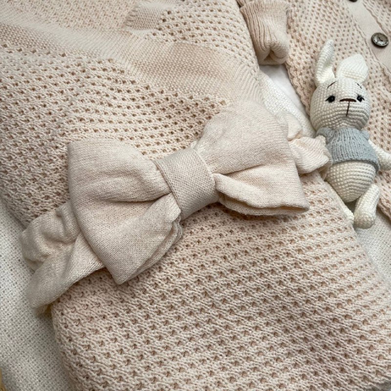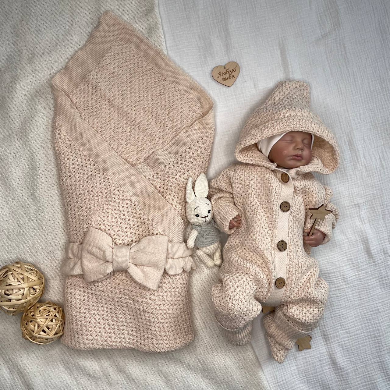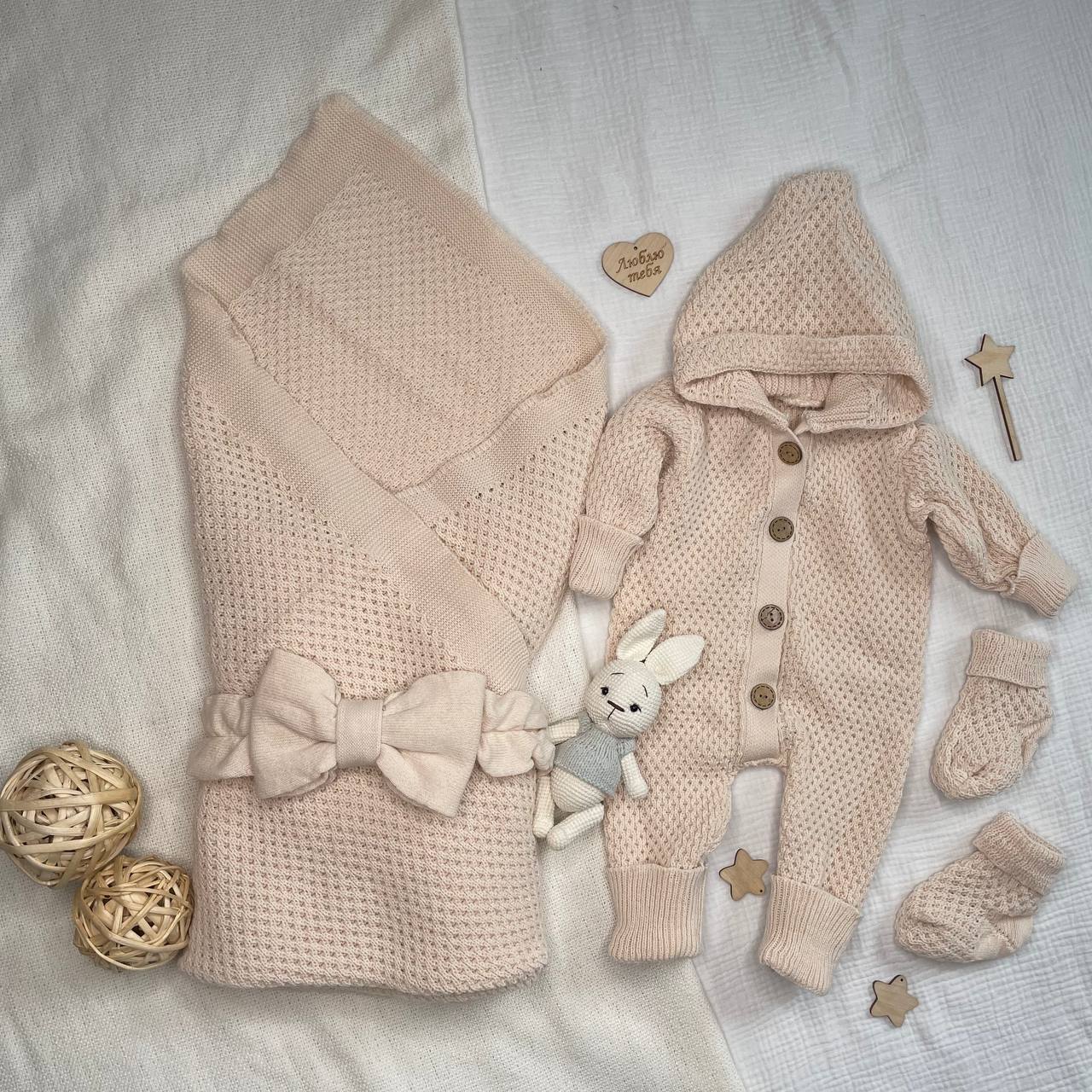 КВ-102 Вязаный комплект на выписку в бежевом цвете. Упакован в тубус.