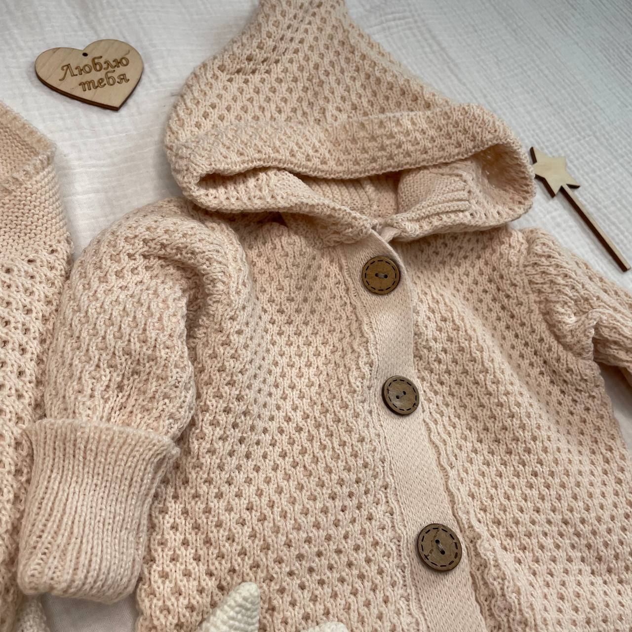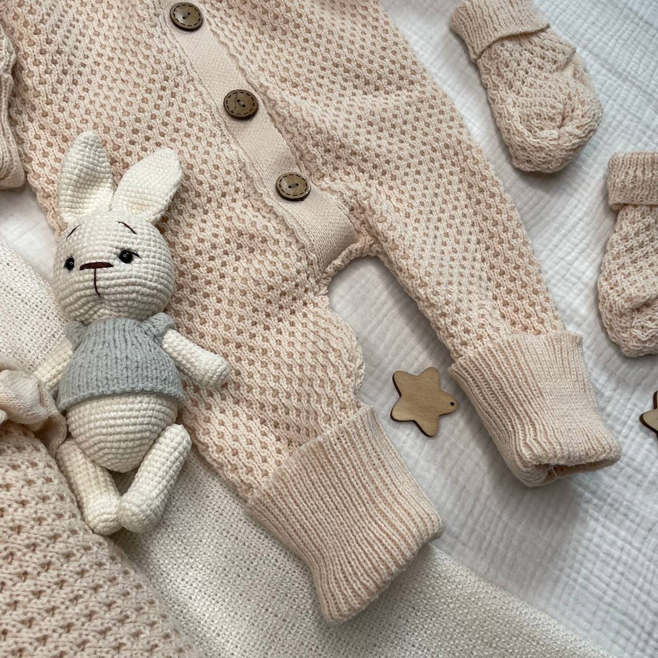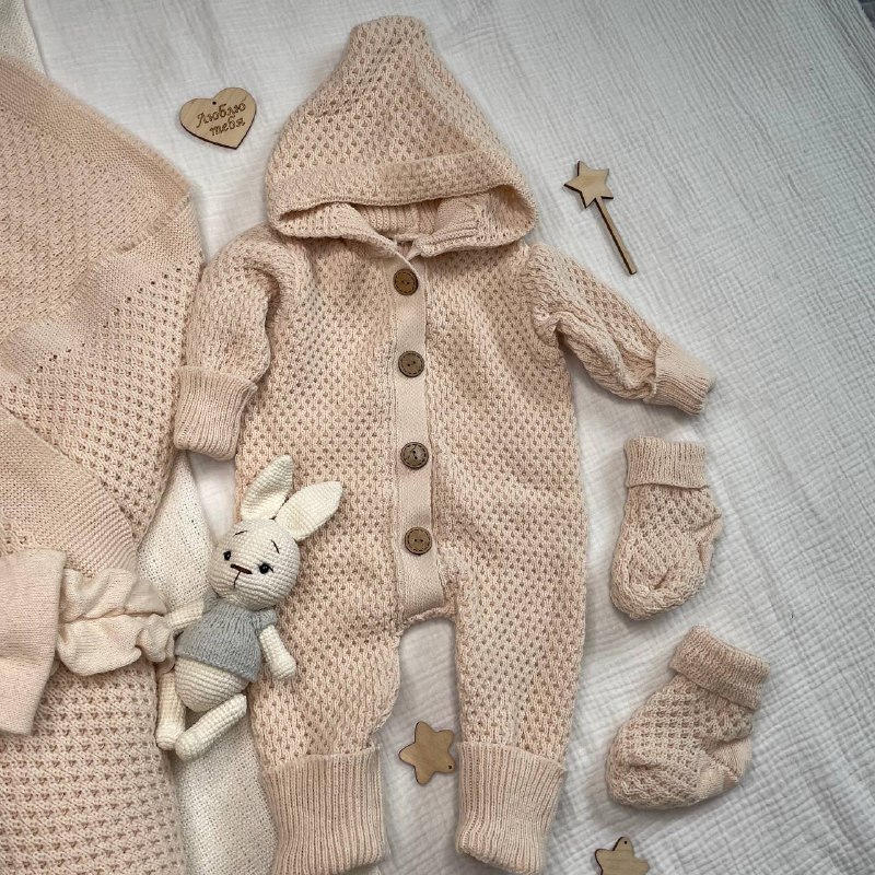 2.Комбинезон вязаный с капюшоном . На деревянных пуговицах, растущие манжеты. р-р 56/62