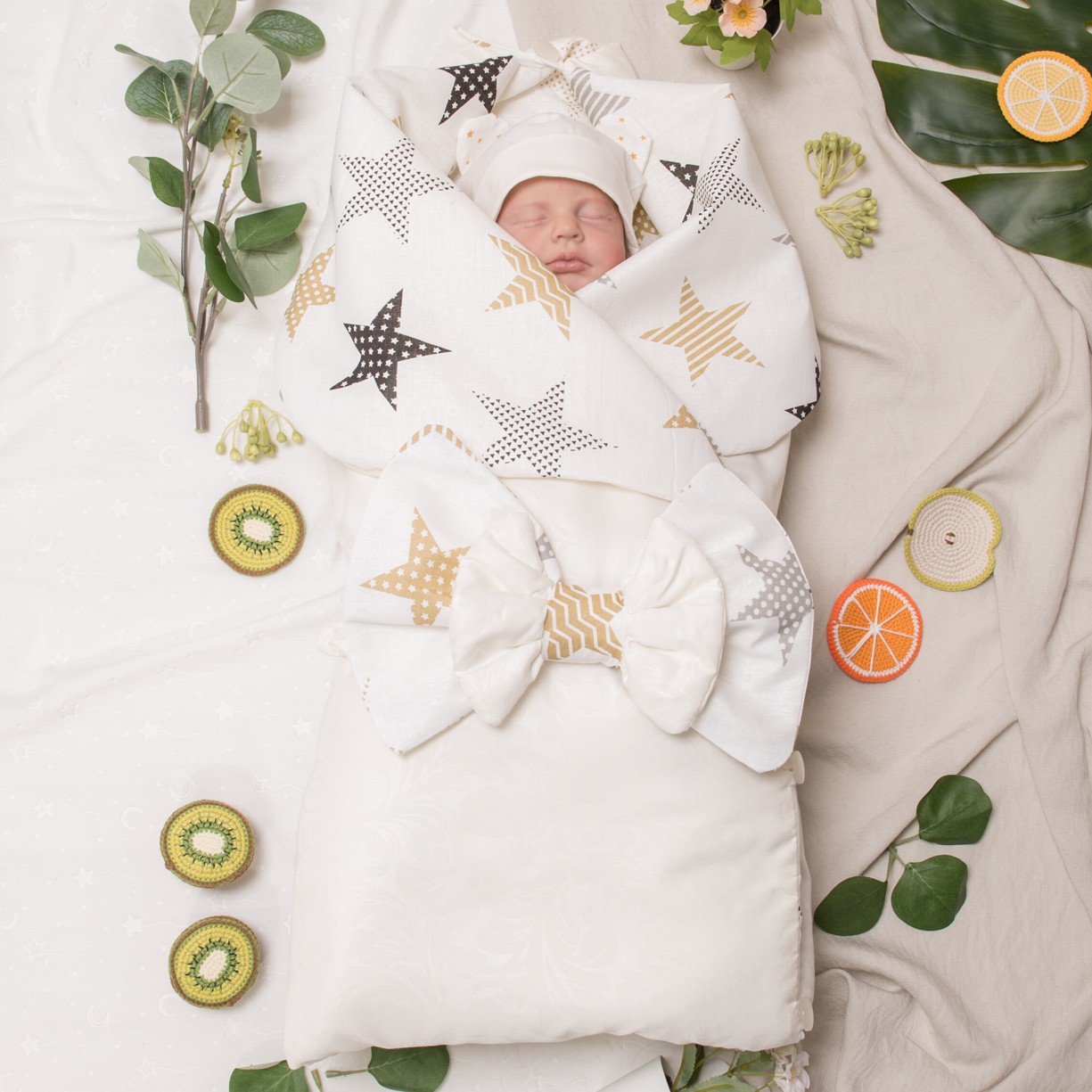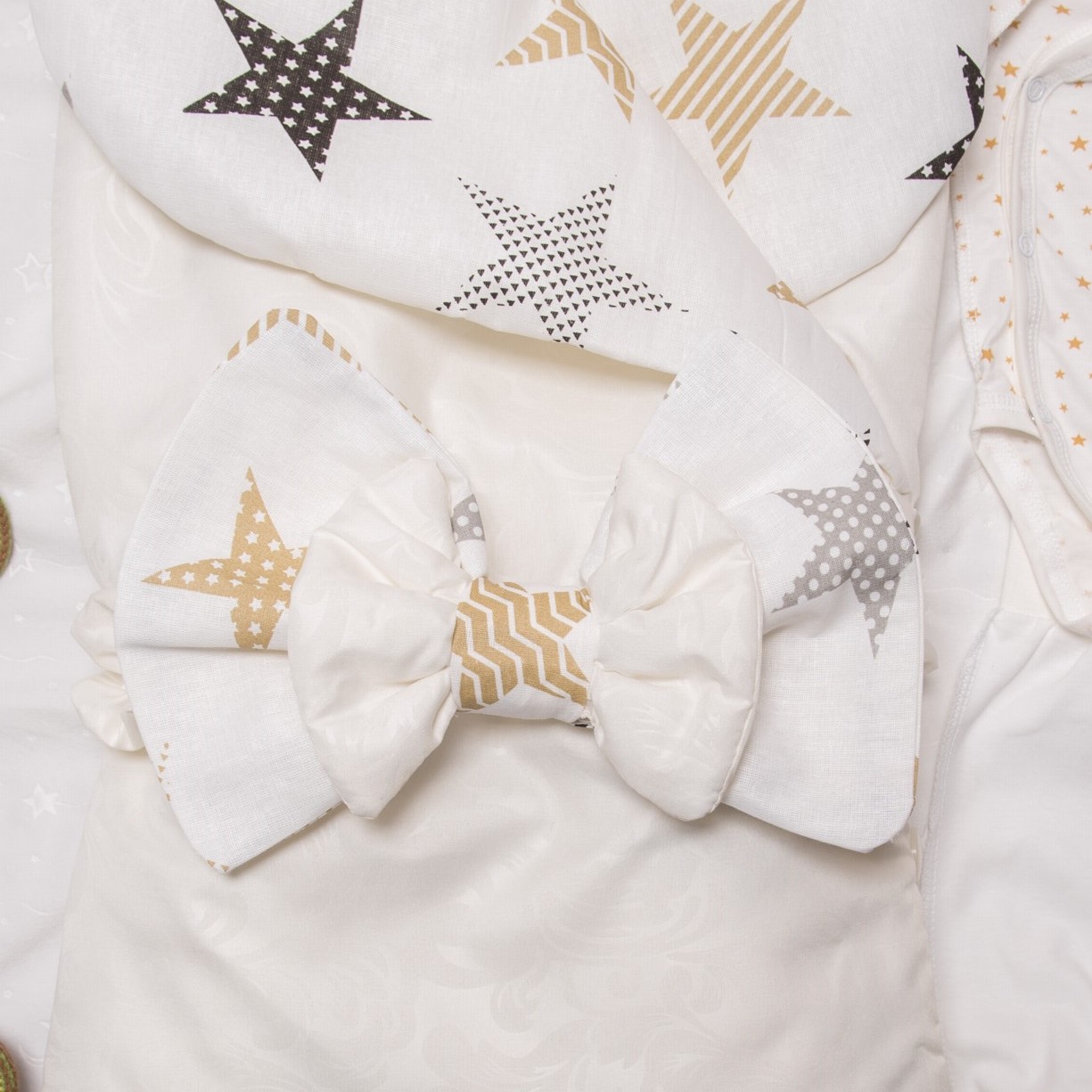 Одеяло-конверт на четырех пуговках выполнено из ткани прессатин молочного цвета, утеплено современным технологичным утеплителем холстон. Внутренняя сторона – хлопковый поплин с принтом «звёзды».