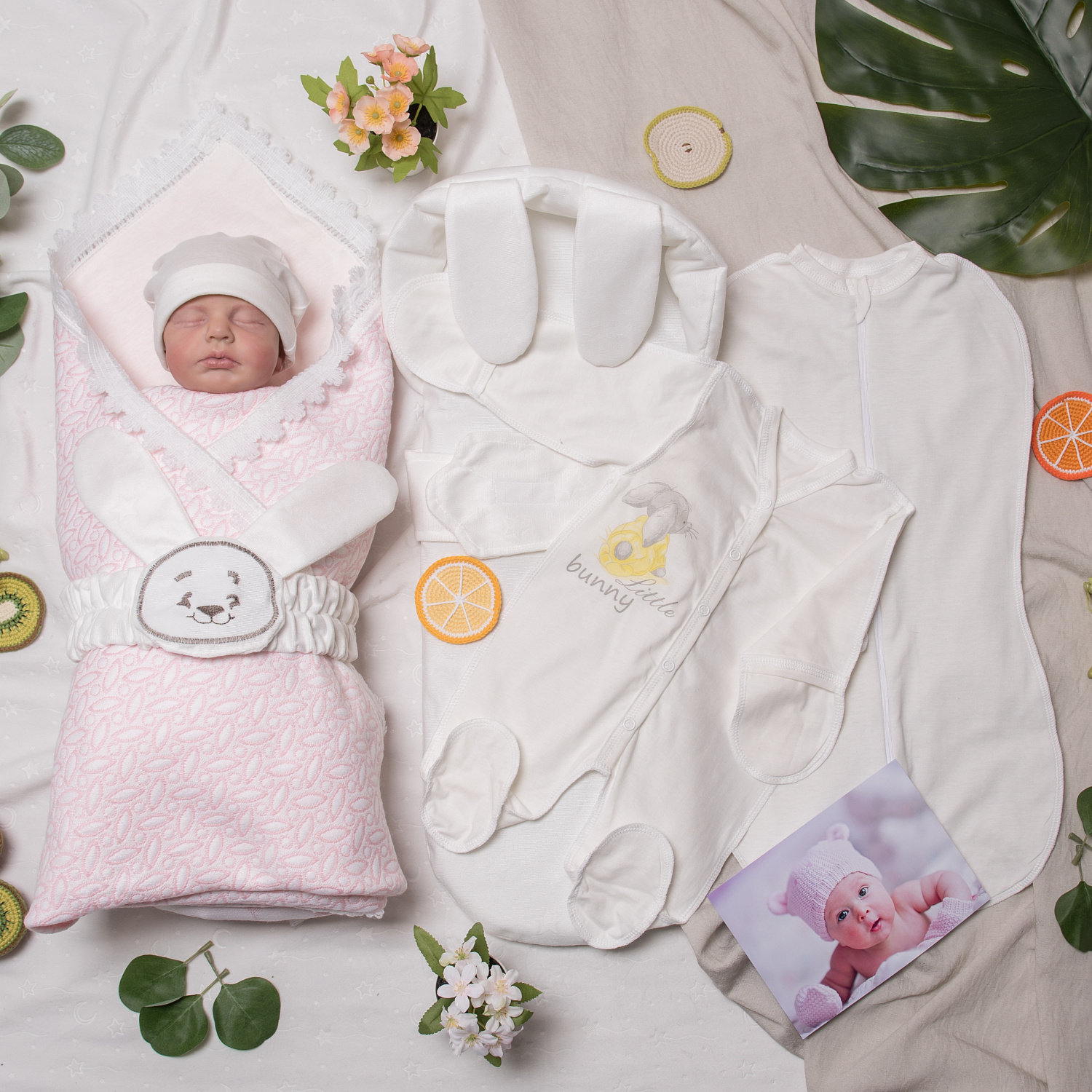 Классный летний комплект с богатым наполнением, в состав входит подложка с ушками зайки для удобной переноски малыша, кокон на молнии (кулирка-хлопок 100%, комбинезон-трансформер (кулирка-хлопок 100%) , шапочка (кулирка-хлопок 100%) и прекрасный турецкий плед который фиксируется поясом с вышивкой.