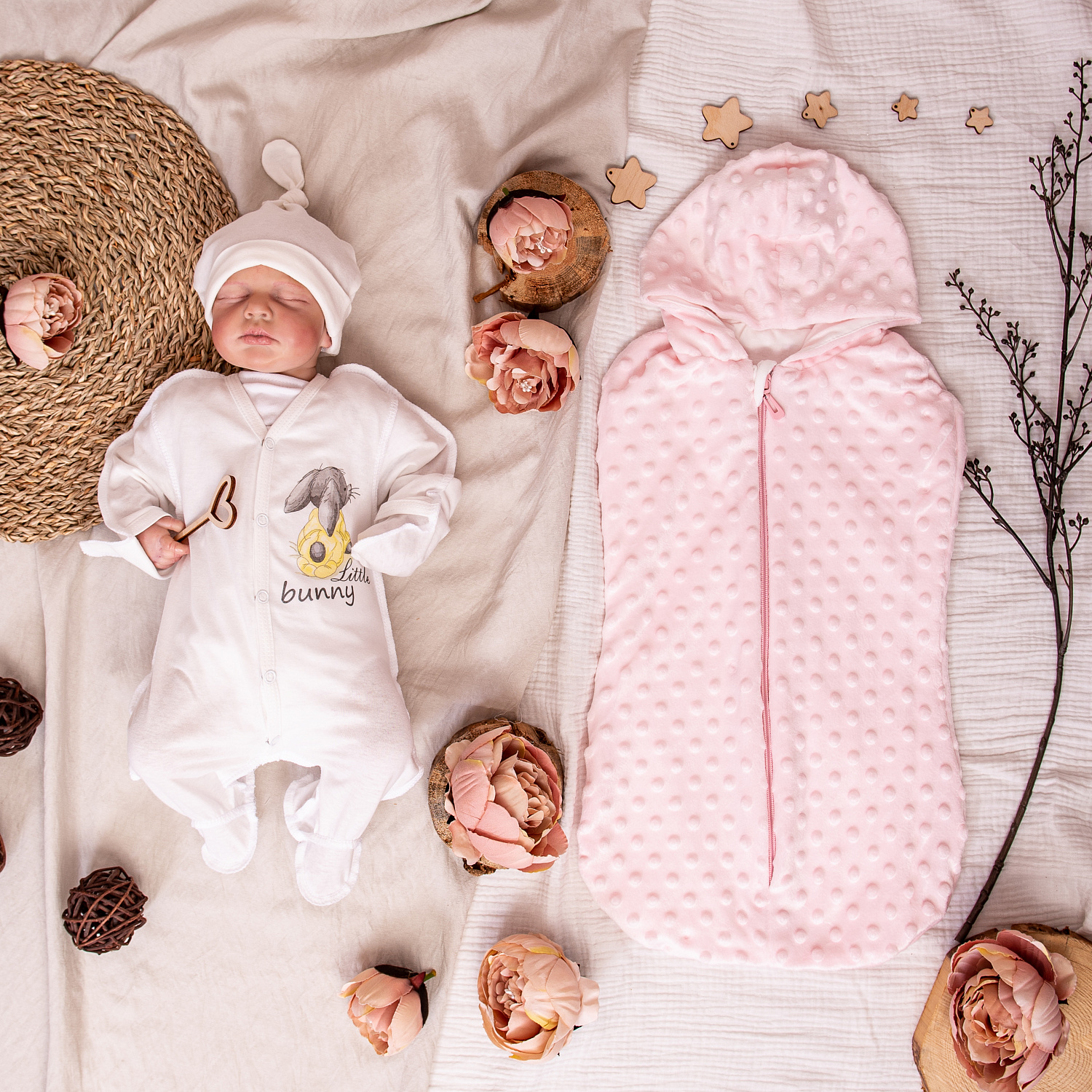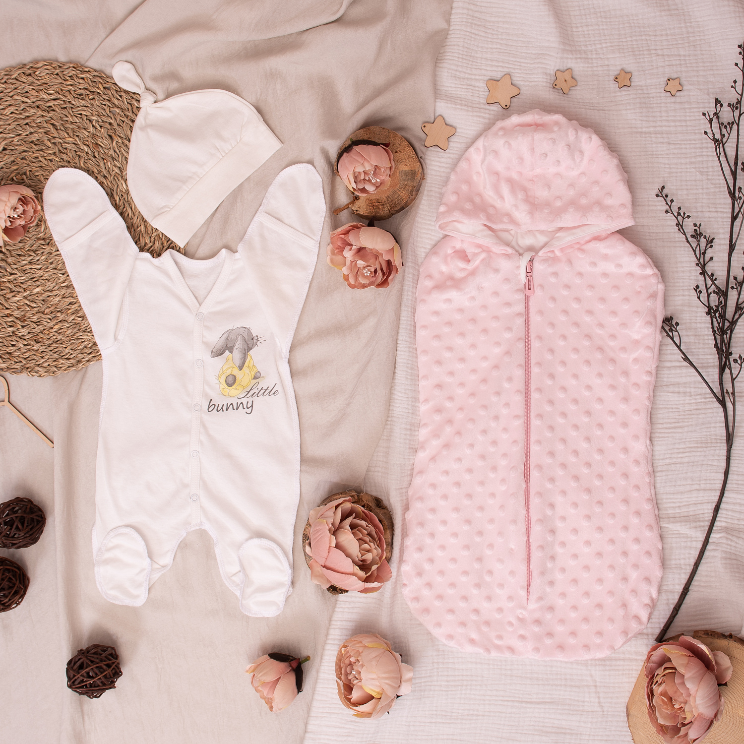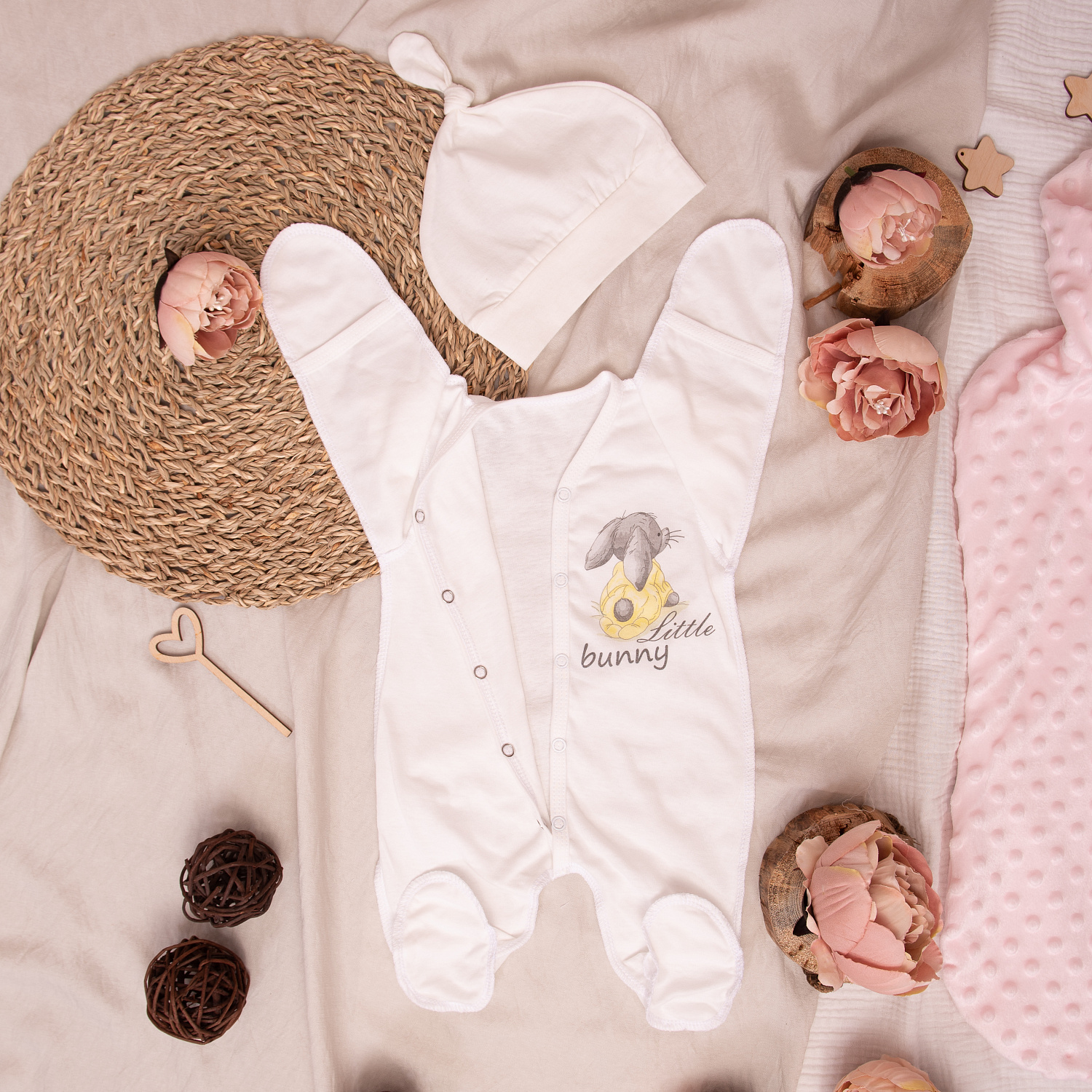 К комбинезону-слипу в комплекте шапочка с ушками.