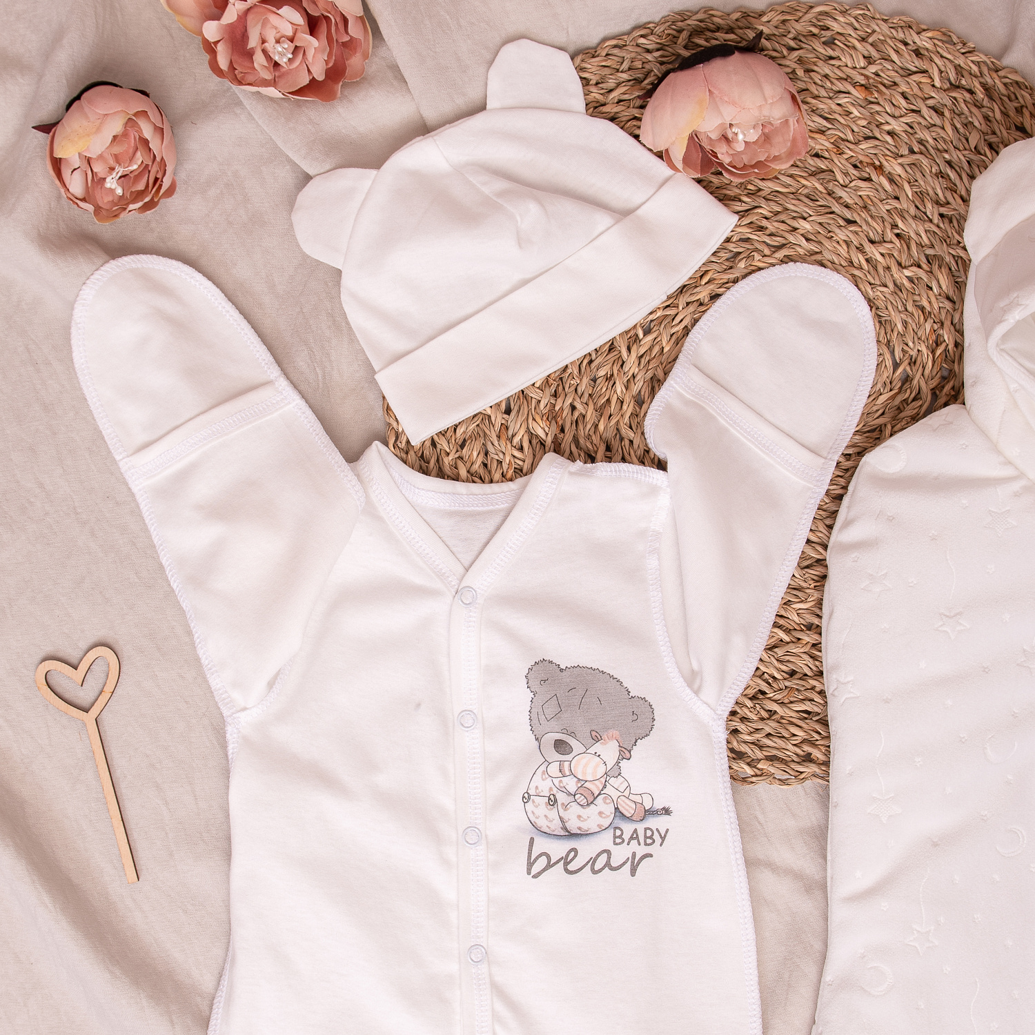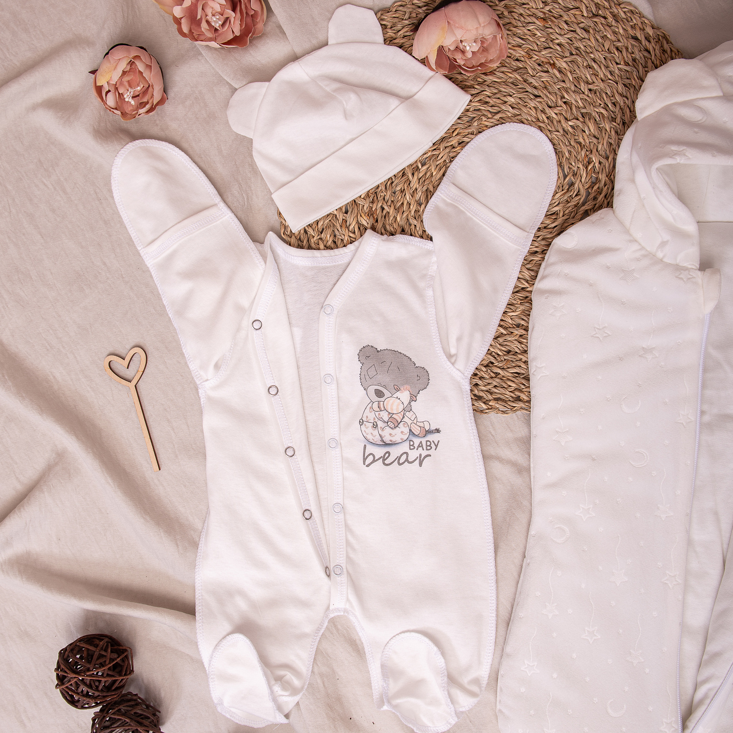 Арт. М-466 Комбинезон-слип на кнопках для новорожденных и малышей для первых месяцев жизни. Комбинезон с принтом "Мишка" создаёт настроение, малыши на фото получаются особенно милыми. Такой слип лучше всего подходит для выписки из роддома. Мягкий, лёгкий хлопковый кулирный трикотаж идеально подходит для нежной кожи младенца. Все швы выполнены наружу, на рукавах предусмотрены отвороты-антицарапки. Кнопочки помогают быстро одеть-раздеть малыша.