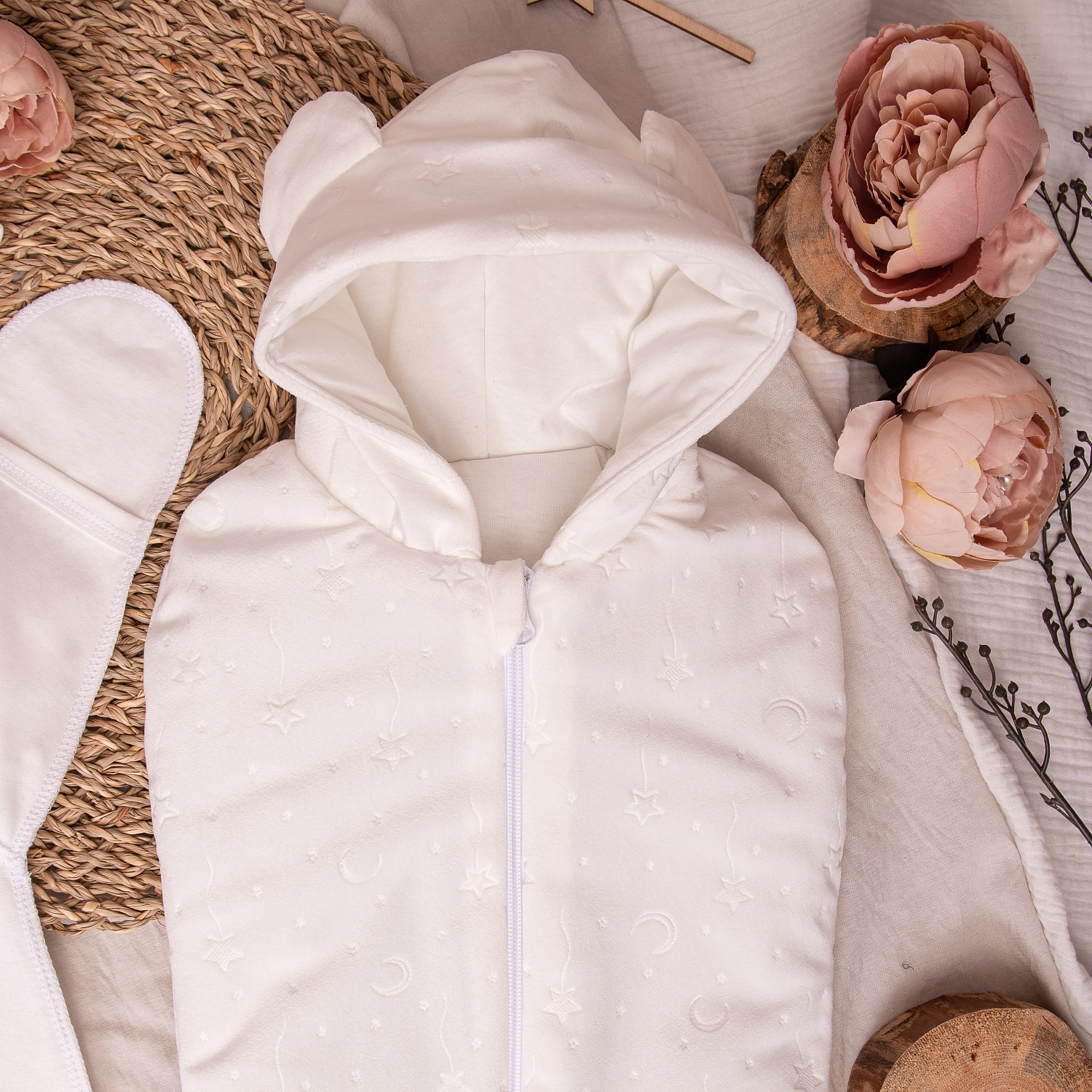 Мягкий тёпленький кокон-пеленка для прохладного времени года. Идеально подойдет для прогулок в коляске. Белый цвет выглядит нарядно и подойдёт и мальчику и девочке. Пелёнка-кокон сшита из мягкого ворсового трикотажа вельбоа с теснением "звёздочки". Внутренний слой - 100% хлопковый кулирный трикотаж. Между верхом и подкладкой проложен современный гипоаллергенный утеплитель холстон 100г/кв.м в один слой.