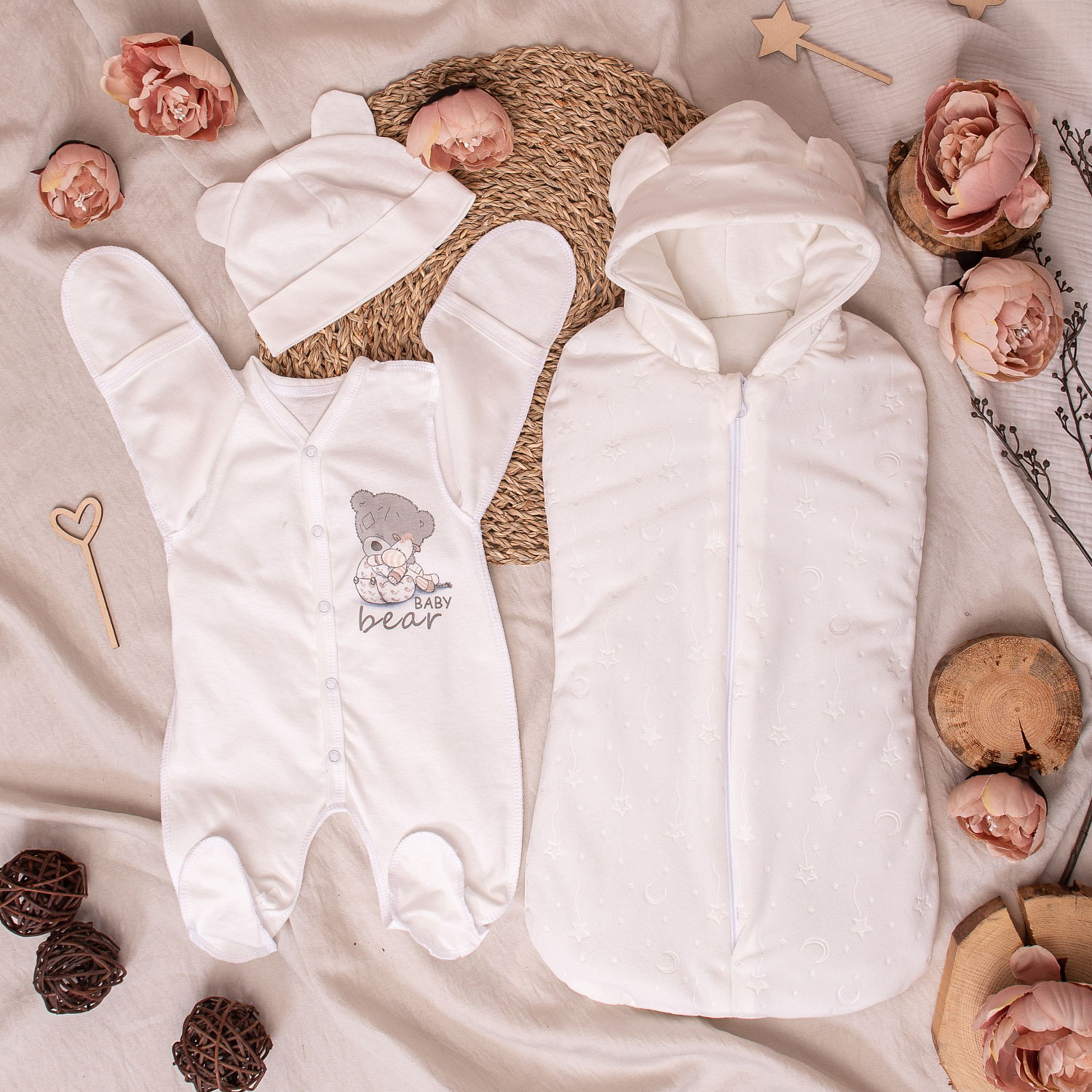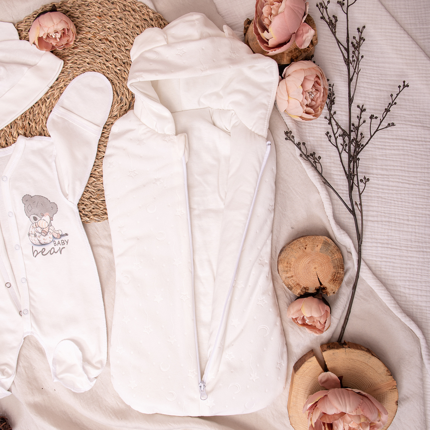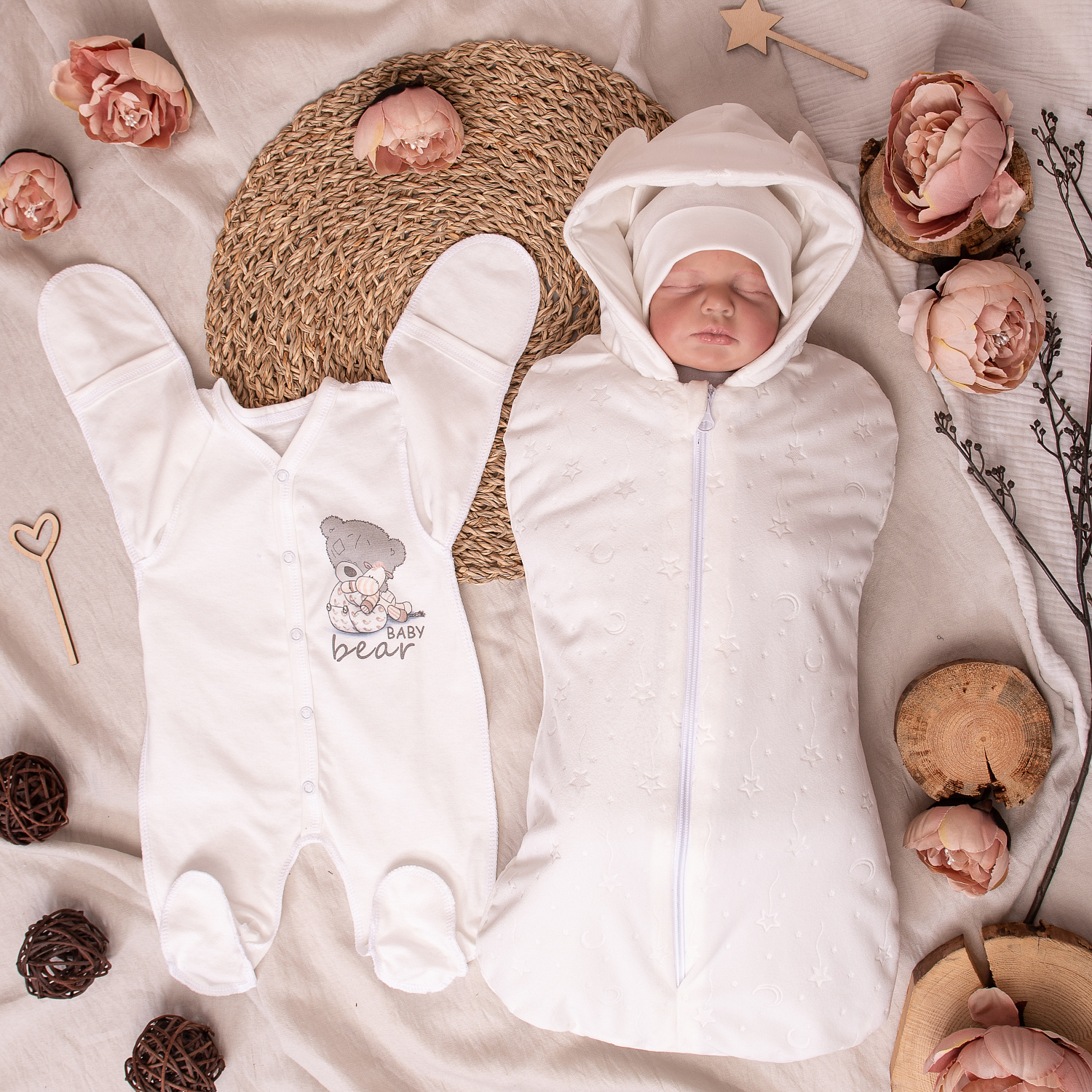 Мягкий тёпленький кокон-пеленка для прохладного времени года. Белый цвет выглядит нарядно и подойдёт и мальчику и девочке.