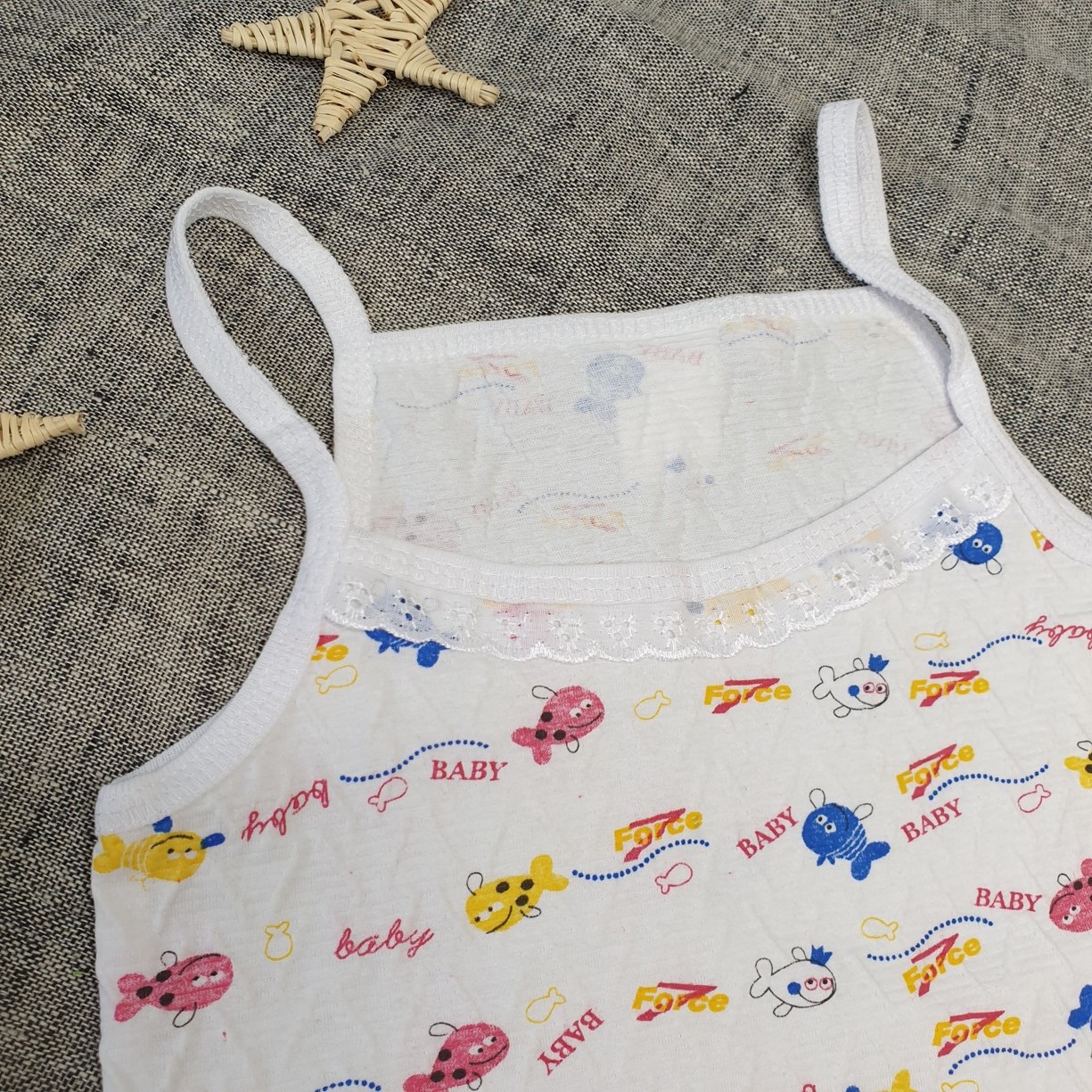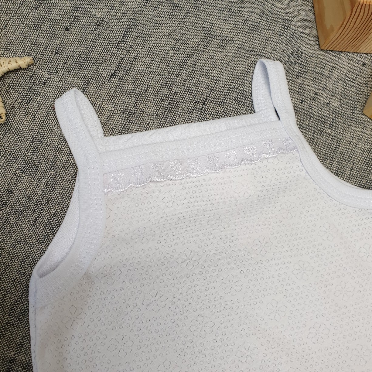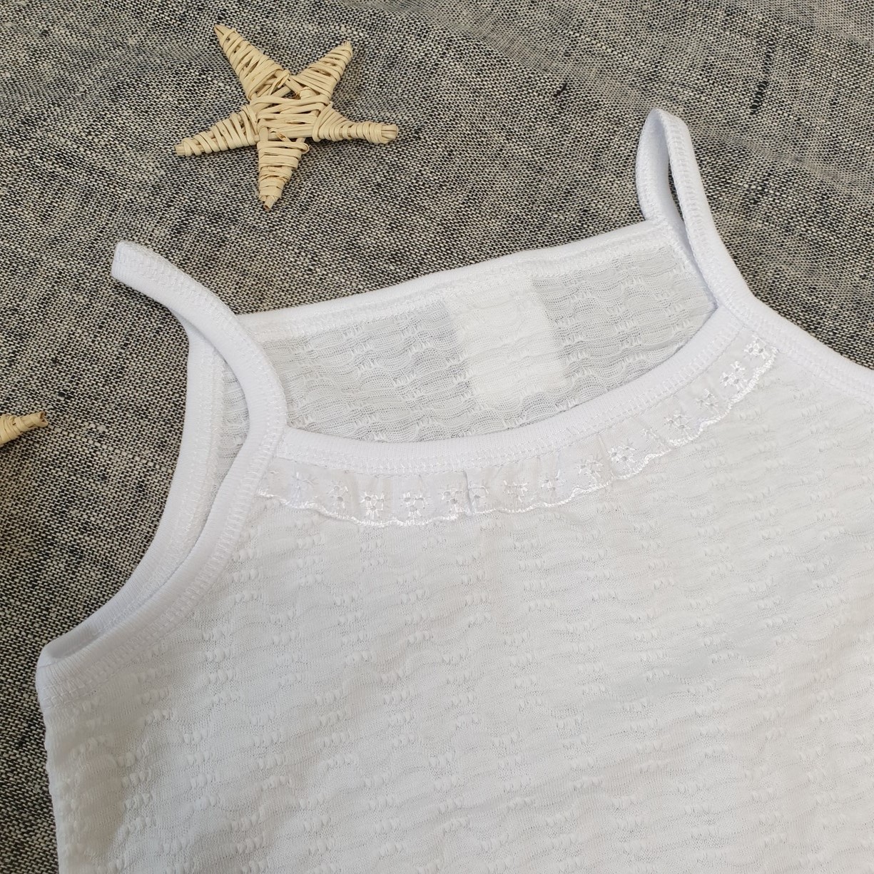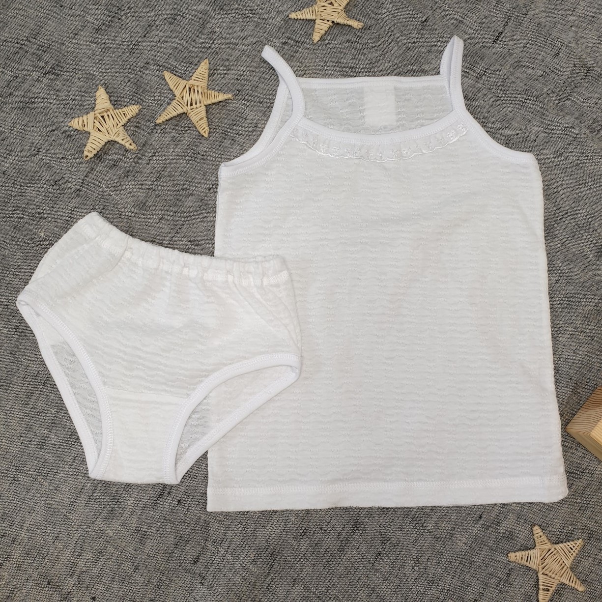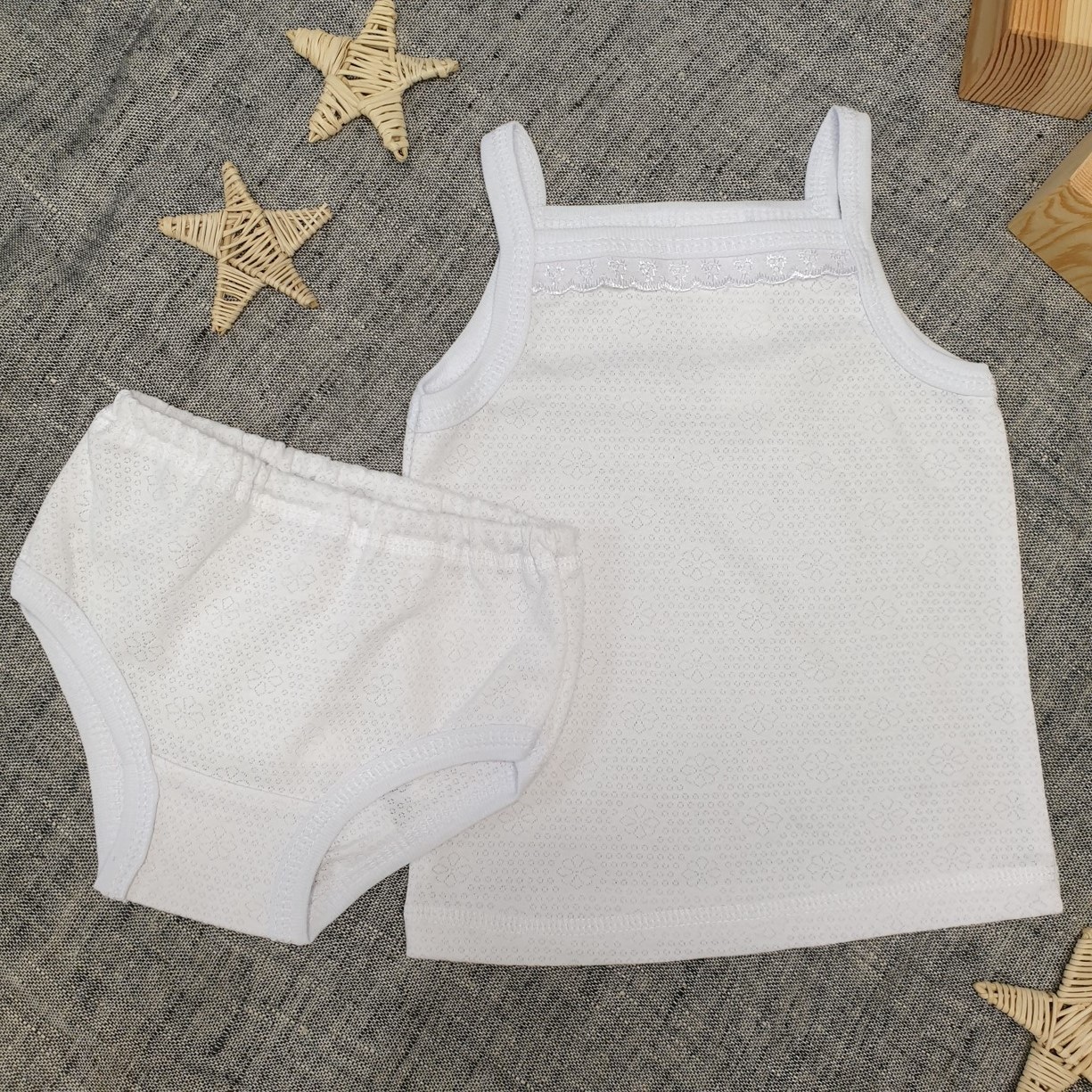 Комфортная маечка с отделкой шитьём на тонких бретелях и трусики на резинке.