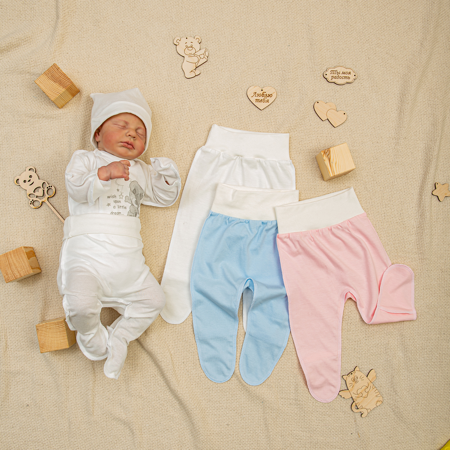 Удобные ползунки базовых цветов на широком мягком поясе. Они созданы специально для новорожденных. Цвета: молочный, голубой и розовый.