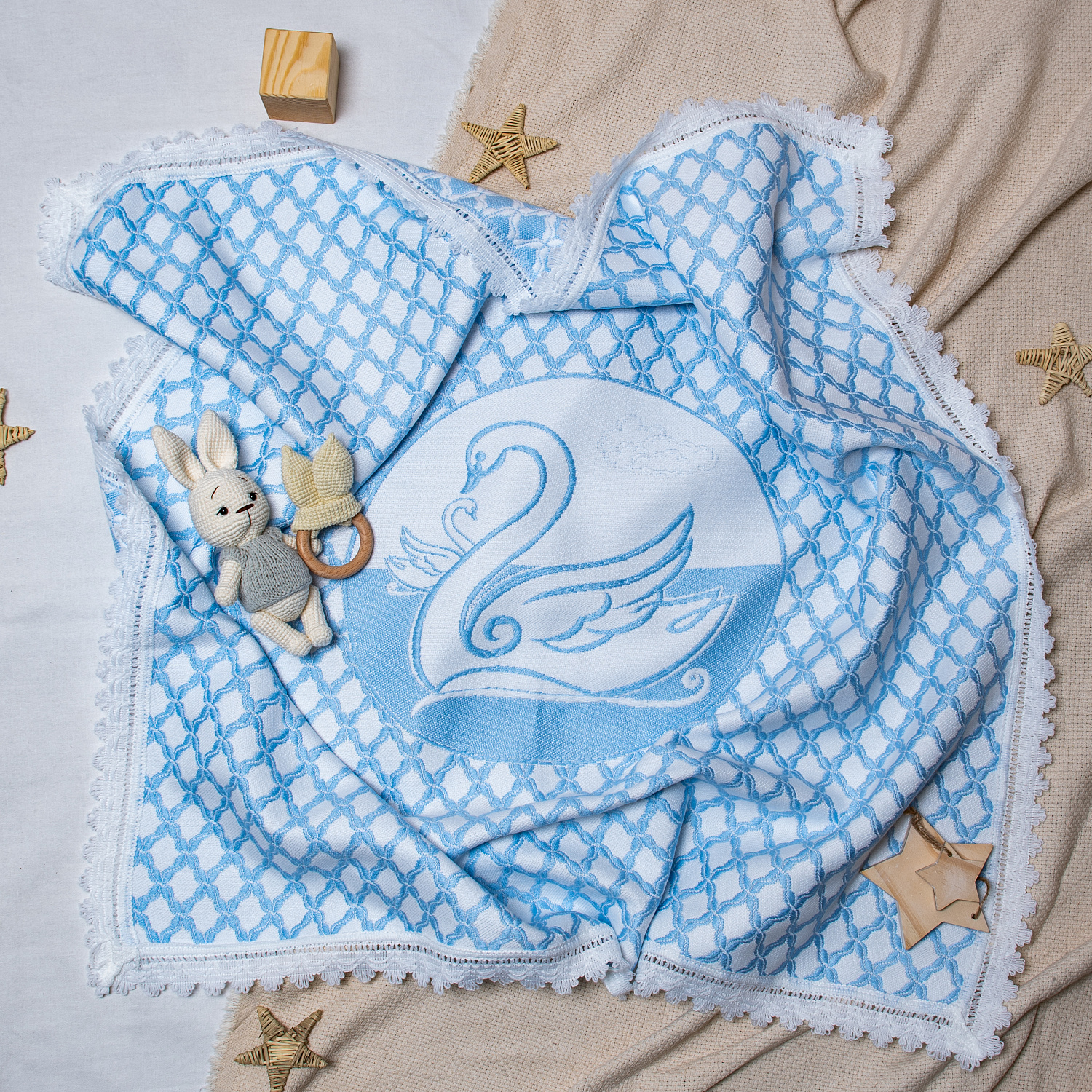Детский пледик нежный и романтичный. Край оторочен фестонным кружевом, Рельефный двухсторонний рисунок-лебедя на пледе.