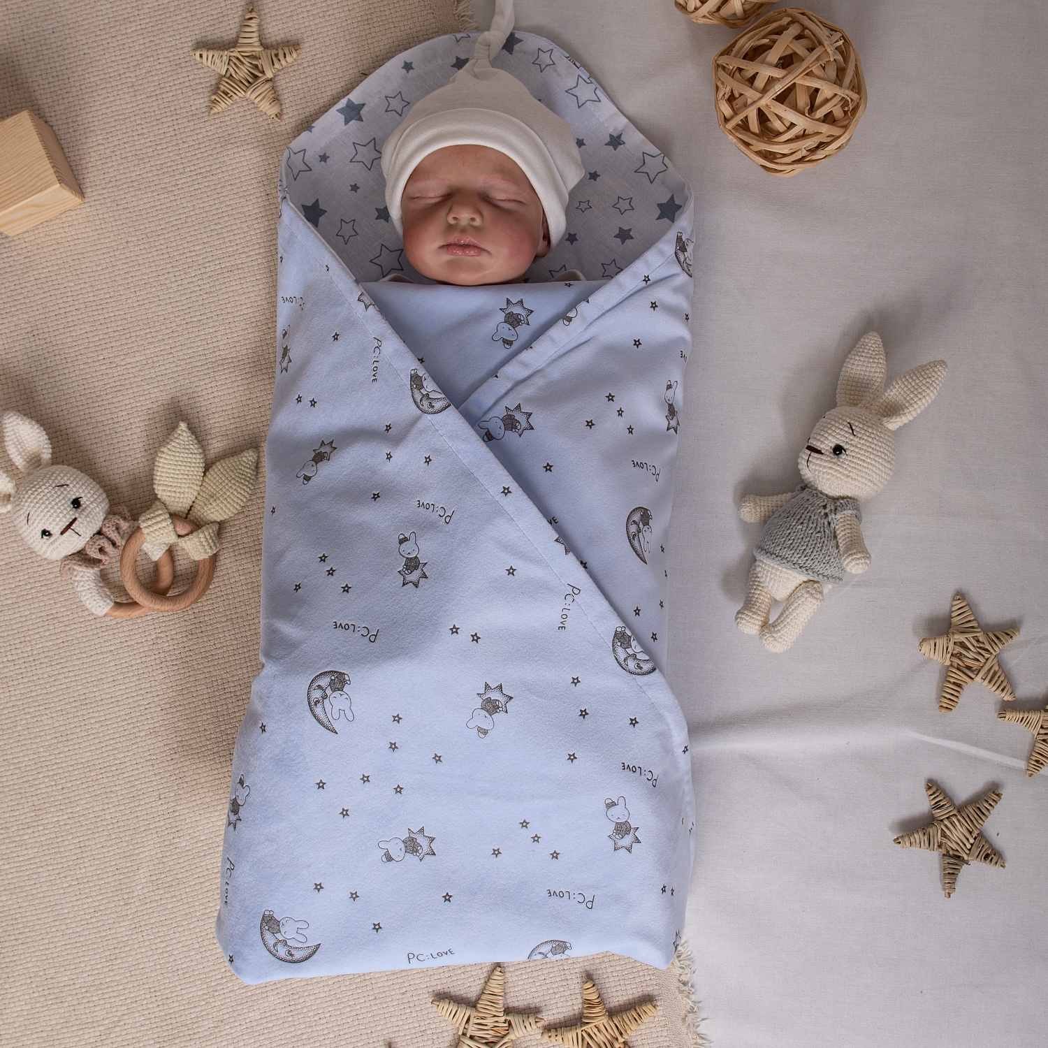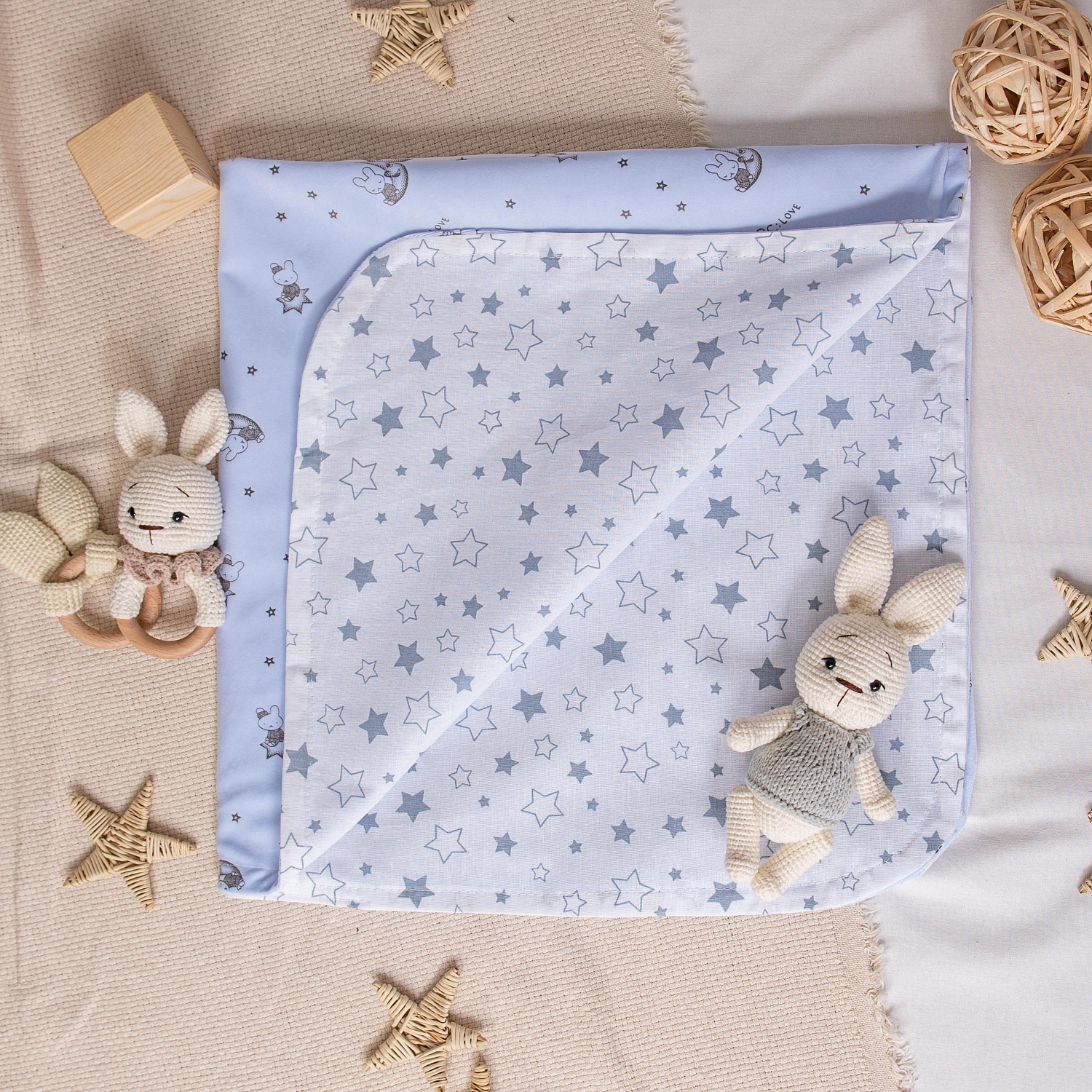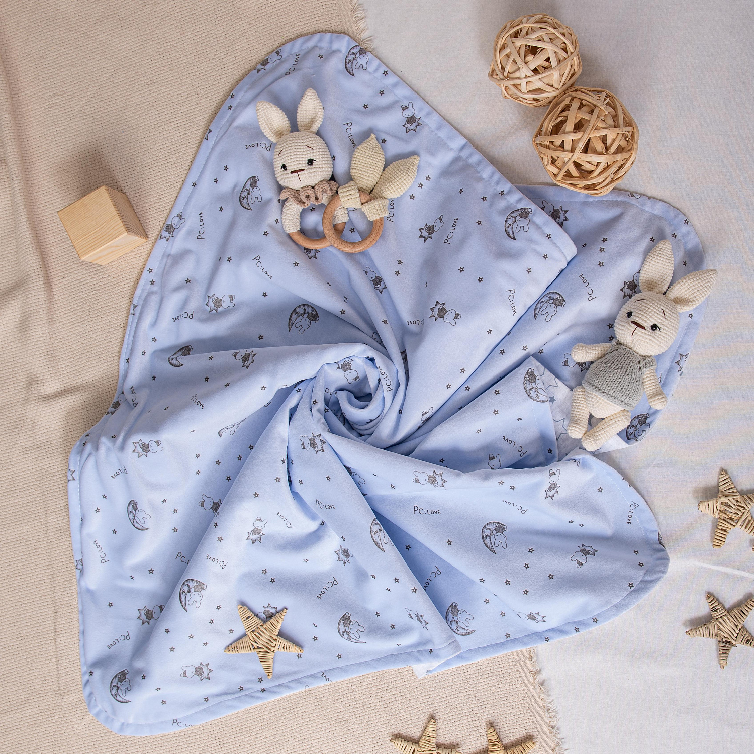 Нежный плед для новорожденного малыша малыша. Плед двухслойный. Верхний слой из бархатистого трикотажа "вельбоа" с рельефным рисунком, внутренний слой - бязь из 100% хлопка с принтом "звёздочки".