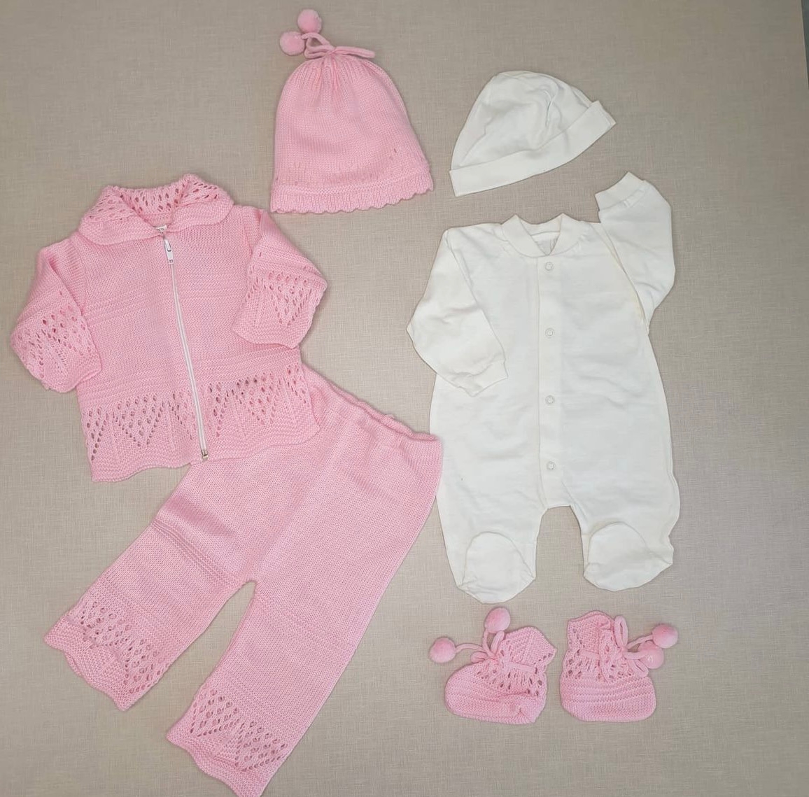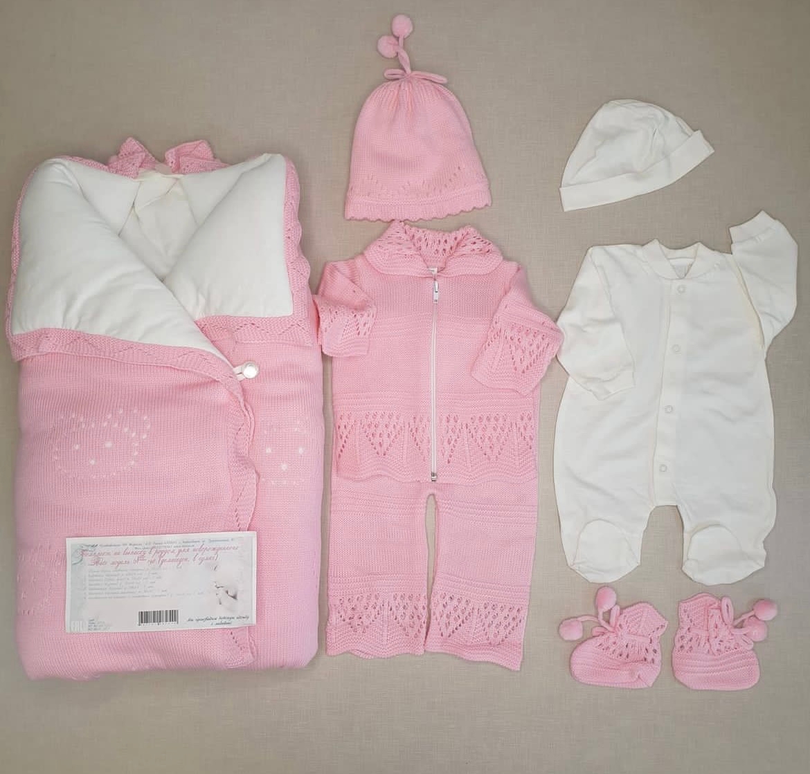 Чудесный вязанный комплект на выписку для маленькой принцессы. Богатая комплектация из 7 предметов, которая прослужит вам не один месяц.