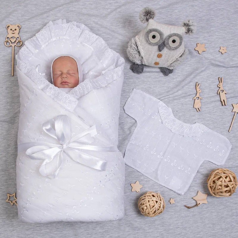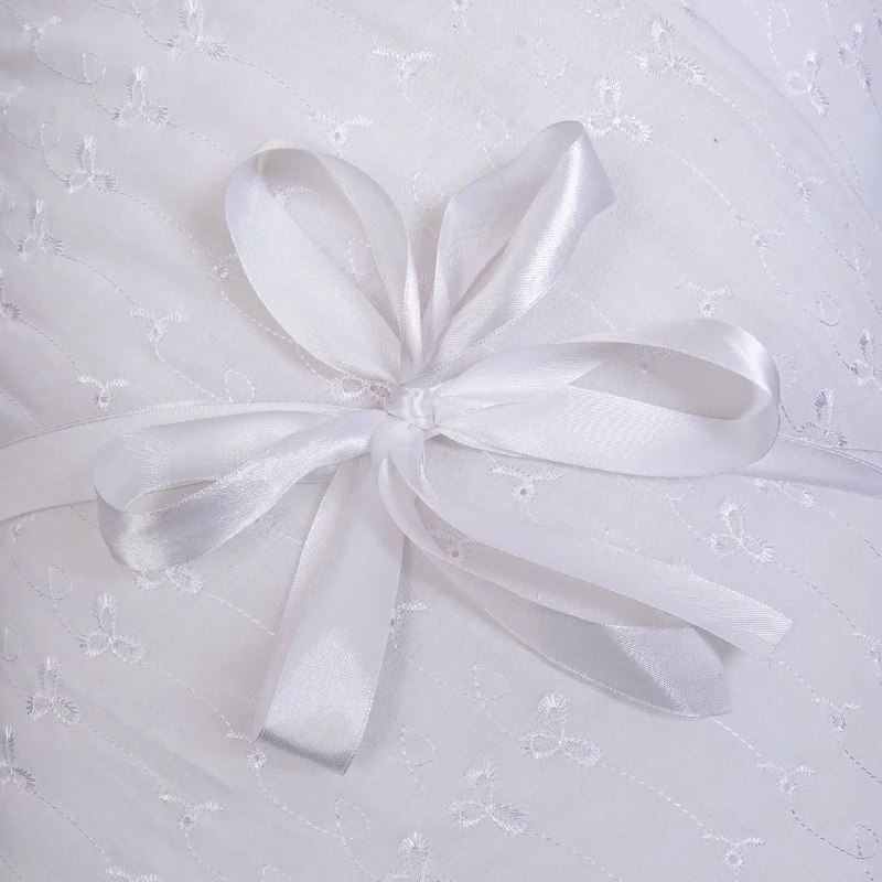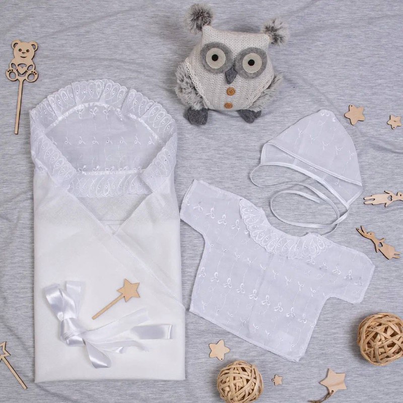 Воздушный, нежный, белоснежный комплект выполнен из шитья и украшен кружевом.