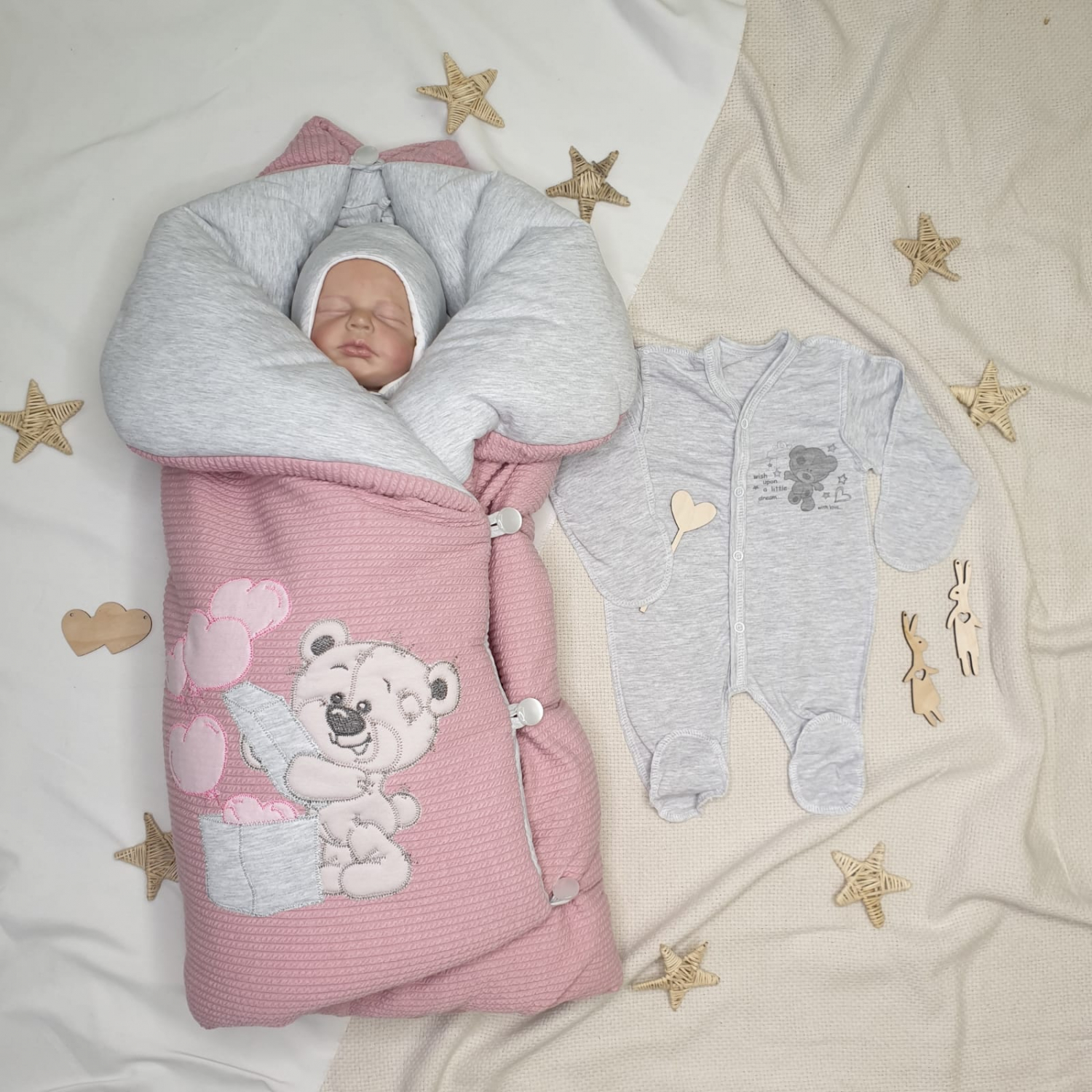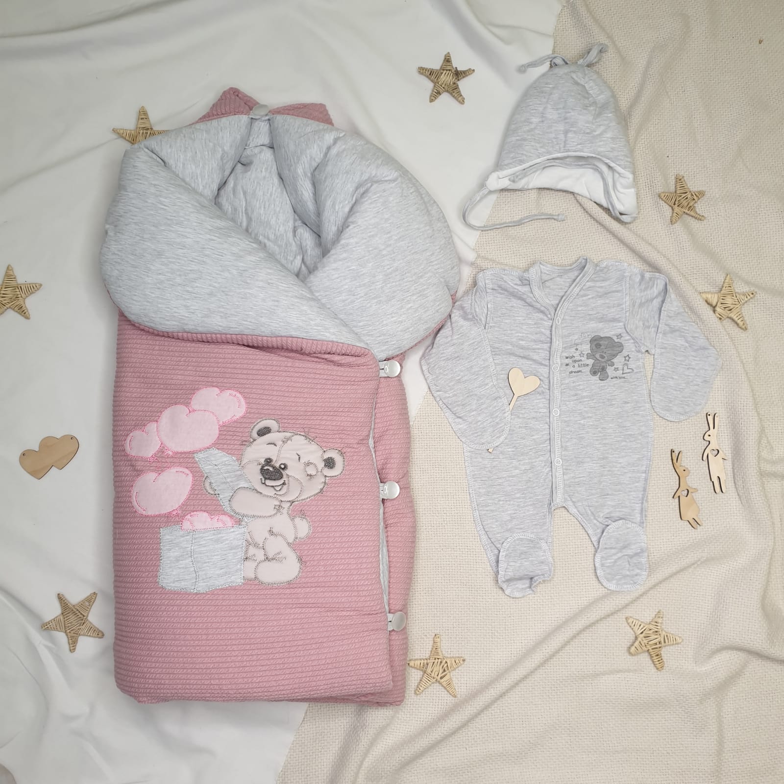 В комплекте конверт-одеяло на 4 пуговицах с милой вышивкой "мишка"