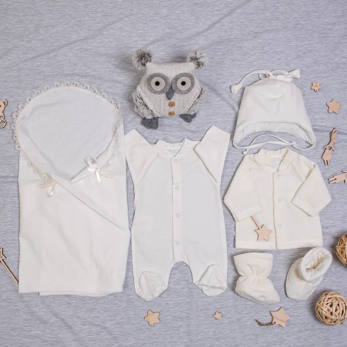 Теплый и мягкий комплект из велсофта с красивой вышивкой. В комплекте очень богатая комплектация из 6 ти предметов: одеяло, кофта, теплая шапка, пинетки, слип и уголок с турецким кружевом.