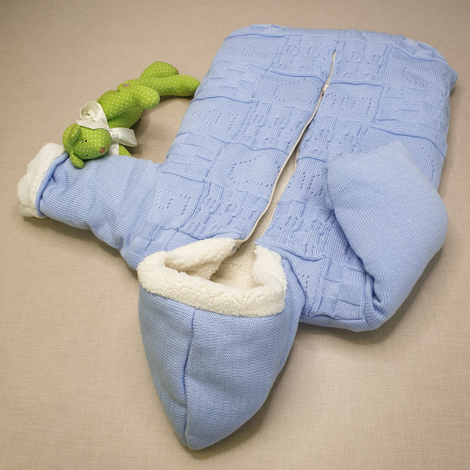 Красивое рельефное вязаное полотно голубого цвета снаружи и мягкая молочная мерлушка внутри, делают этот конверт теплым, а удобная молния поможет быстро одеть конвертик, ведь малыши не любят долго одеваться.
