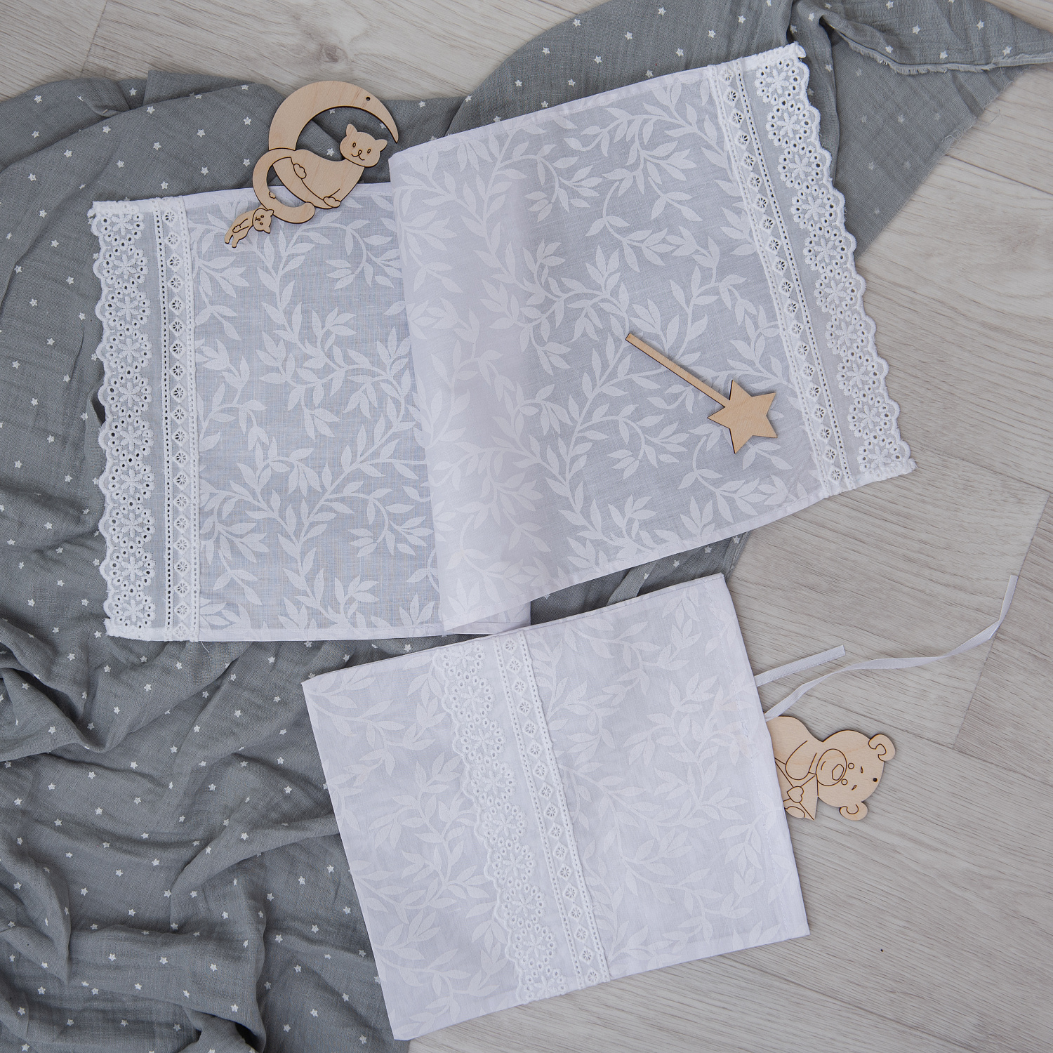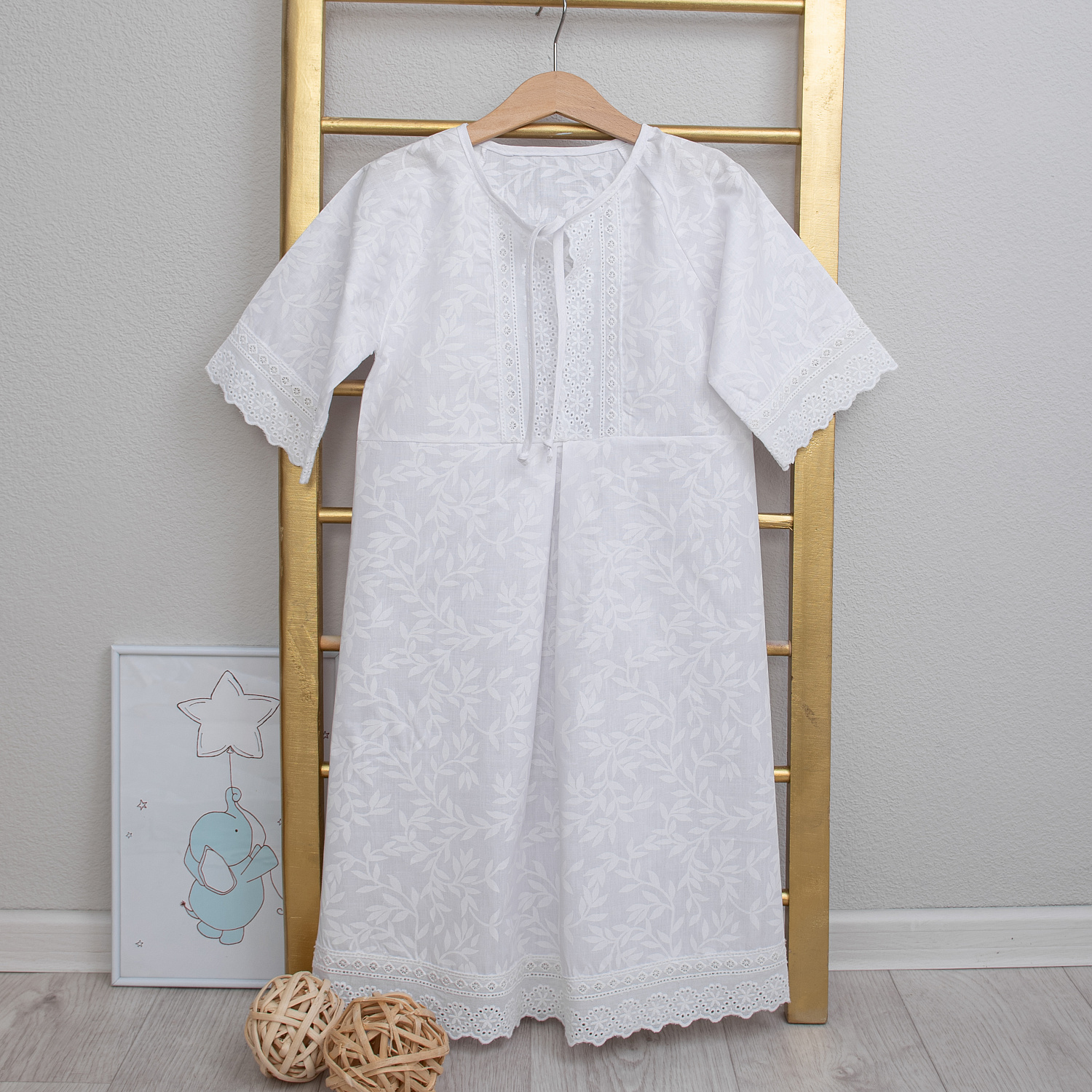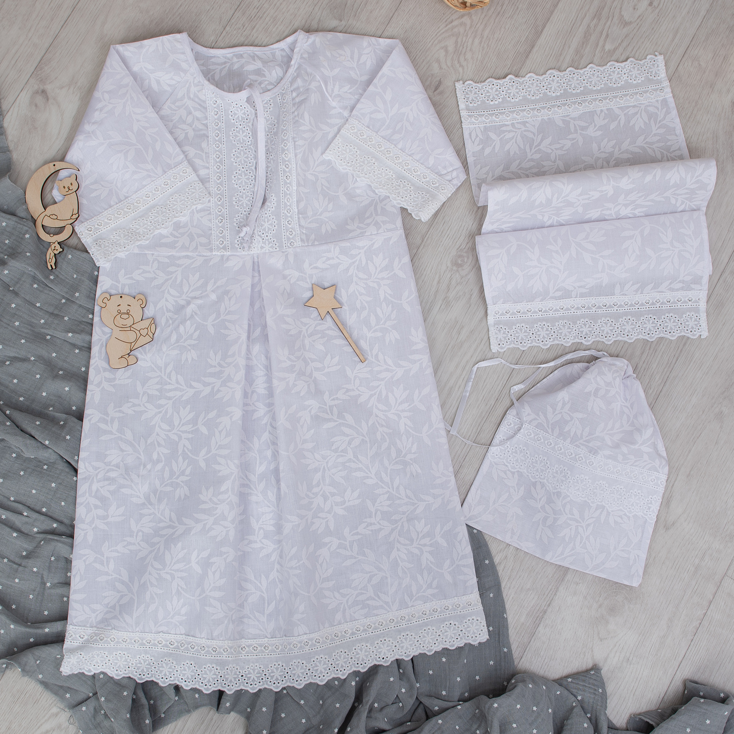которые включают в себя все самое необходимое - это рубашечка с красивой вышивкой, отделанное хлопковым кружевом, рушник, и в комплекте